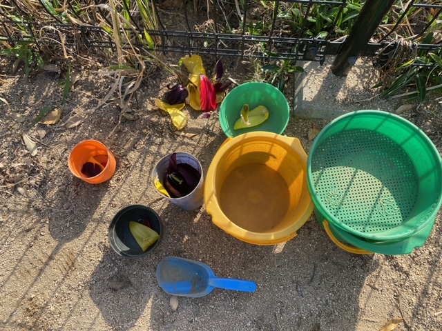 大切そうに花びらを集めたり、グラデーションになっている花びらをジーっと観察したりする子もいました。五感でチューリップを感じた後は・・・おままごとに使ったり、虫を捕獲するために使ったりと大活躍でしたよ😄