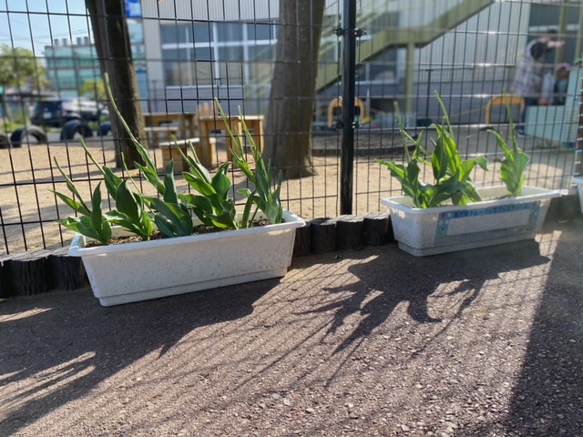 チューリップは、花が落ちる前に花を摘むことで球根に栄養がたくさん蓄えられ大きな球根になるそうです。その球根を植えると、翌年もきれいな花を咲かせてくれるのです。そこで、今年もチューリップの花もぎをしましたよ❗