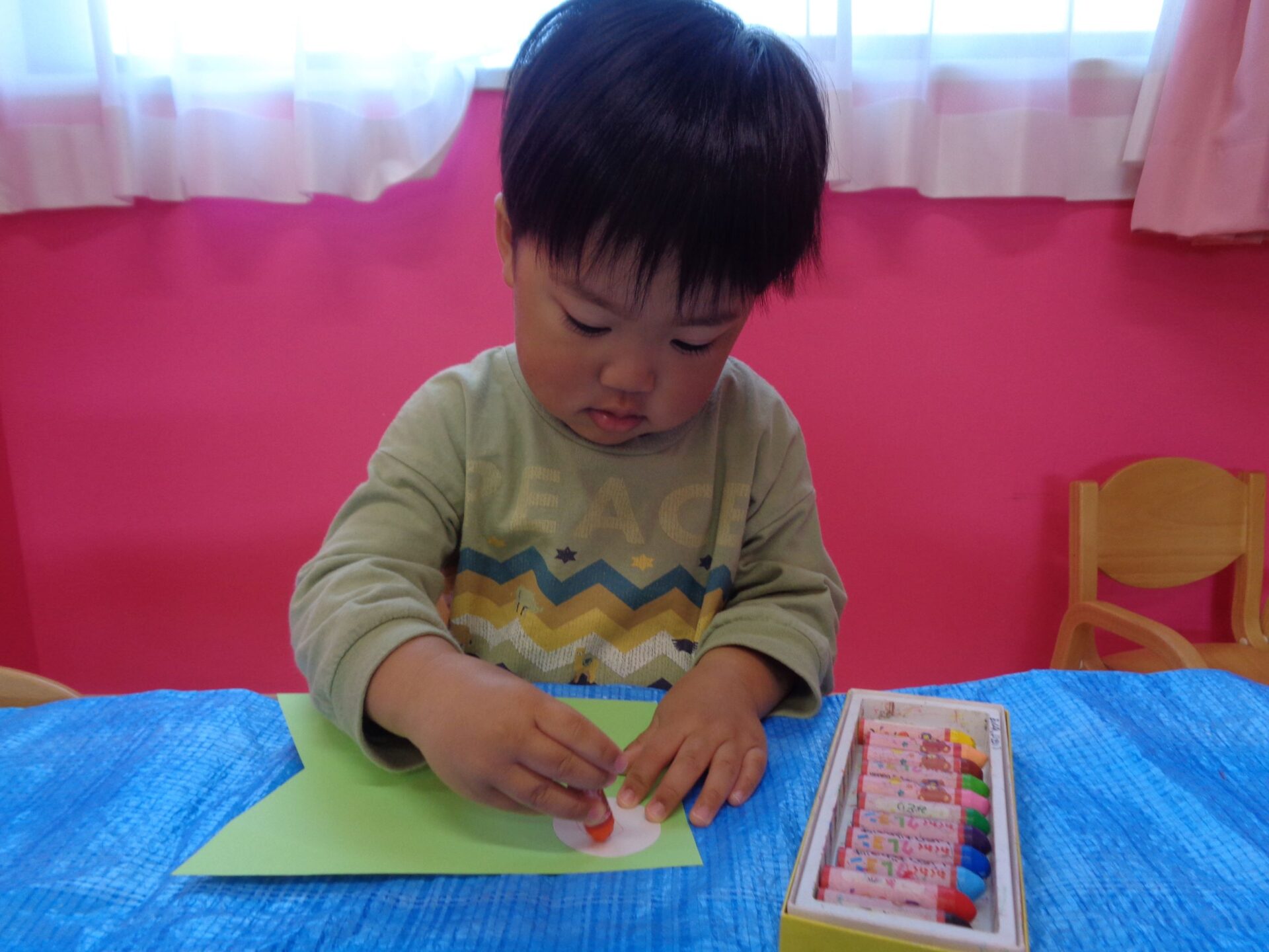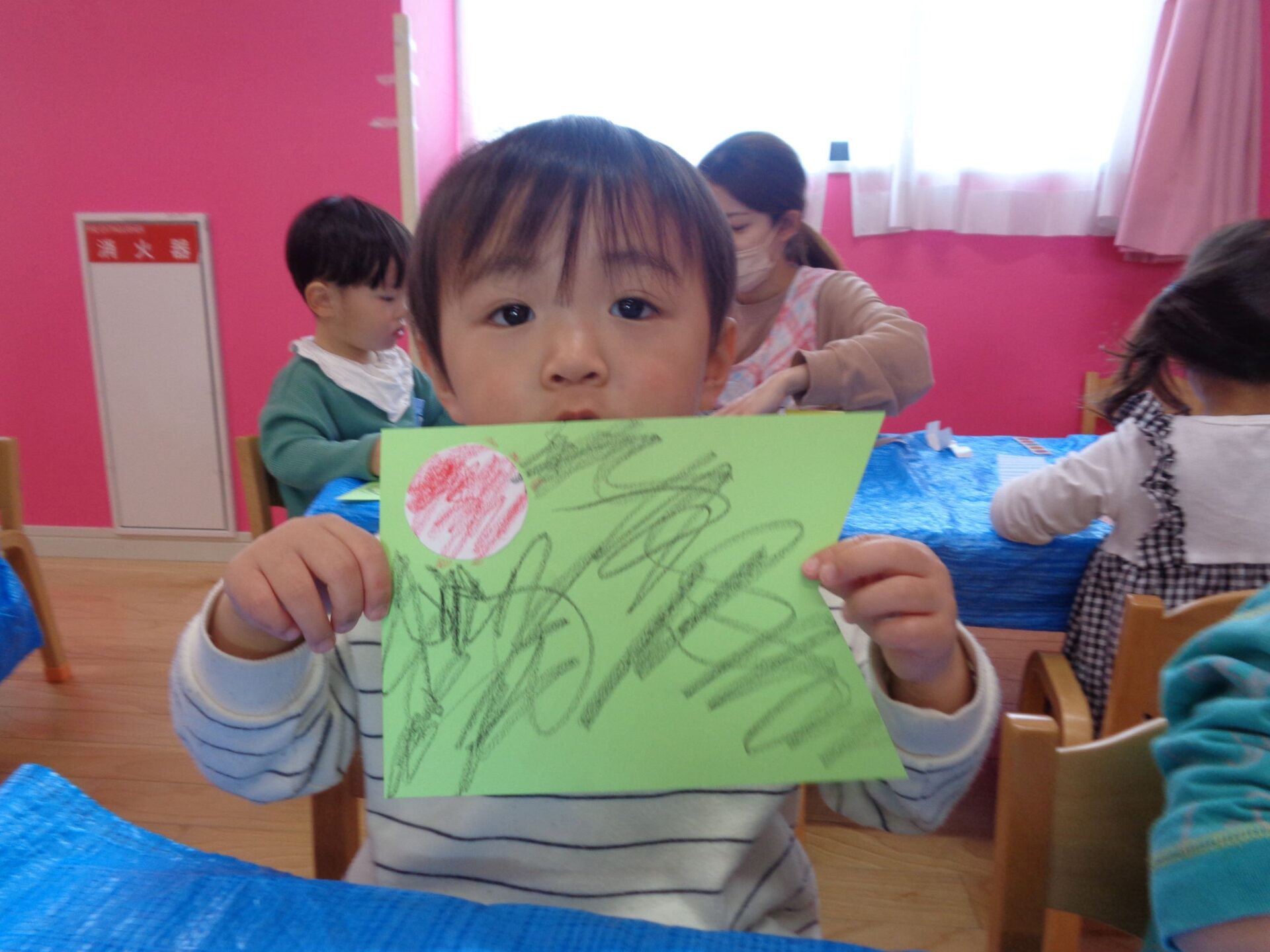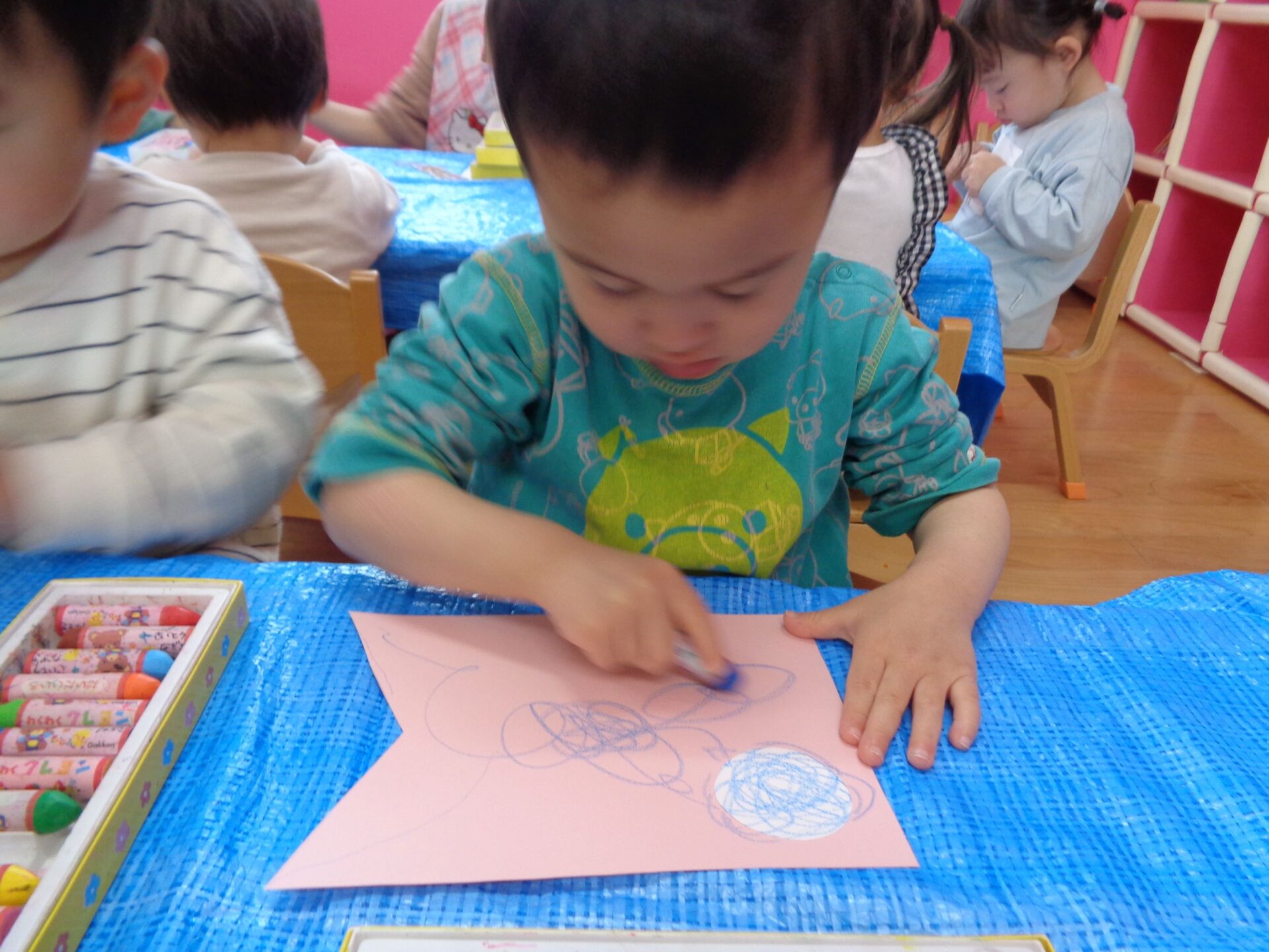 好きなクレヨンを手に取り、自由にクルクルとこいのぼりに模様を描いていきました。目の中も上手に丸を描いていた子どもたちでした☆描き終わると「じゃーーん!!」と保育者に見せてくれましたよ😊
