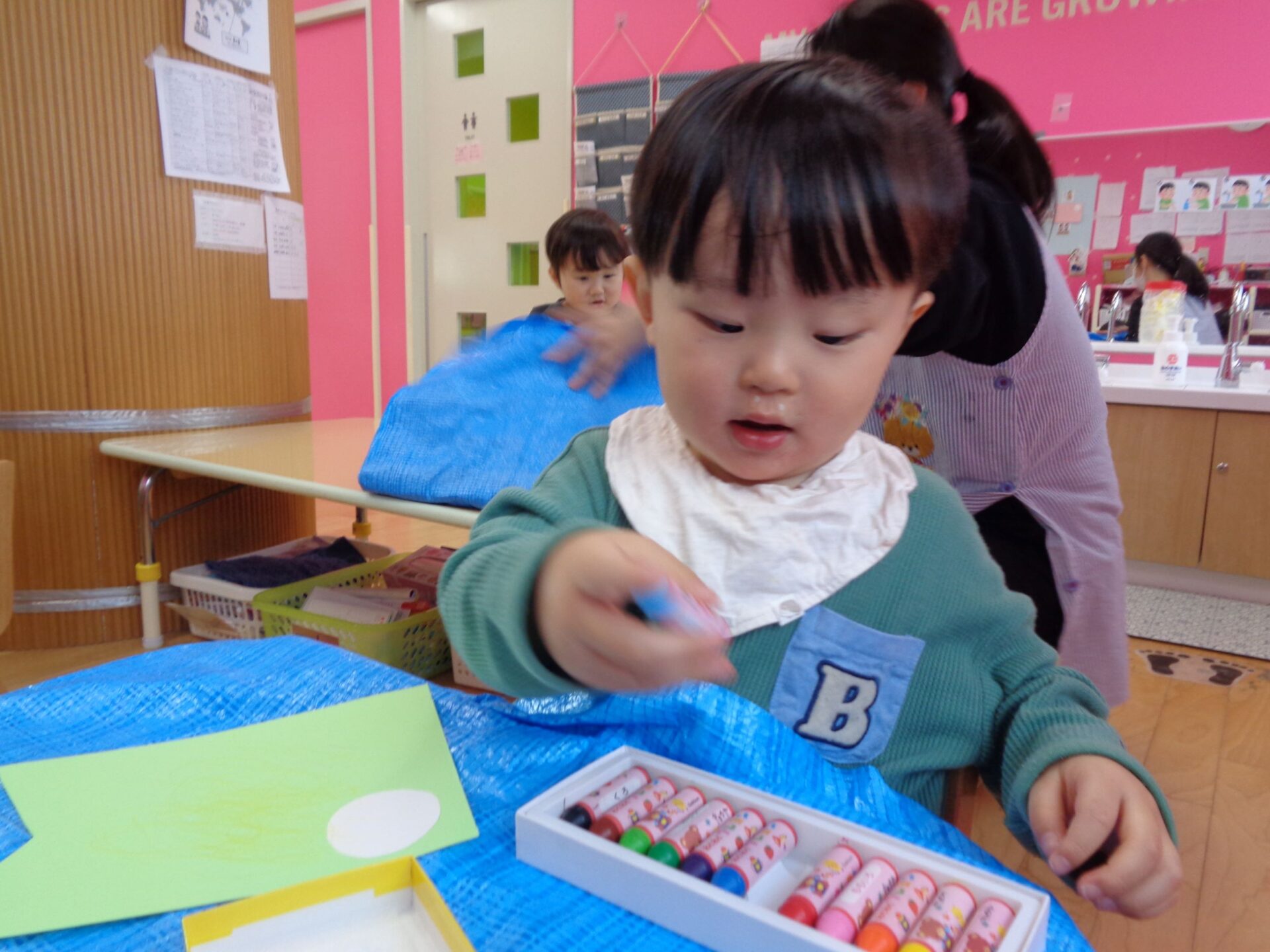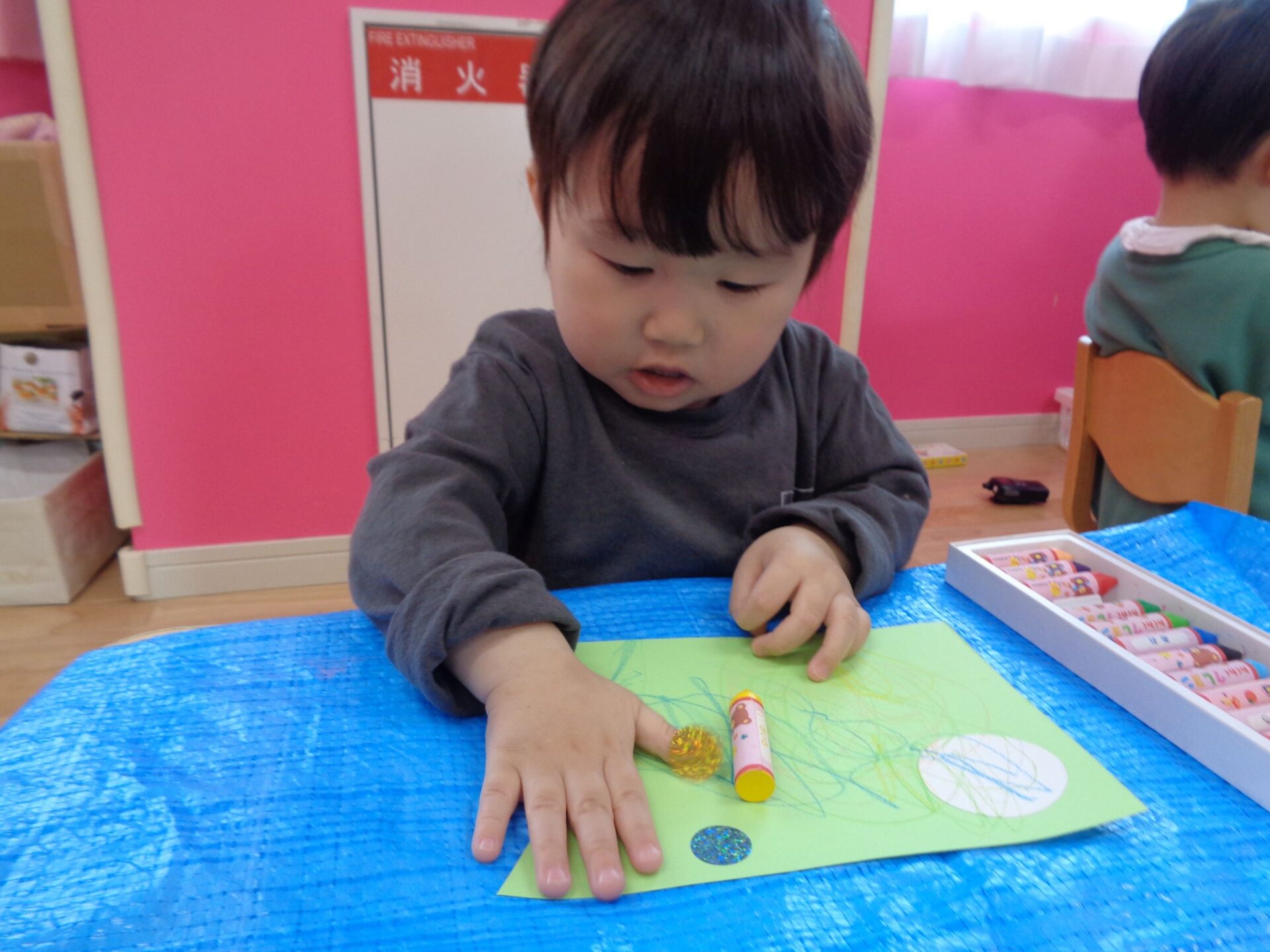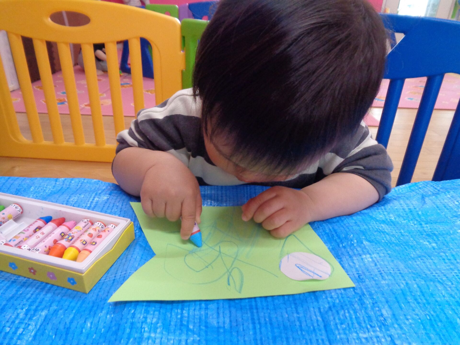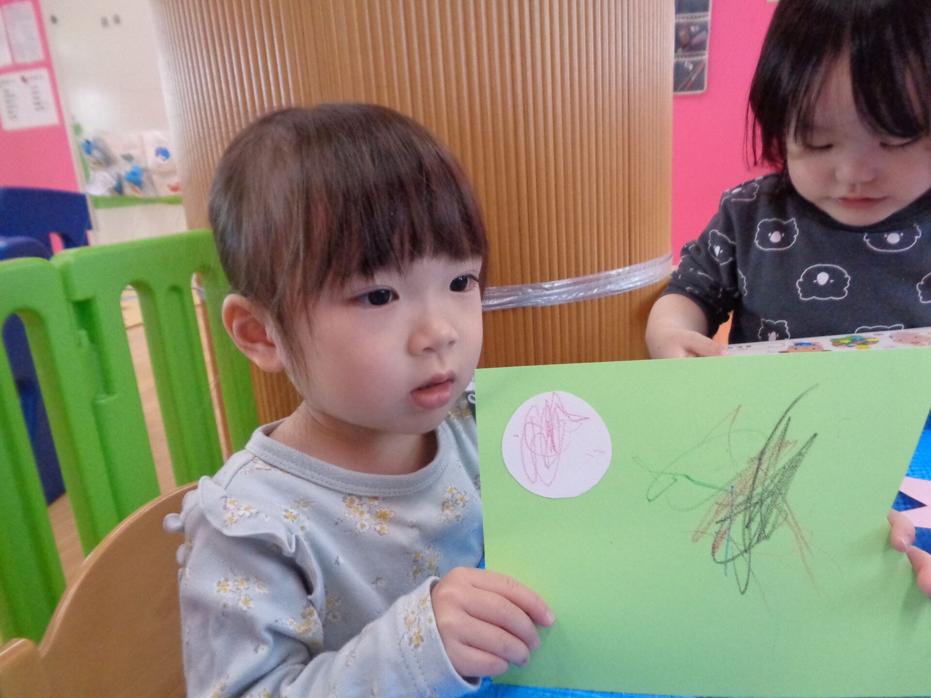 好きなクレヨンを手に取り、自由にクルクルとこいのぼりに模様を描いていきました。目の中も上手に丸を描いていた子どもたちでした☆描き終わると「じゃーーん!!」と保育者に見せてくれましたよ😊