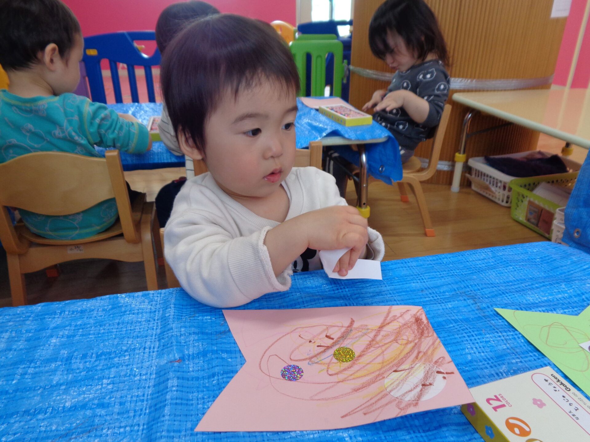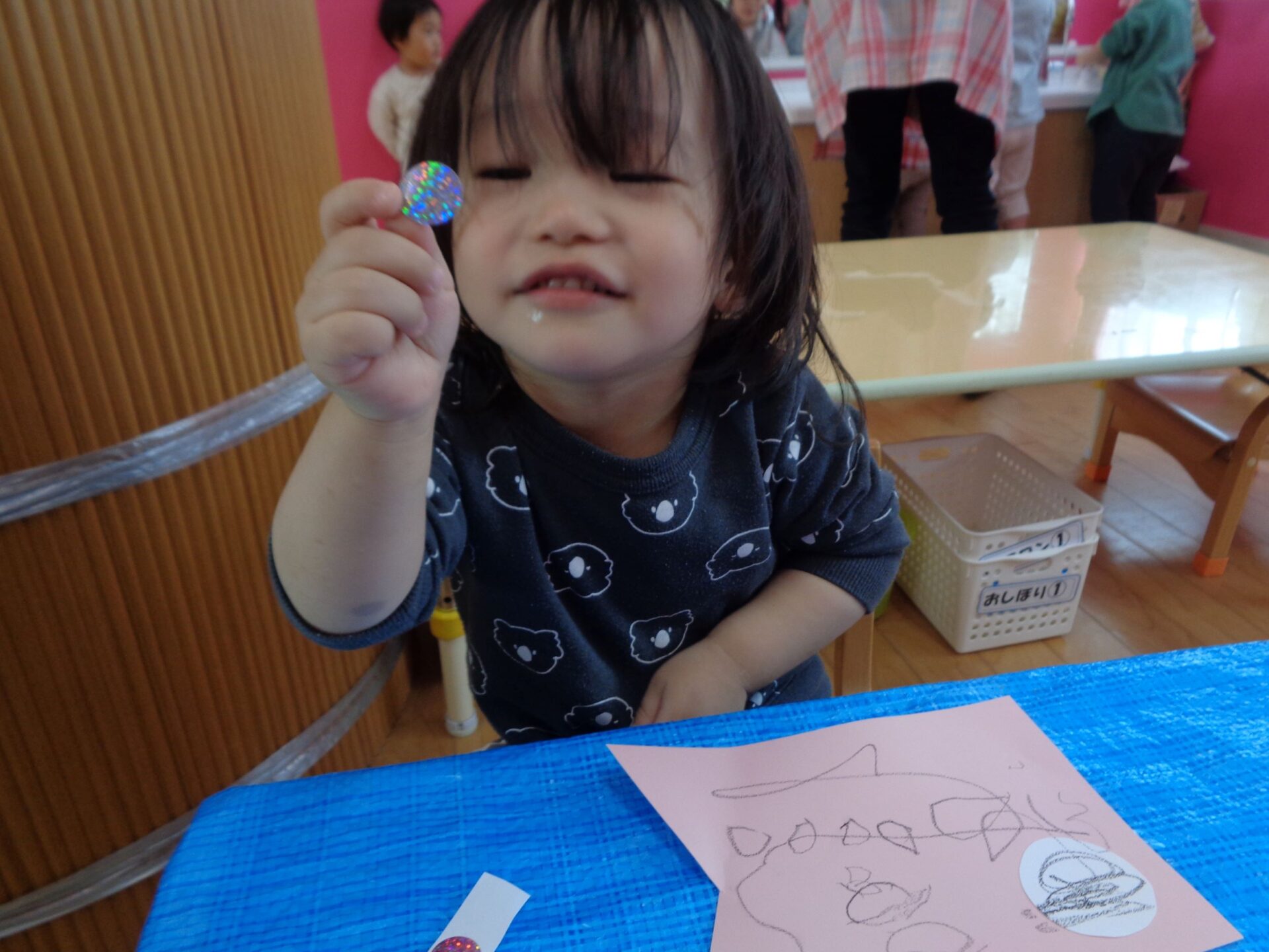 お絵描きの後はシール貼りをしました。キラキラの丸シールを見ると子どもたちの目もキラキラに✨シールを受け取ると真剣な表情でシールをはがしていましたよ!はがすのが少し難しい子には手を添え一緒にはがしてみたり、少しはがしたシールを渡し自分ではがしてみたりと一人一人に合った方法でシール貼りを楽しみました♪目の中にシールを貼るお友だちがいたり、縦や横に並べて貼る子がいたりと個性豊かなこいのぼりが完成しましたよ!