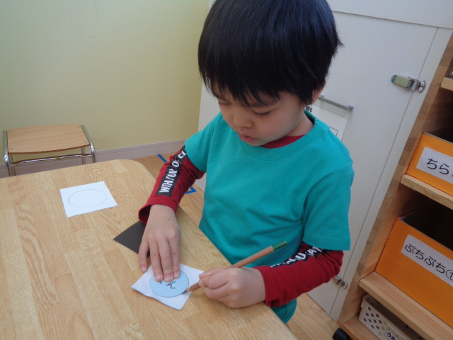 型紙がずれないように一生懸命押さえて線を書く子どもたちでした!