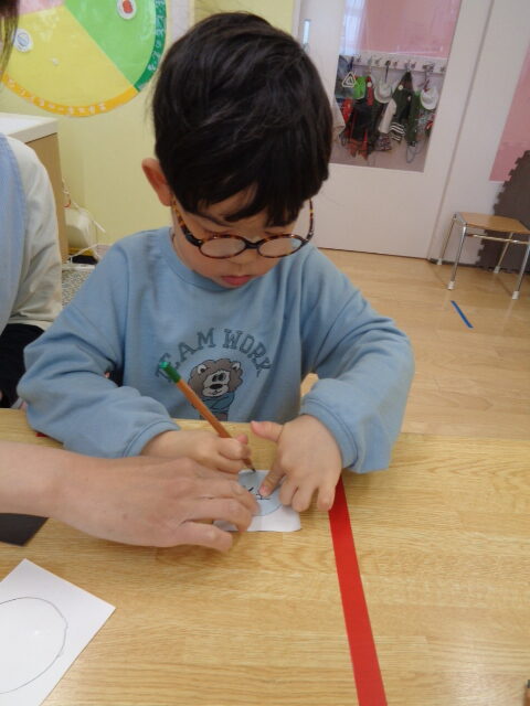 鉛筆の持ち方を伝え、みんなで確認してから線を書きました。