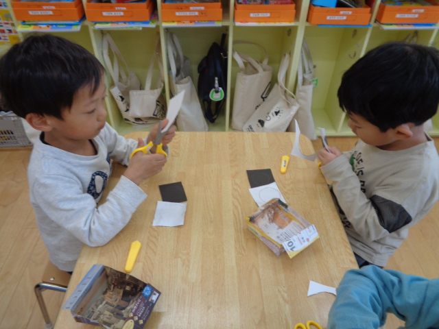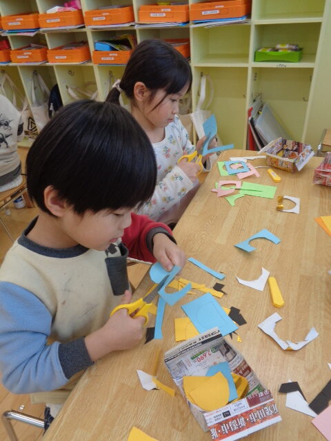 好きな色の画用紙を選び、うろこの線に沿ってはさみで切りました。