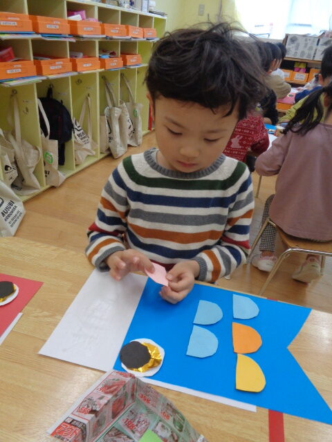保育者の見本を見ながらこいのぼりの向きを決め、目を順番に貼っていた子どもたちでした。