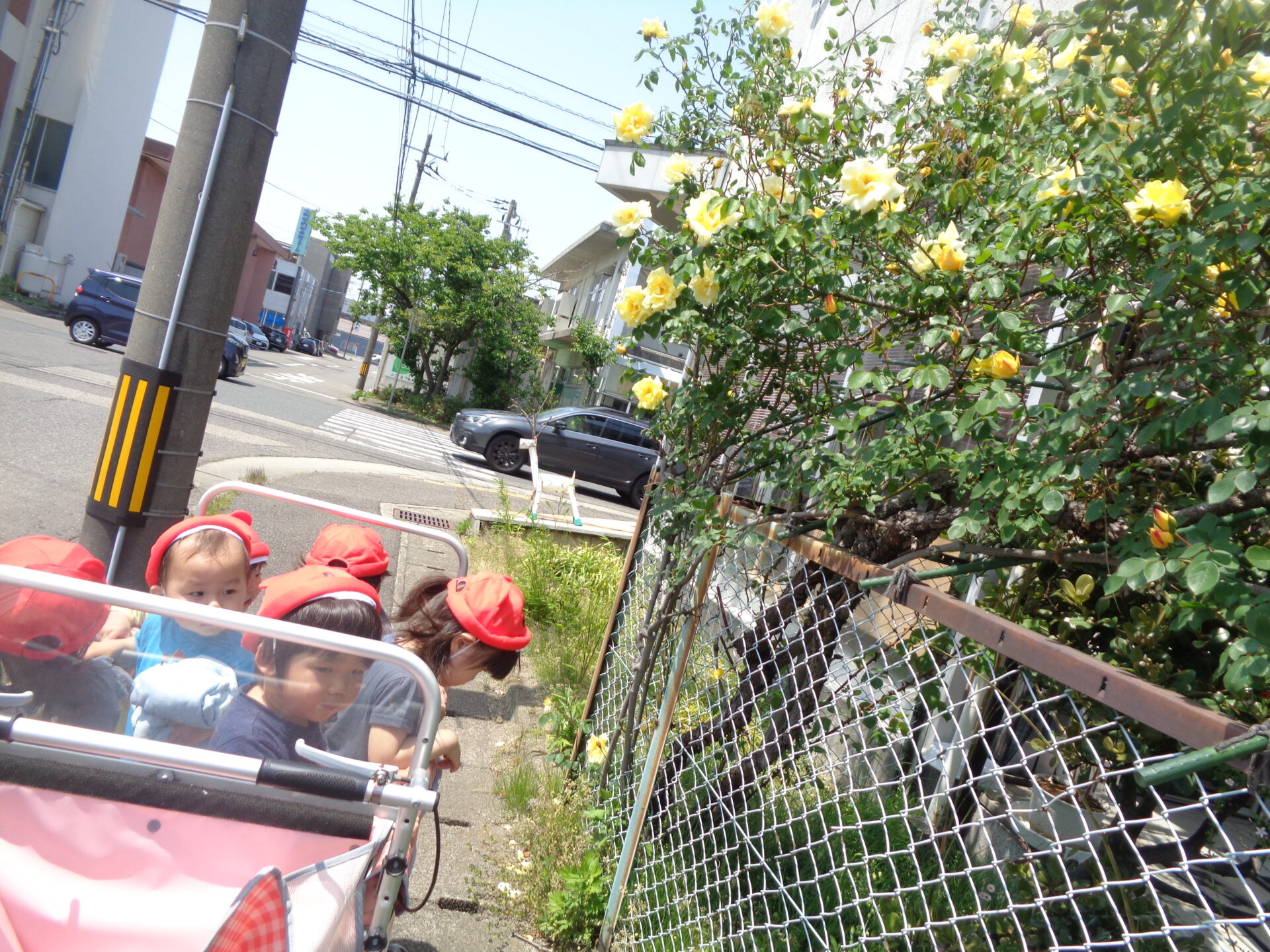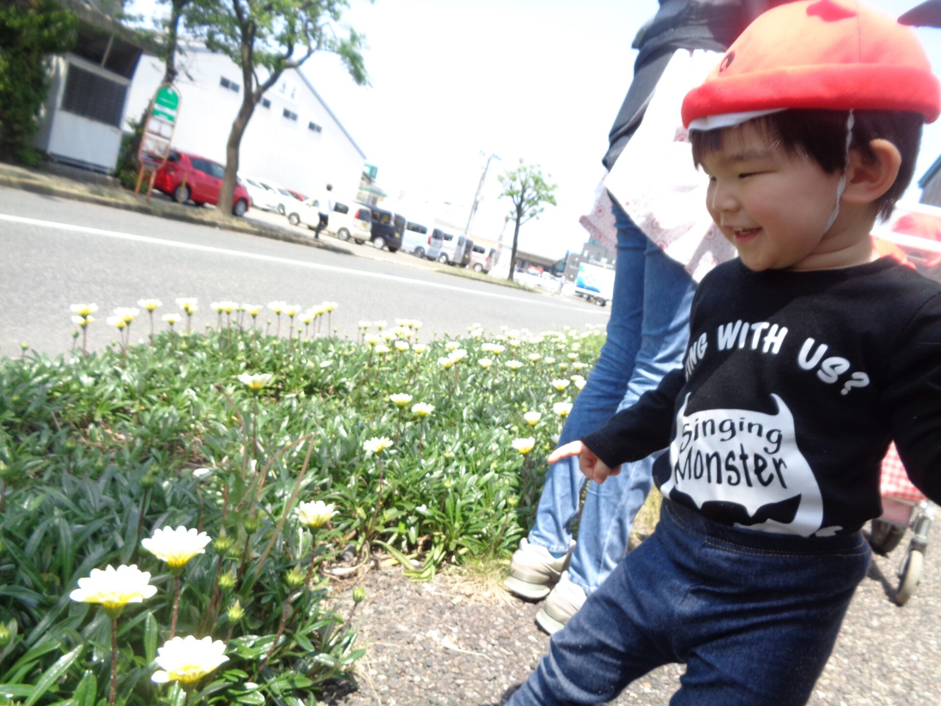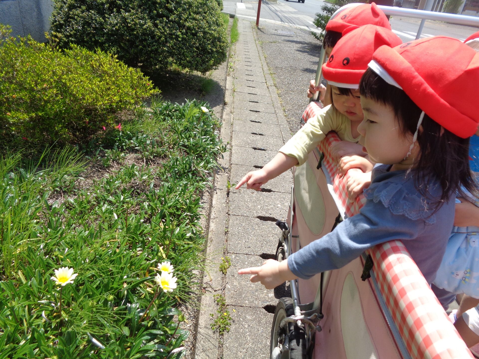 お花を見つけたり、お歌を歌いながら歩いたり、カートに揺られてまったり気分になったり😊心地よい風を感じて気持ちも爽快な子ども達です。