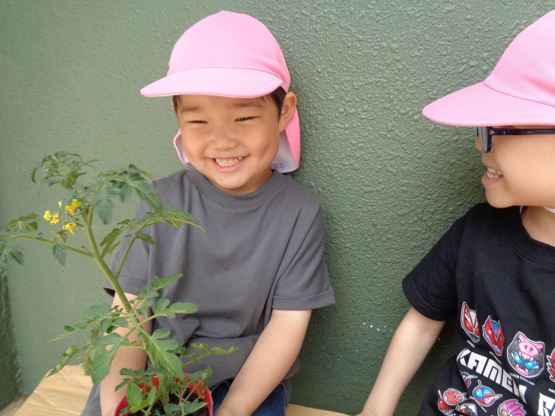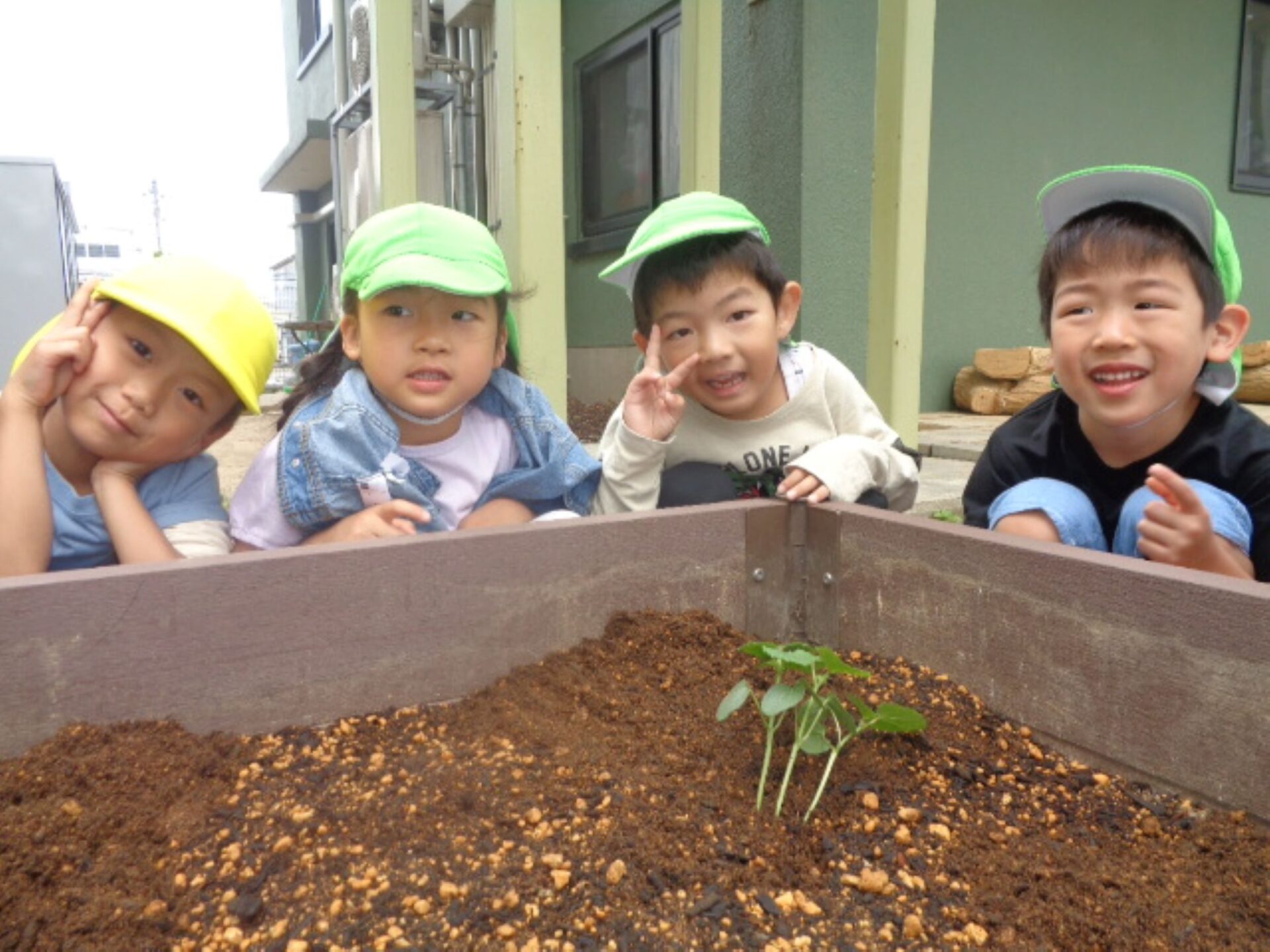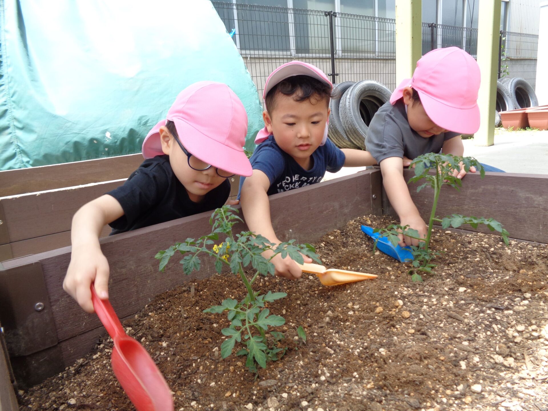 今年はゆき組(3歳児)がきゅうり🥒、そら組(4歳児)がミディアムトマト🍅、つき組(5歳児)がオクラの苗を植えました。