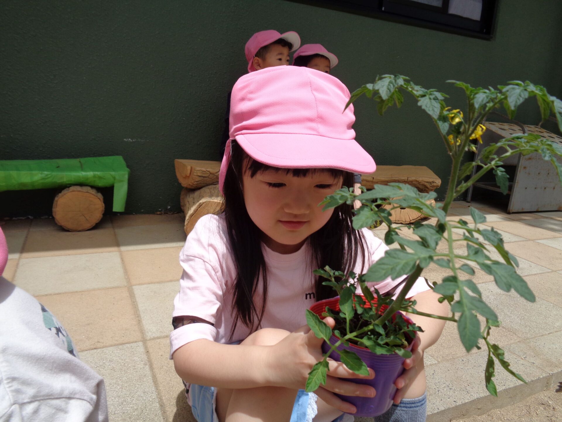 すると他のお友達も集まってきて、「あ!こっちにもちっちゃいきゅうり🥒がある~!」「ふたつもあるよ!」「緑のトマトも出来てきてるー!!と観察会が始まっていました🔍✨