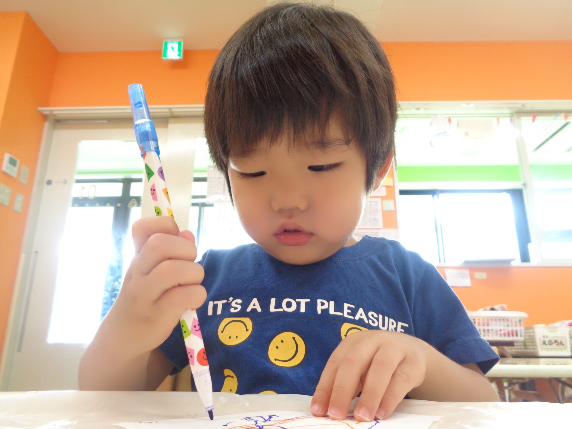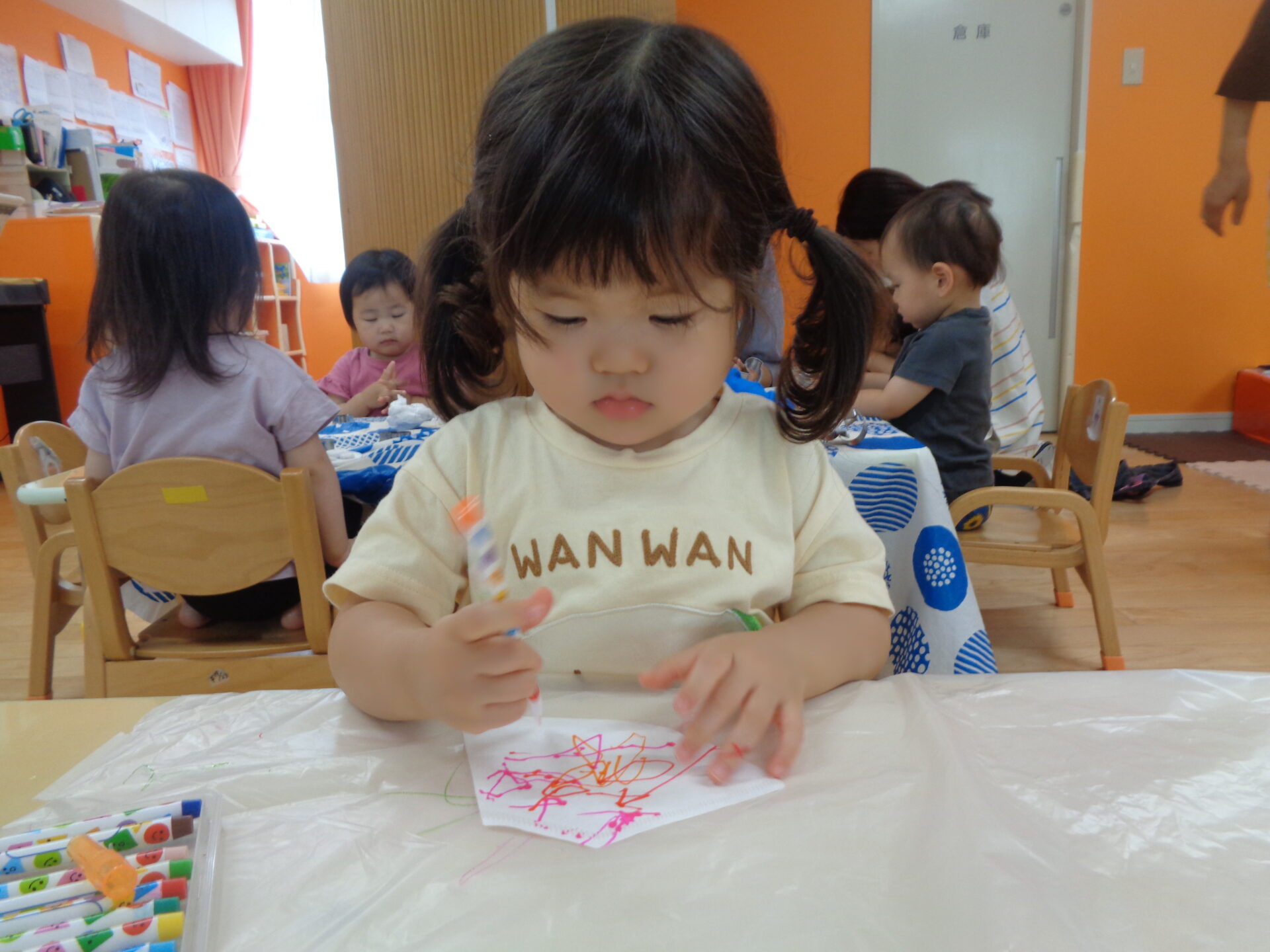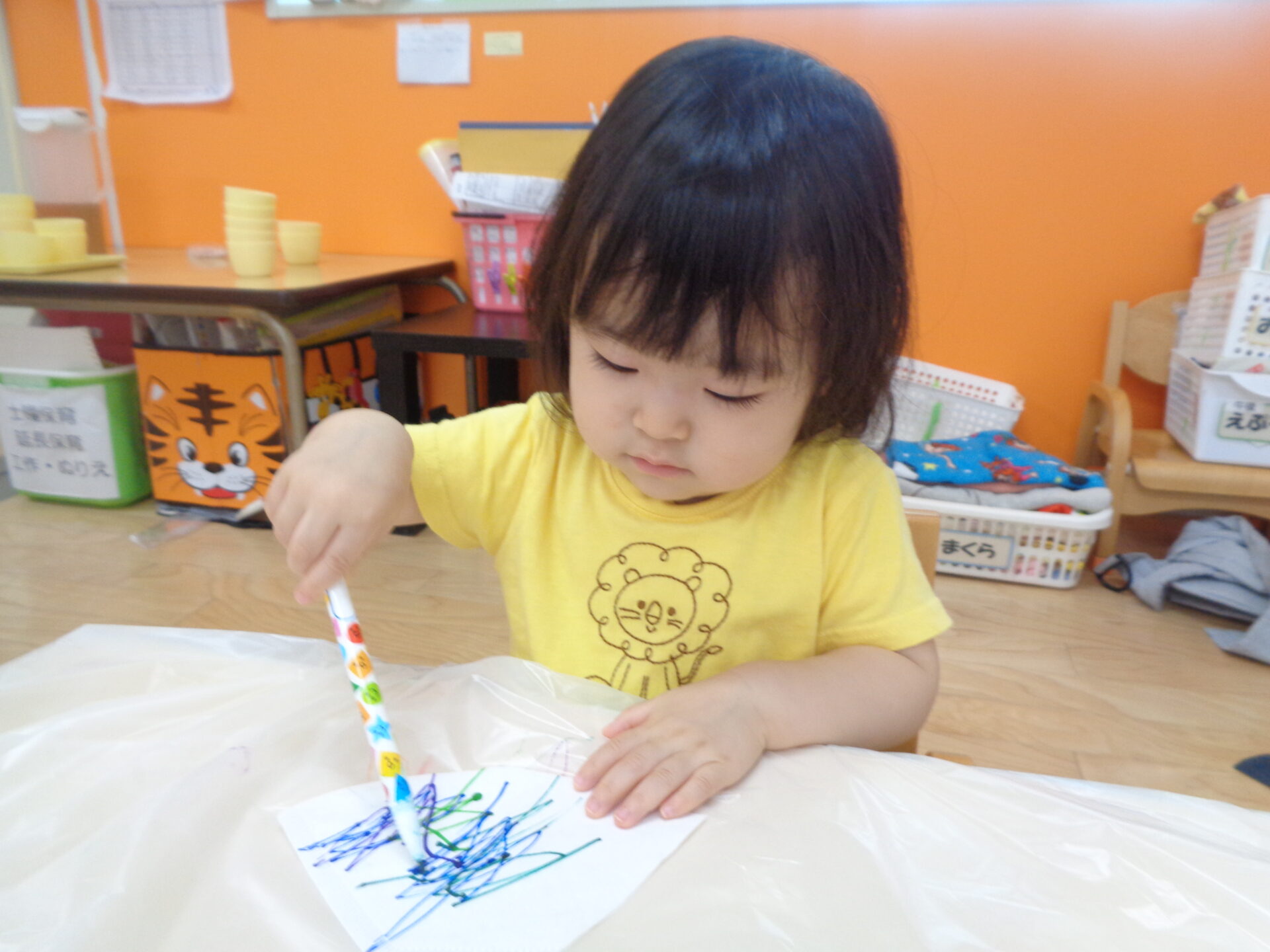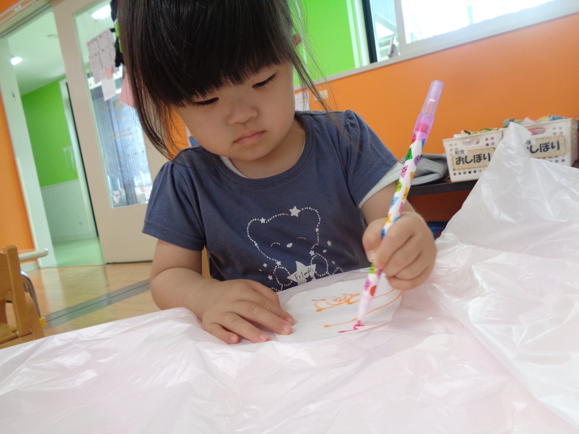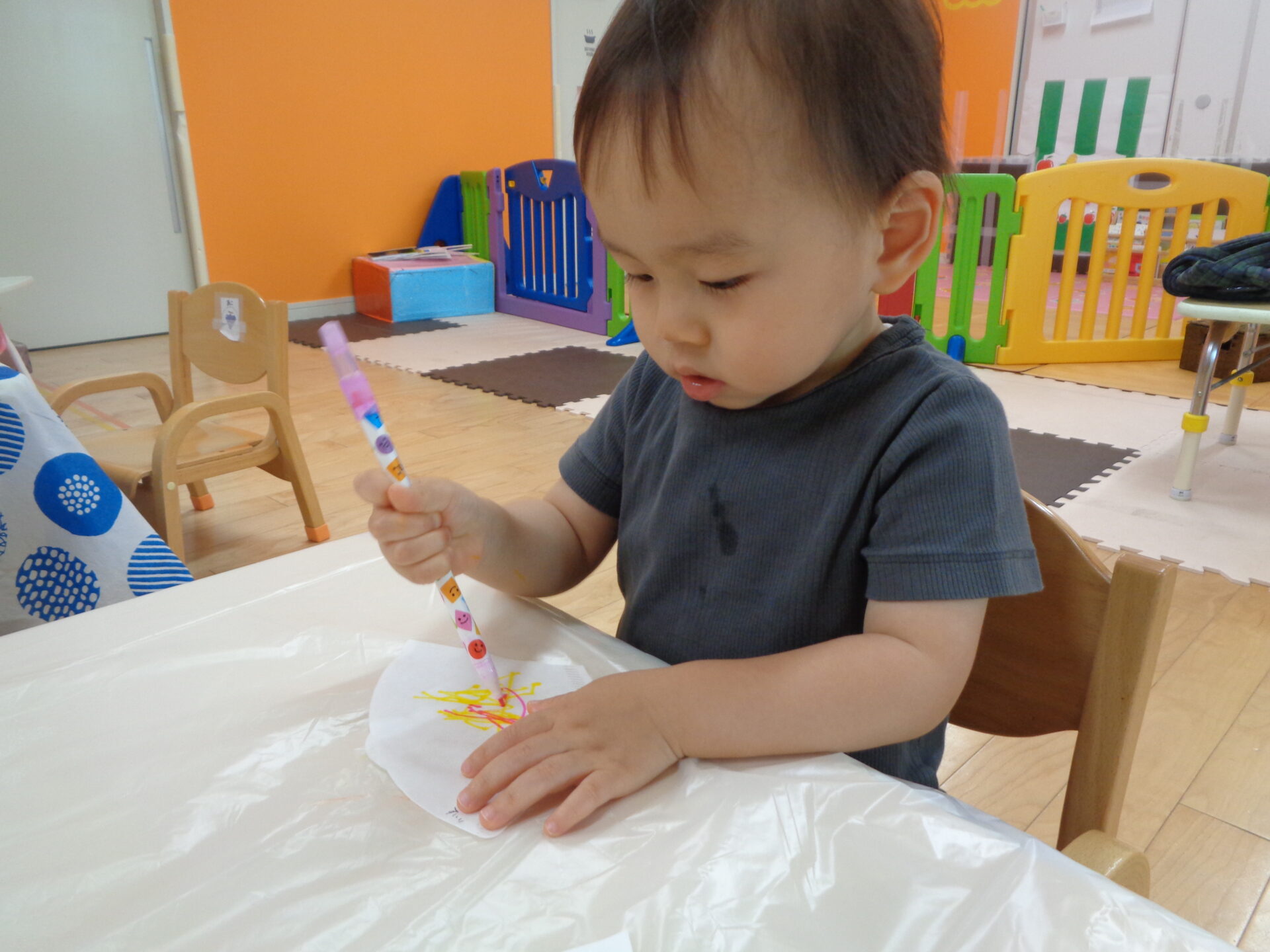 コーヒーフィルターや水性ペンに初めて触れるお友だちも多く始める前から興味津々な様子。