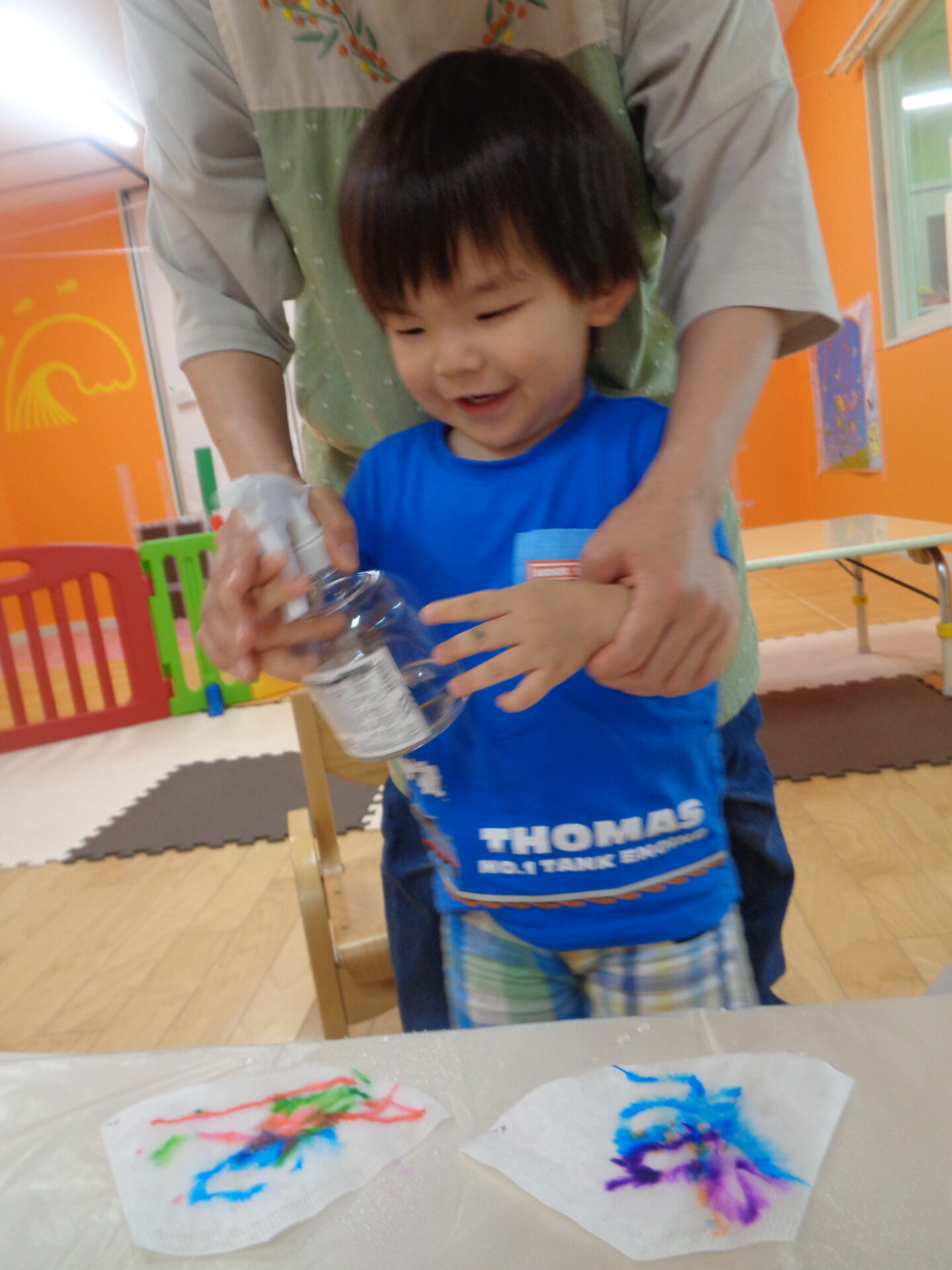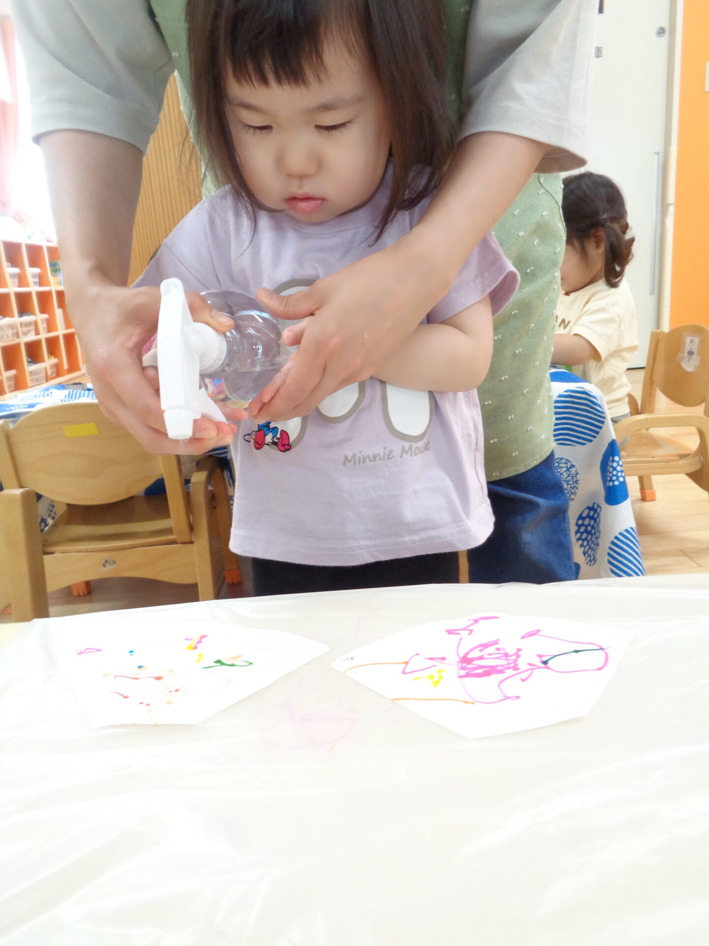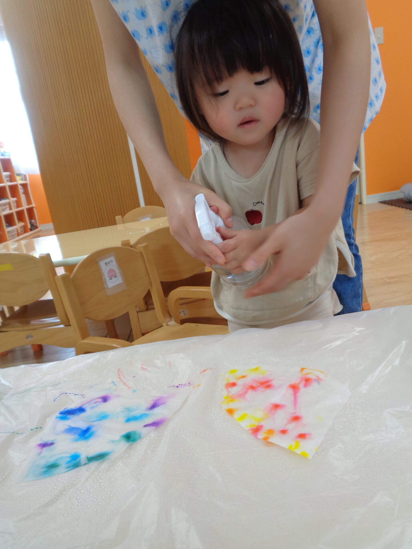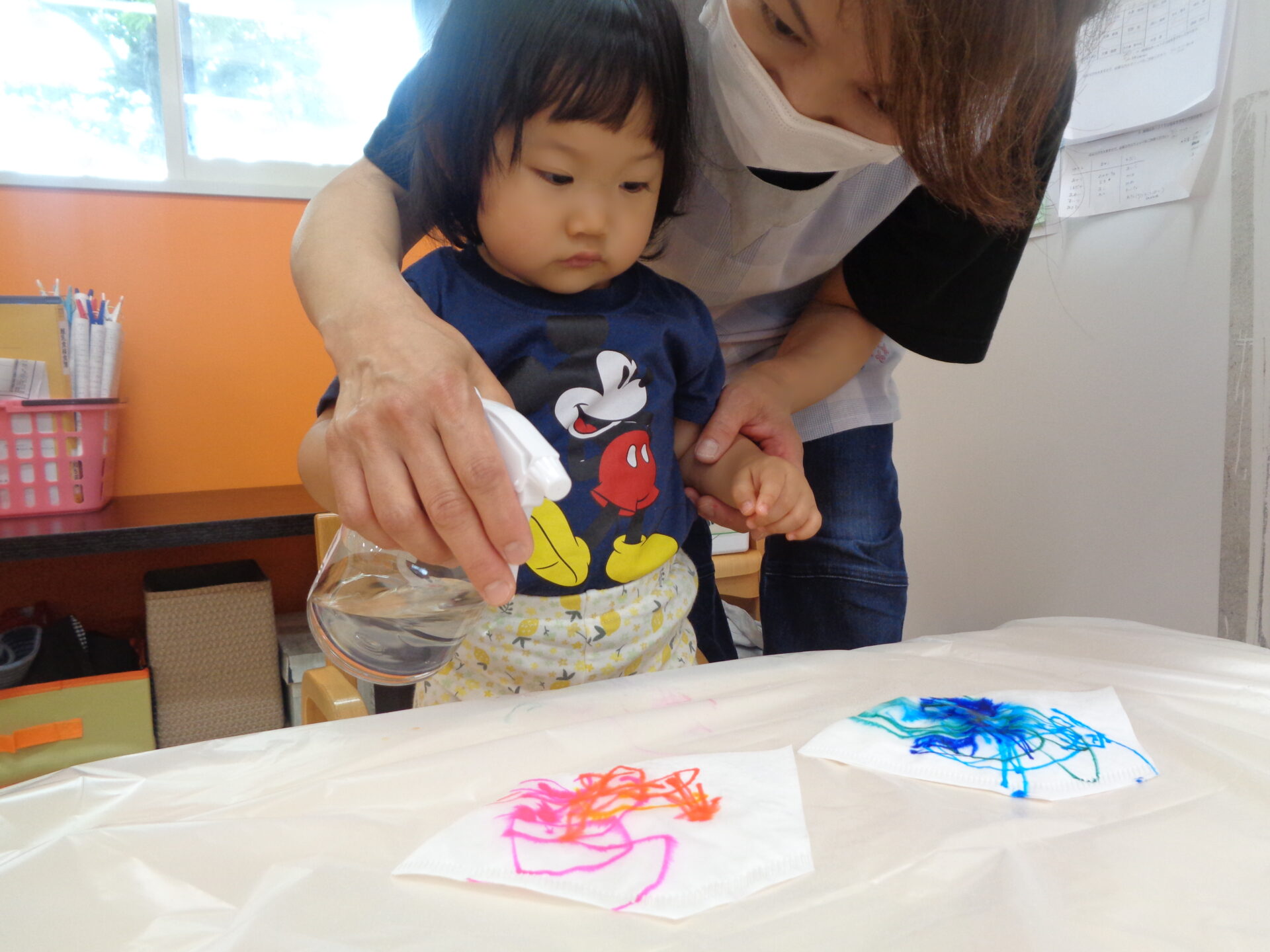 霧吹きは保育者が手を添えて手伝いながらも子ども達が自分で挑戦し、にじむ様子を近くで体験できるようにしました。