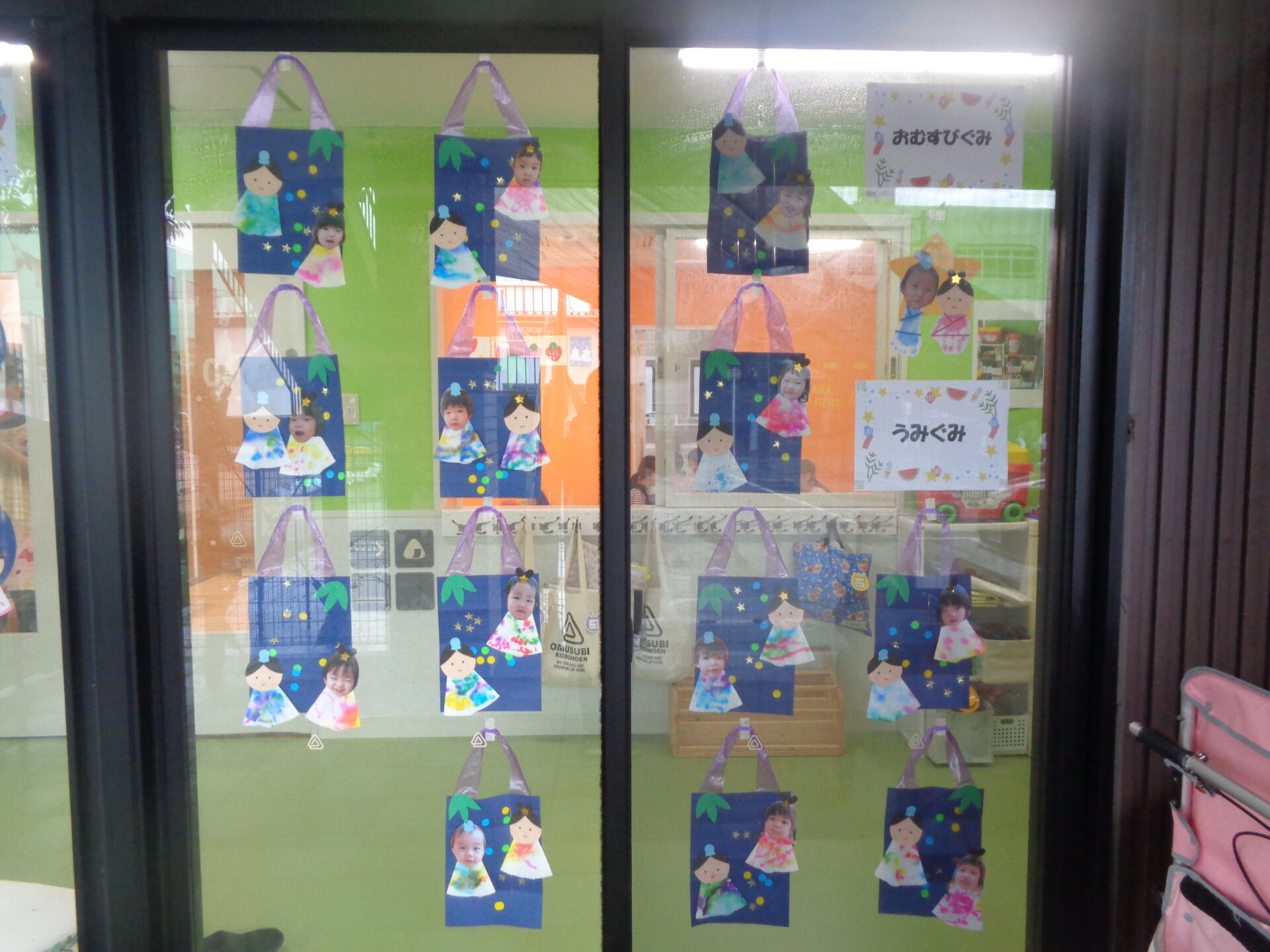 完成した作品はうみ組前の窓に飾っています。また、七夕の日に持ち帰りますのでお家でも飾ってみてください😊💕
