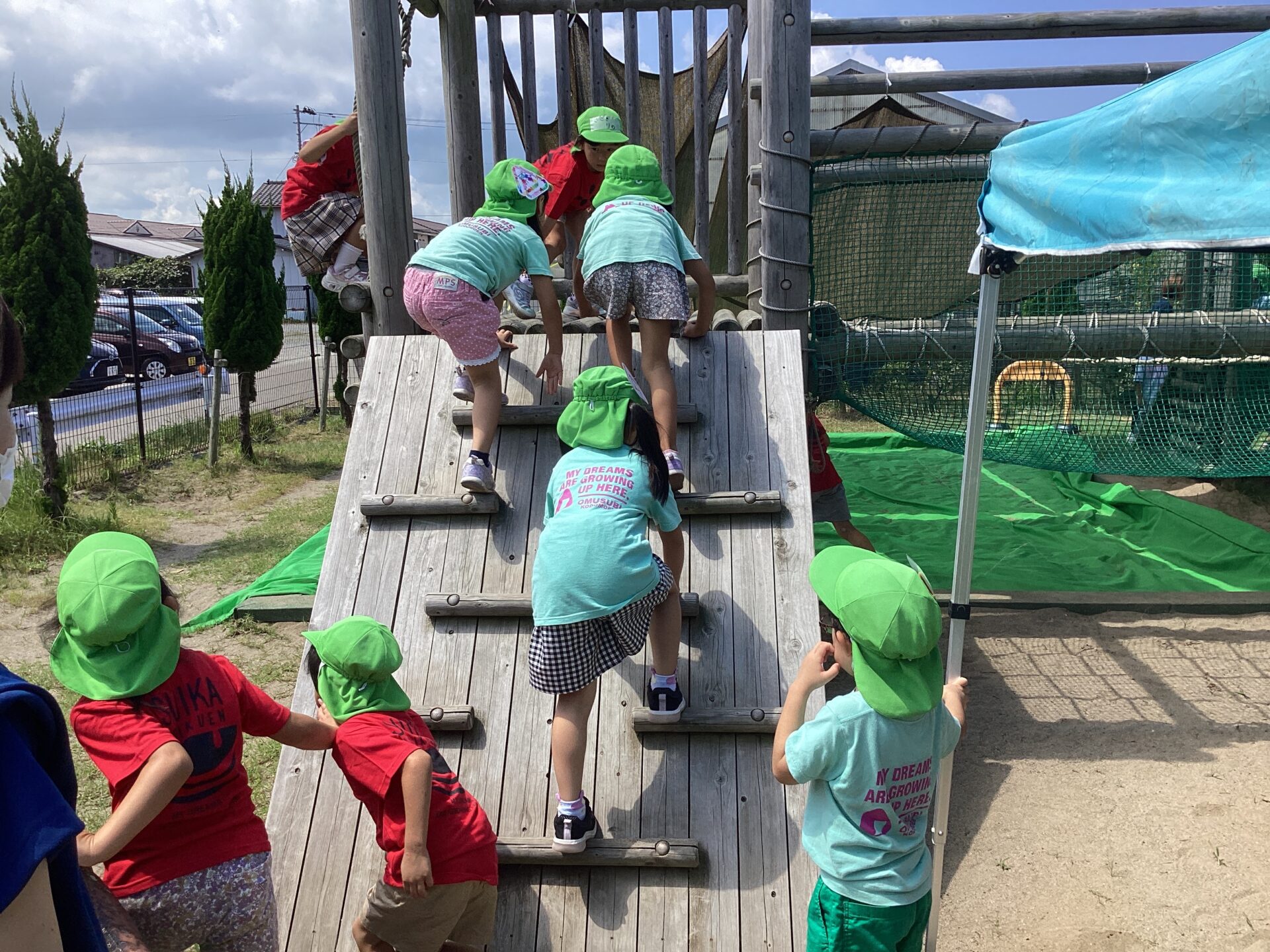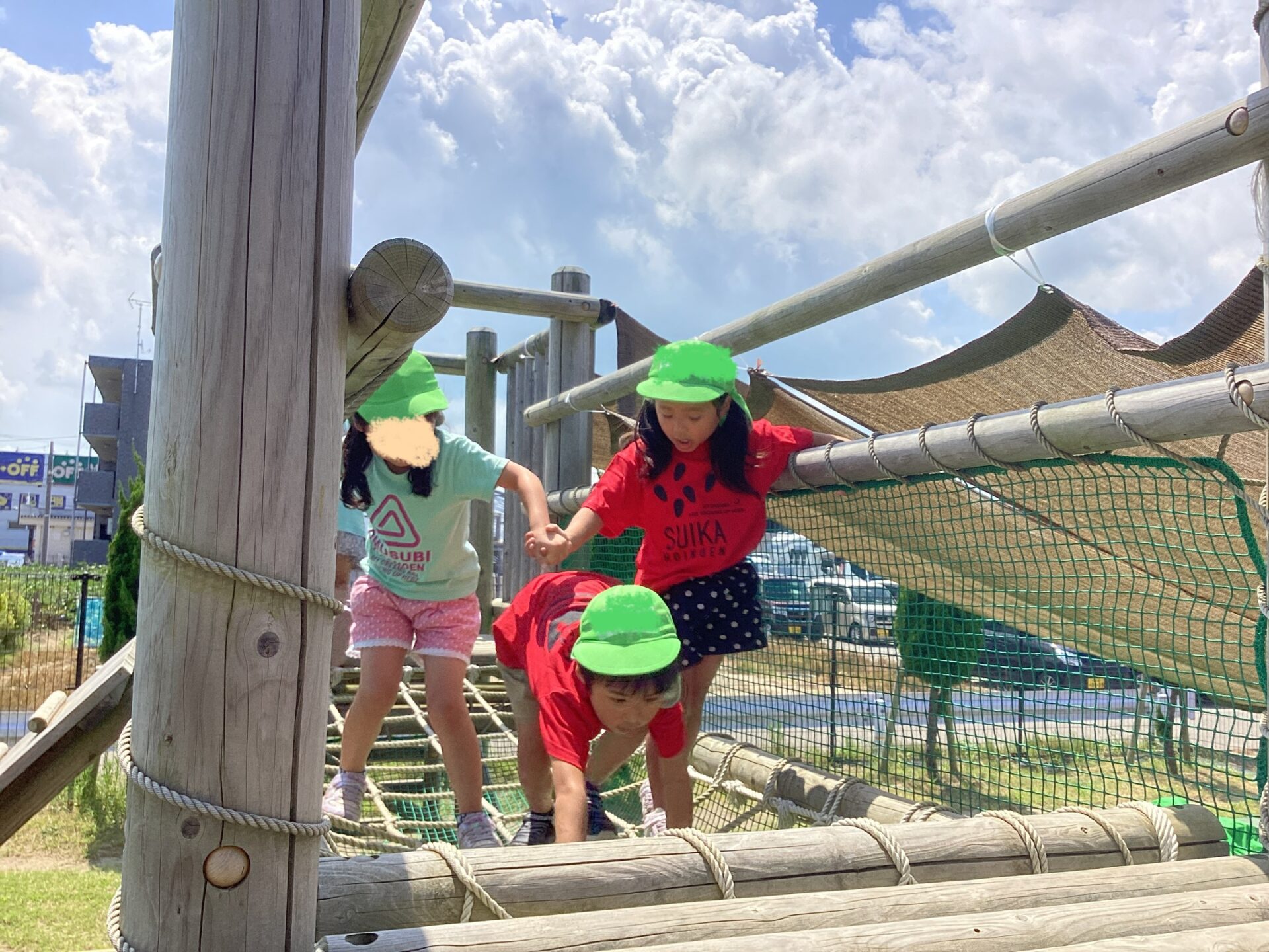 園庭の遊具では、高いのが怖くてなかなか進めないAちゃんがいました。すると、すいか保育園のお友だちが手を差し出してくれ、怖がっていたAちゃんは一緒に歩いて渡ることができました✨その後「ありがとう😊お名前は?」と子どもたち同士で話す姿あり、見ていた職員もほっこりしました☺️