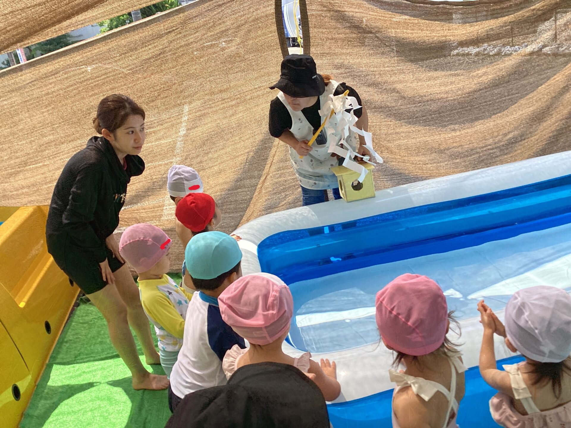 プール開きの日は、入水する前に園長先生からお祓いをしてもらいました。
