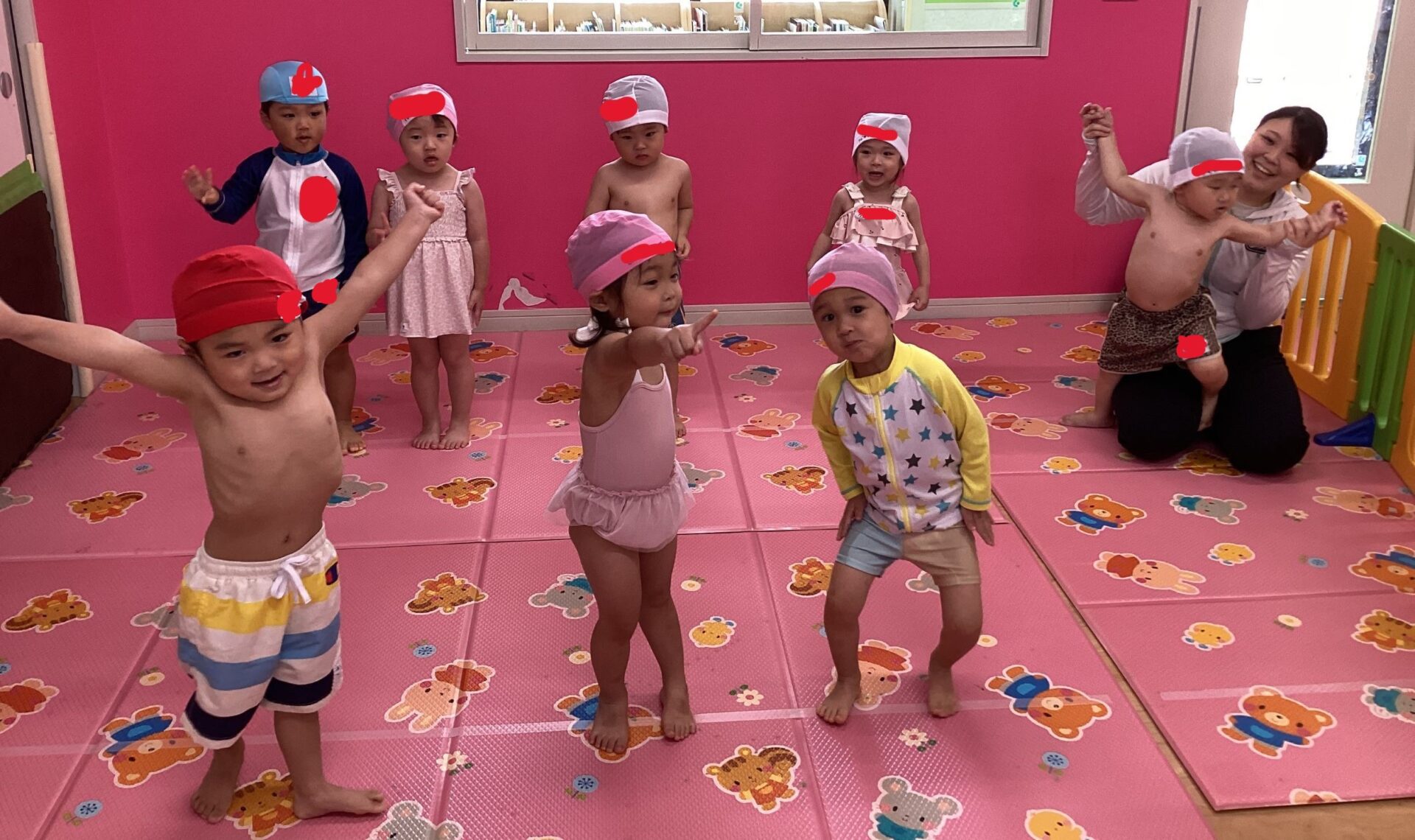 にじ組(2歳児)になると水着と、水泳帽を着用して入水しています!水着へのお着替えもやる気満々で取り組む子どもたち☺自分のプールバックから水着、水泳帽を取り出し、洋服を脱いで水着に着替え、脱いだ洋服をプールバックに入れる、といったお支度も自分たちでおこなっています。最初の頃は、上手く水着を着られず「てつだって~」と保育者に助けを求める声も多かったですが、今ではあっという間に水着へのお着替えを済ませる子も増えてきました😊