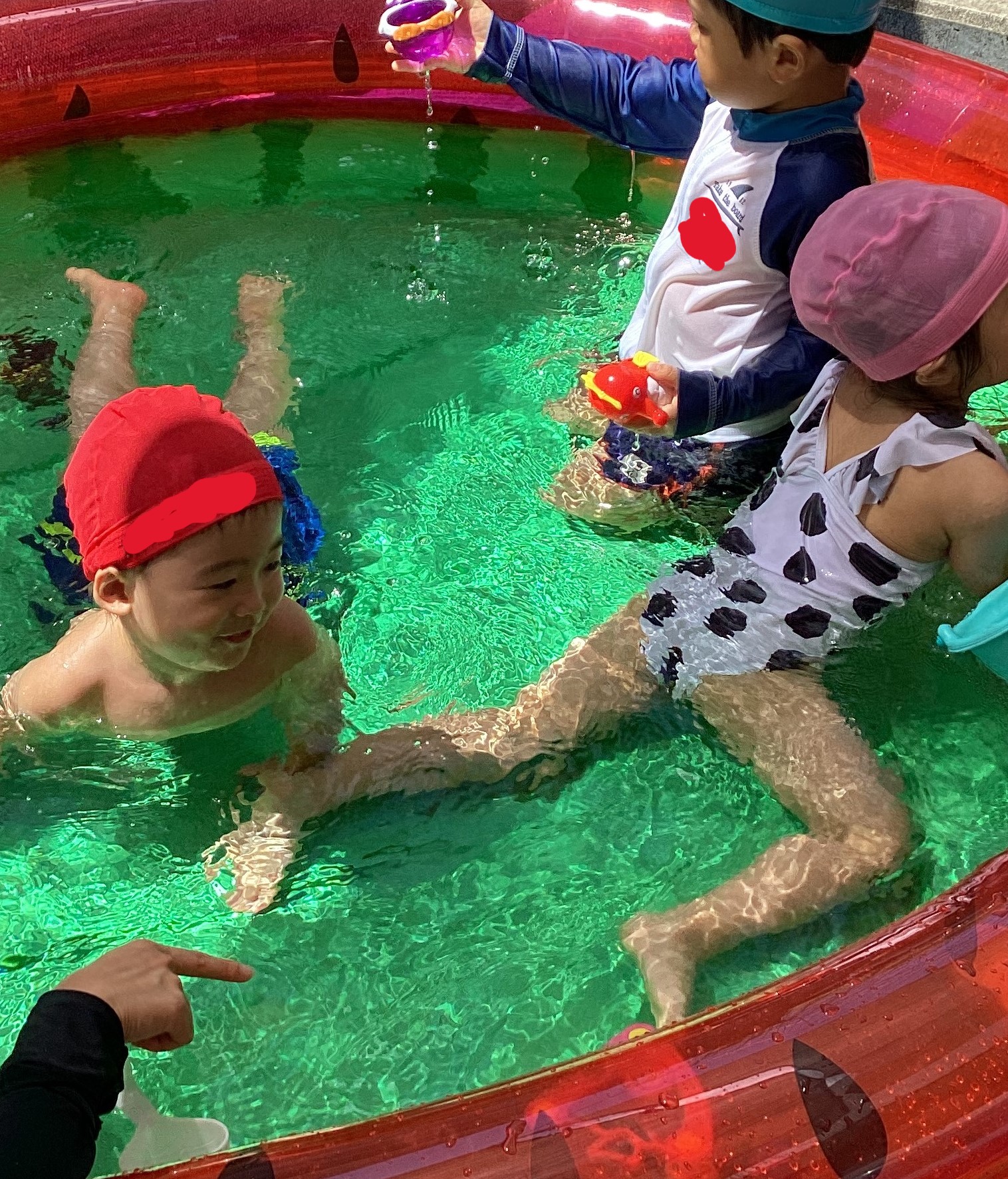 プールへ入水すると、「つめたーい」や「たのしい~」といった嬉しそうな声が子どもたちの口から聞こえてきました☆昨年は顔に水がかかるのを嫌がり泣いていた子もいましたが、今年は顔に水がかかっても泣く子がおらずダイナミックに水と触れ合っていることに一年の成長を感じます☺