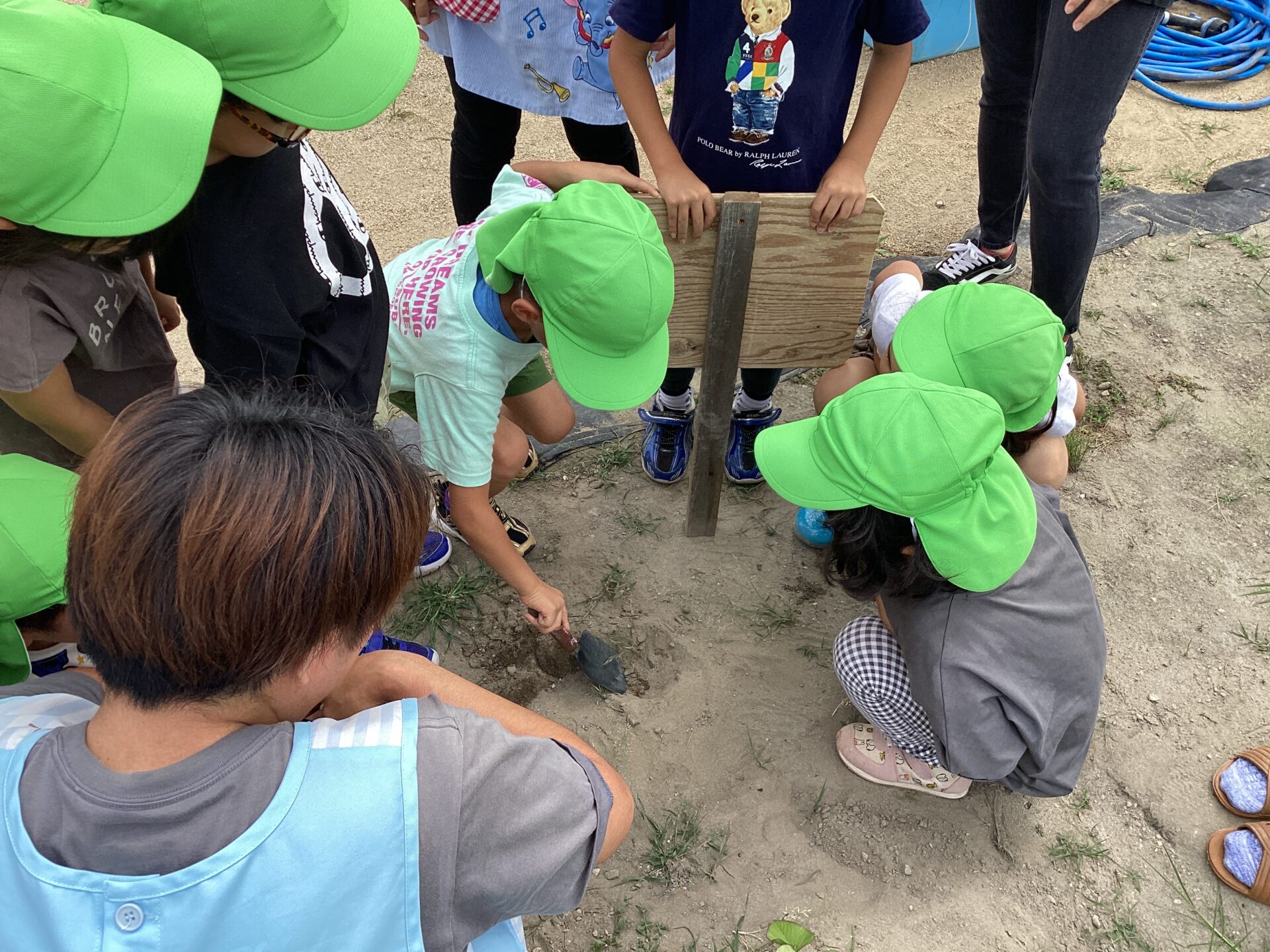 子どもたちも順番にスコップをまわして掘りますが、土が固くなかなか深く掘ることができません。