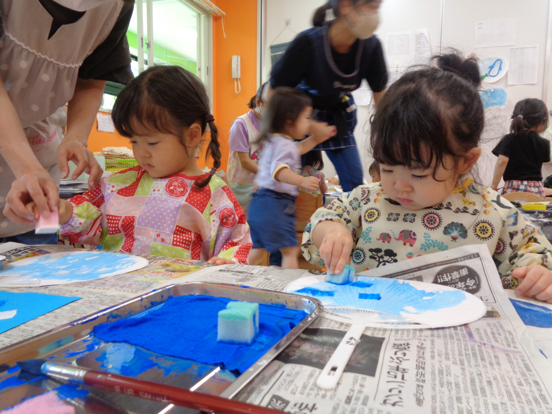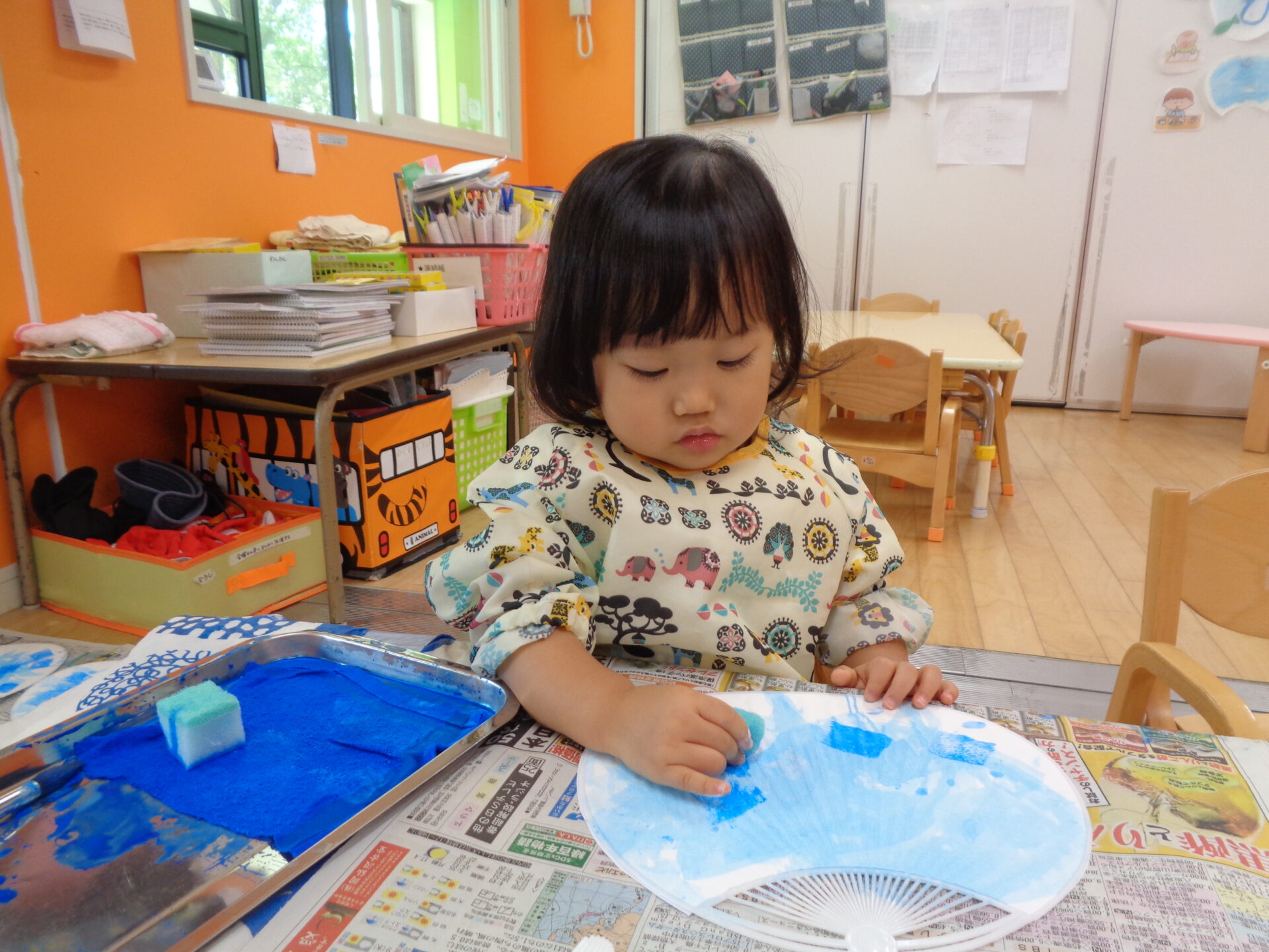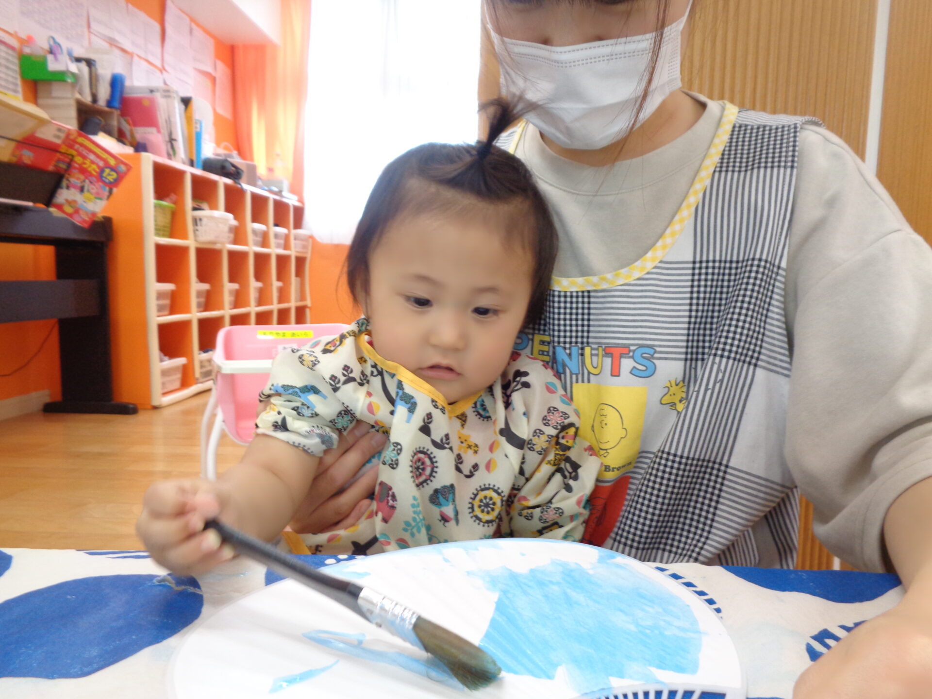 クラスだよりでもお知らせしましたが、おむすび・うみぐみ(0,1歳児j)のうちわ制作の様子をご紹介します😊