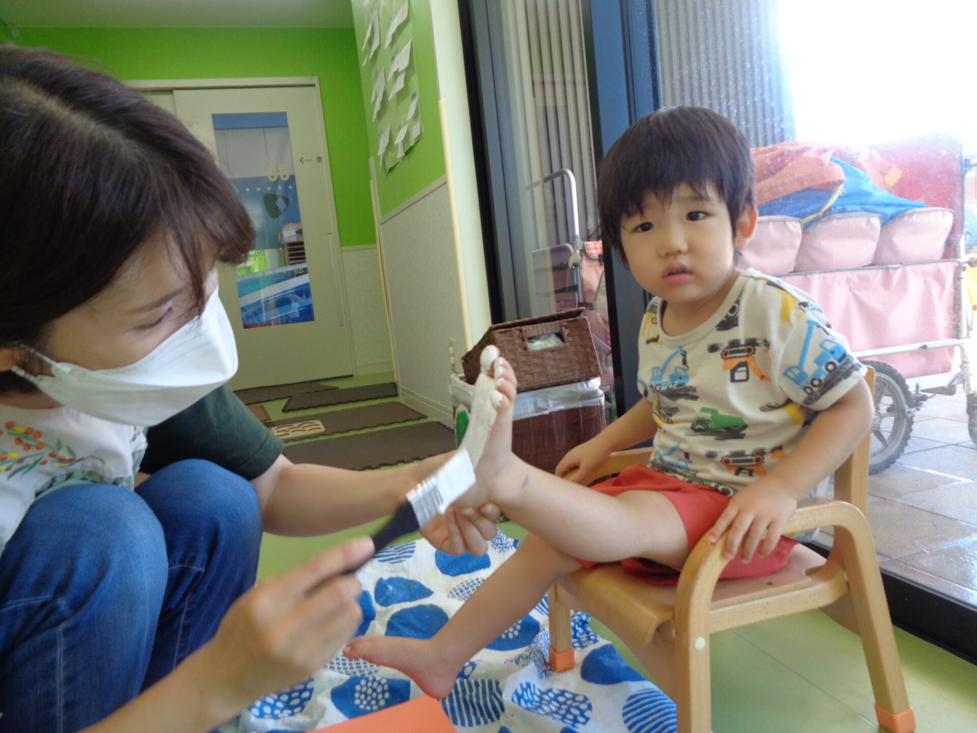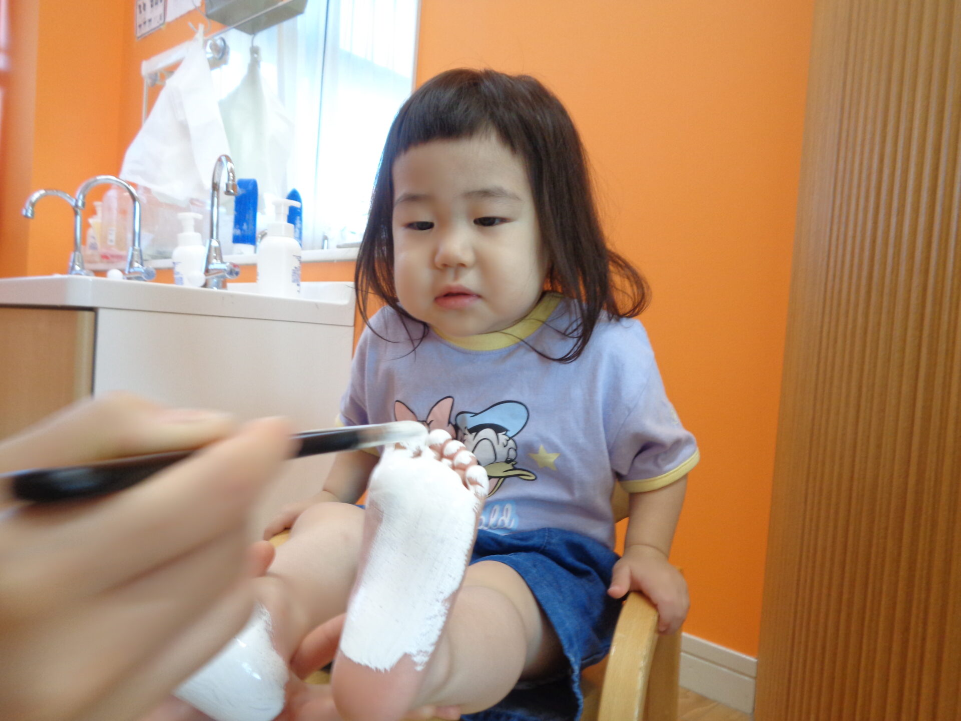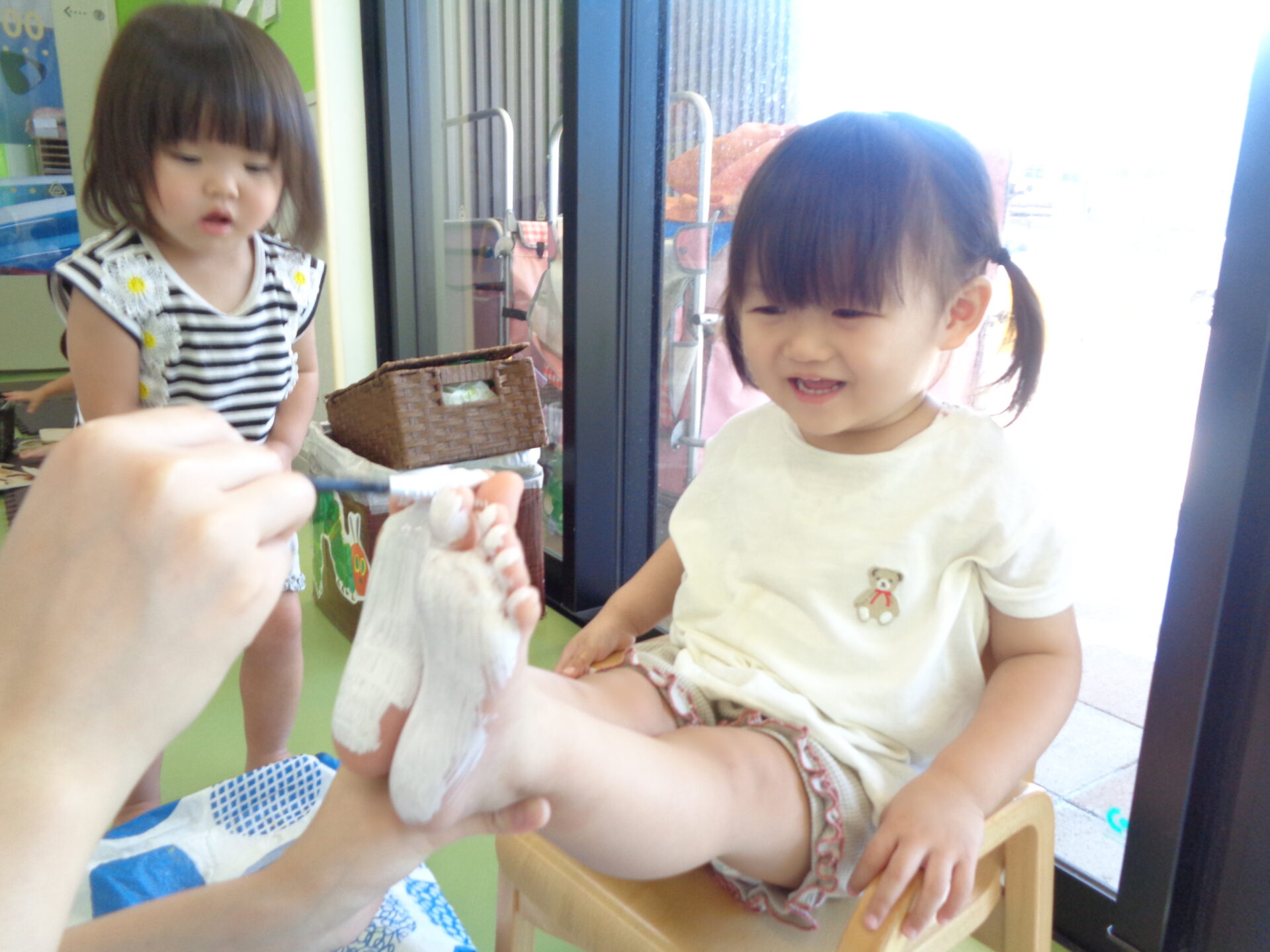 足の裏に絵の具をぬられるという不思議な感触に、ちょっぴり不安そうな子もいれば