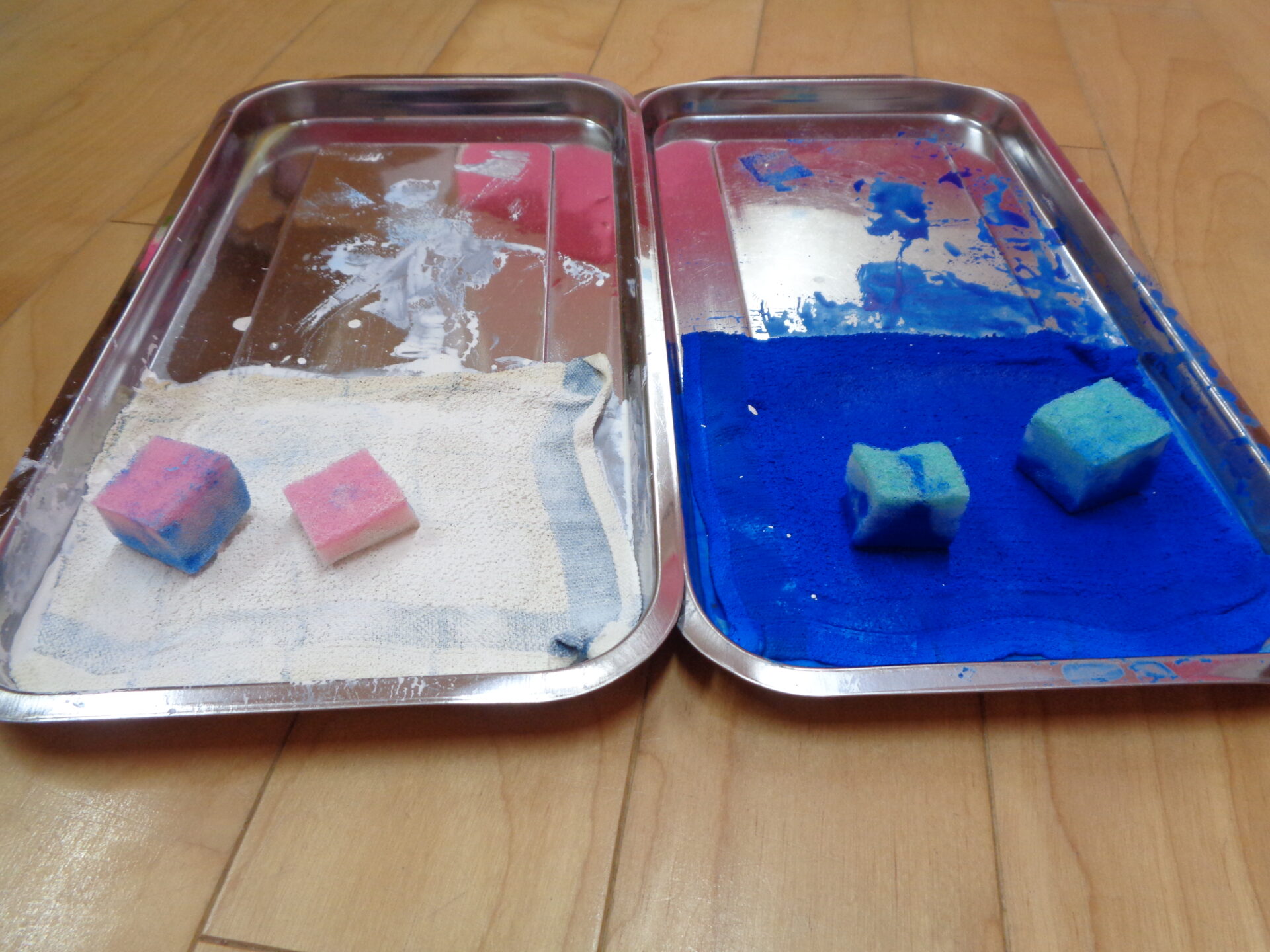 絵の具をしみこませた布と食器洗い用のスポンジを四角く切ったものを用意しました。