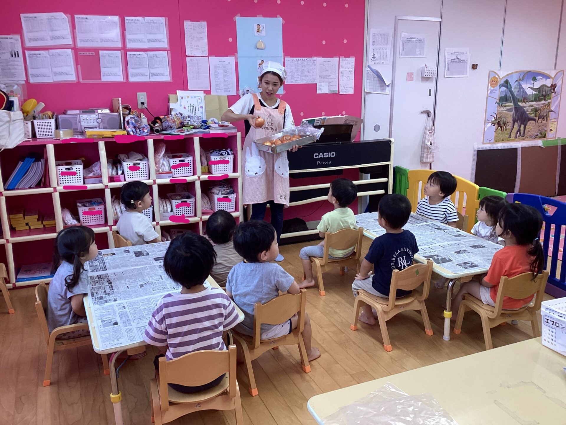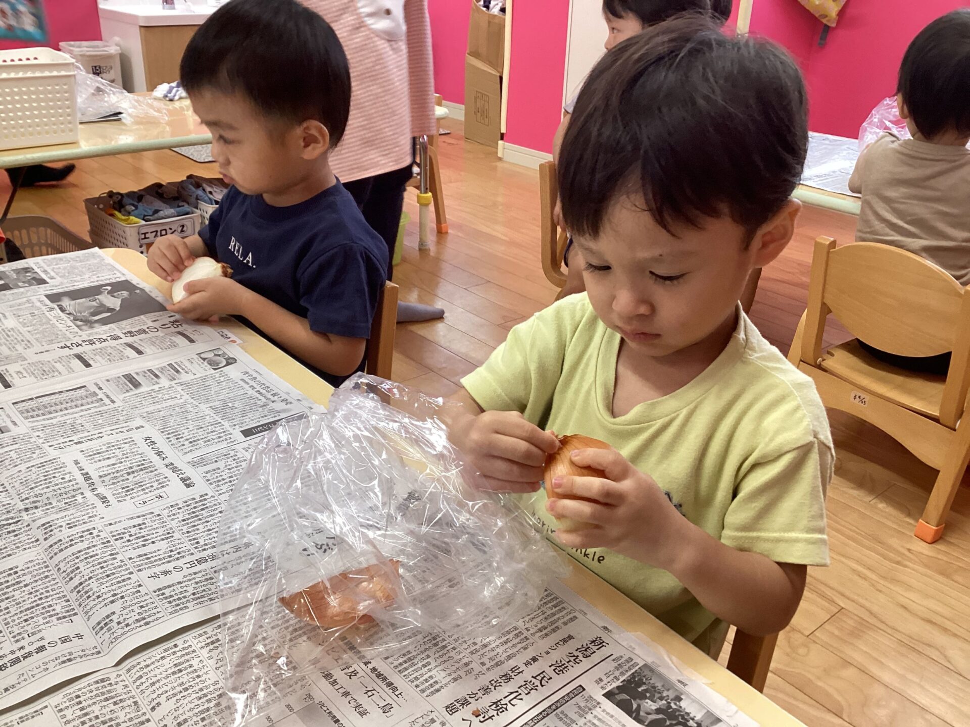 活動前に「玉ねぎ食べられない😣」と言っていた子も、「玉ねぎくさ~い!!」と言っていた子も、お友だちが楽しそうに皮むきをする姿を見て、ゆっくりと手を伸ばしていました💕