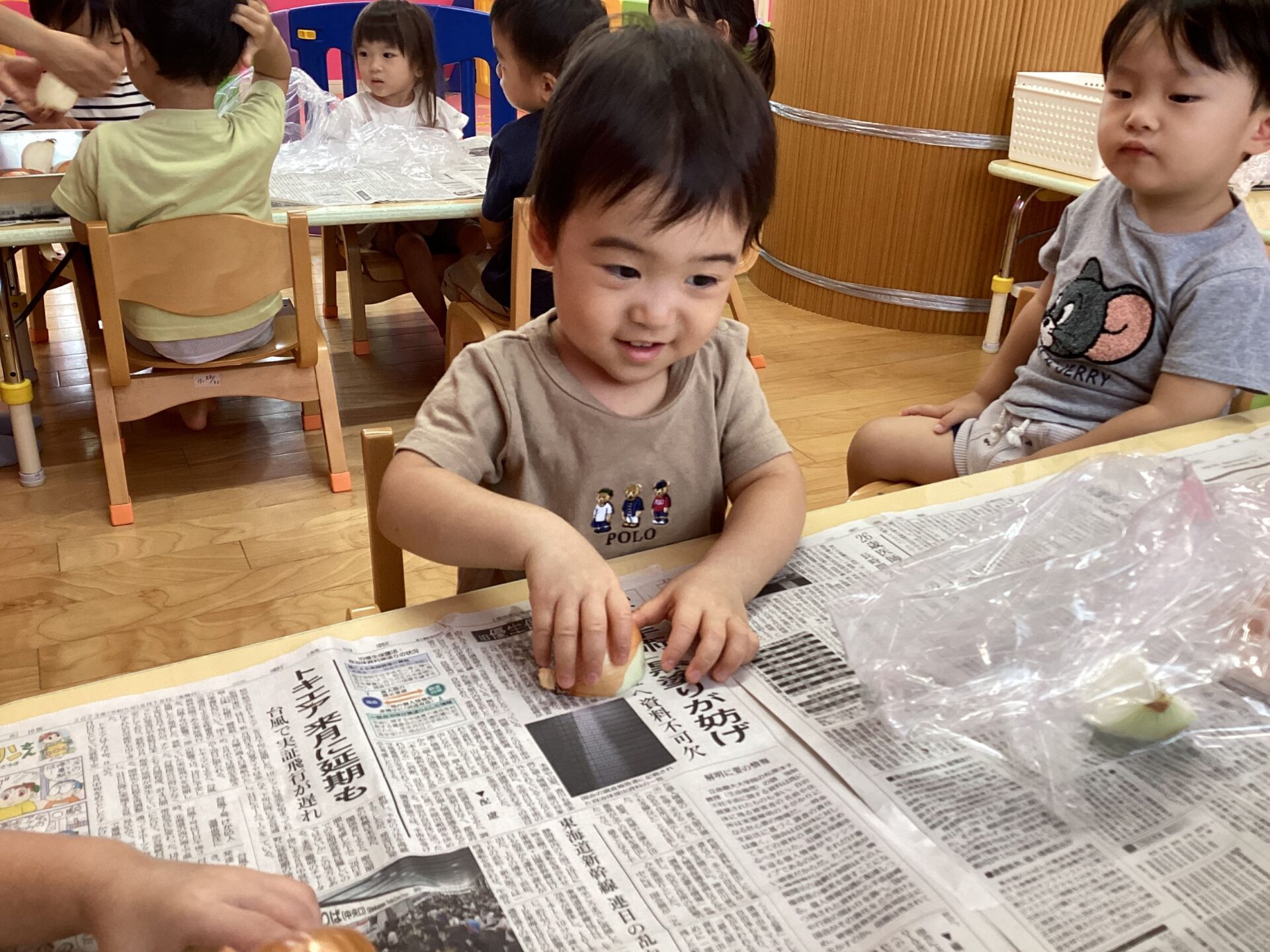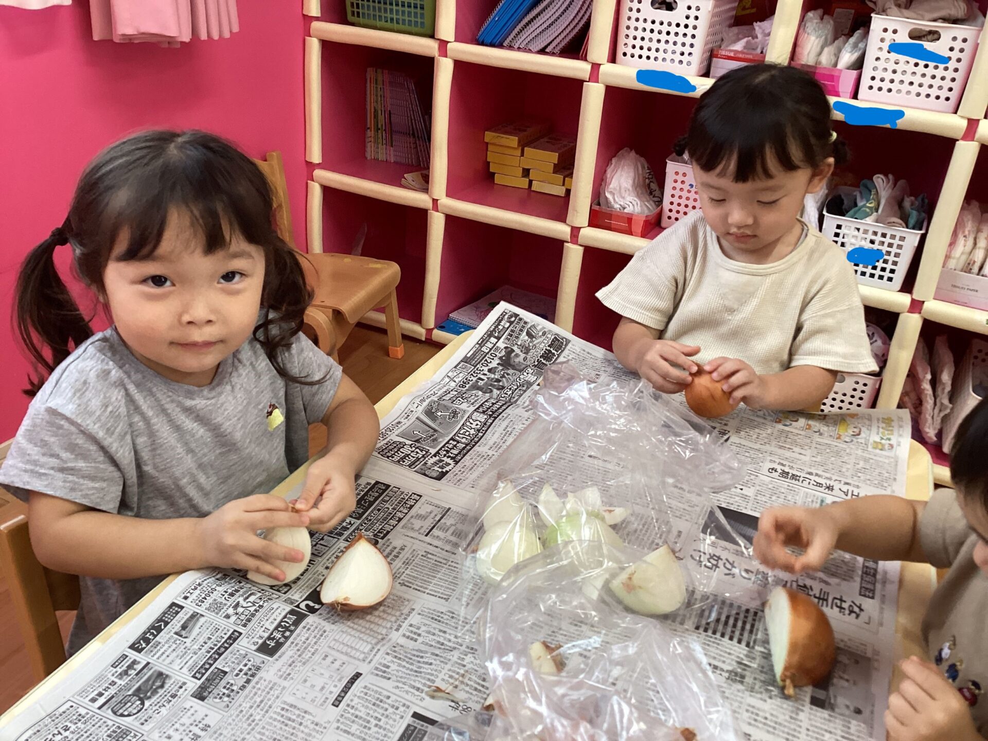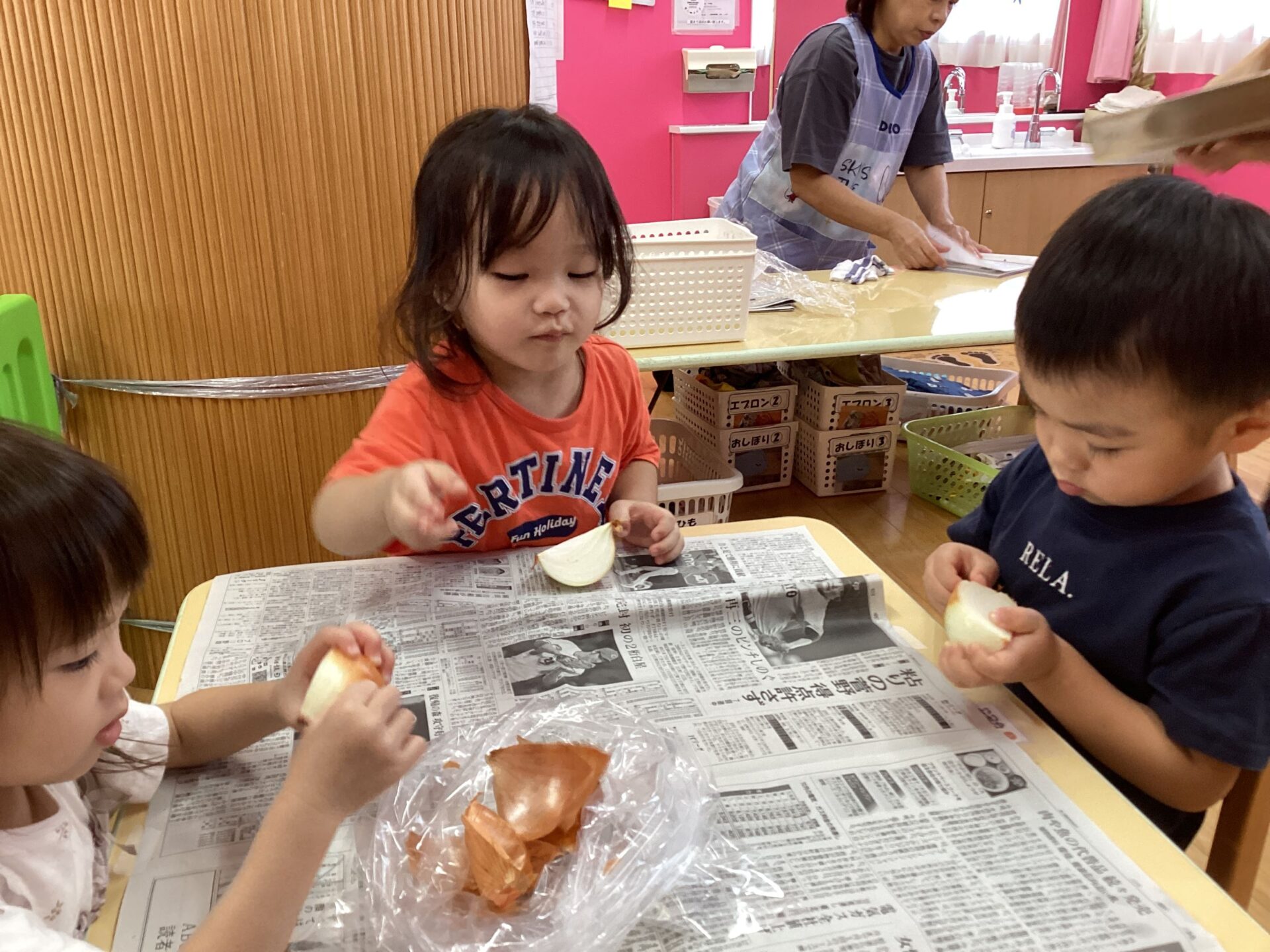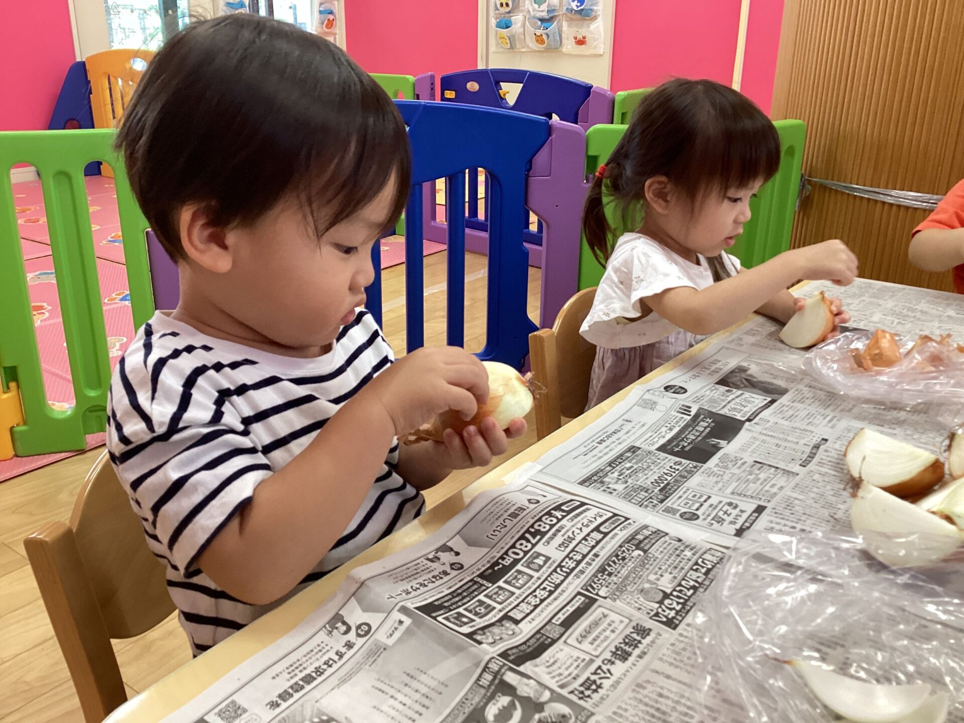 先日ブログでお知らせしましたが、8月に食育活動として「キャベツの葉もぎ」をおこないました。丁度同じ日には、うみぐみ(1歳児)のお友だちが、「玉ねぎの皮むき」をおこなっていました。実はその様子を見た子どもたちから、「次は玉ねぎだね!!」と、声が上がっていたのです😊