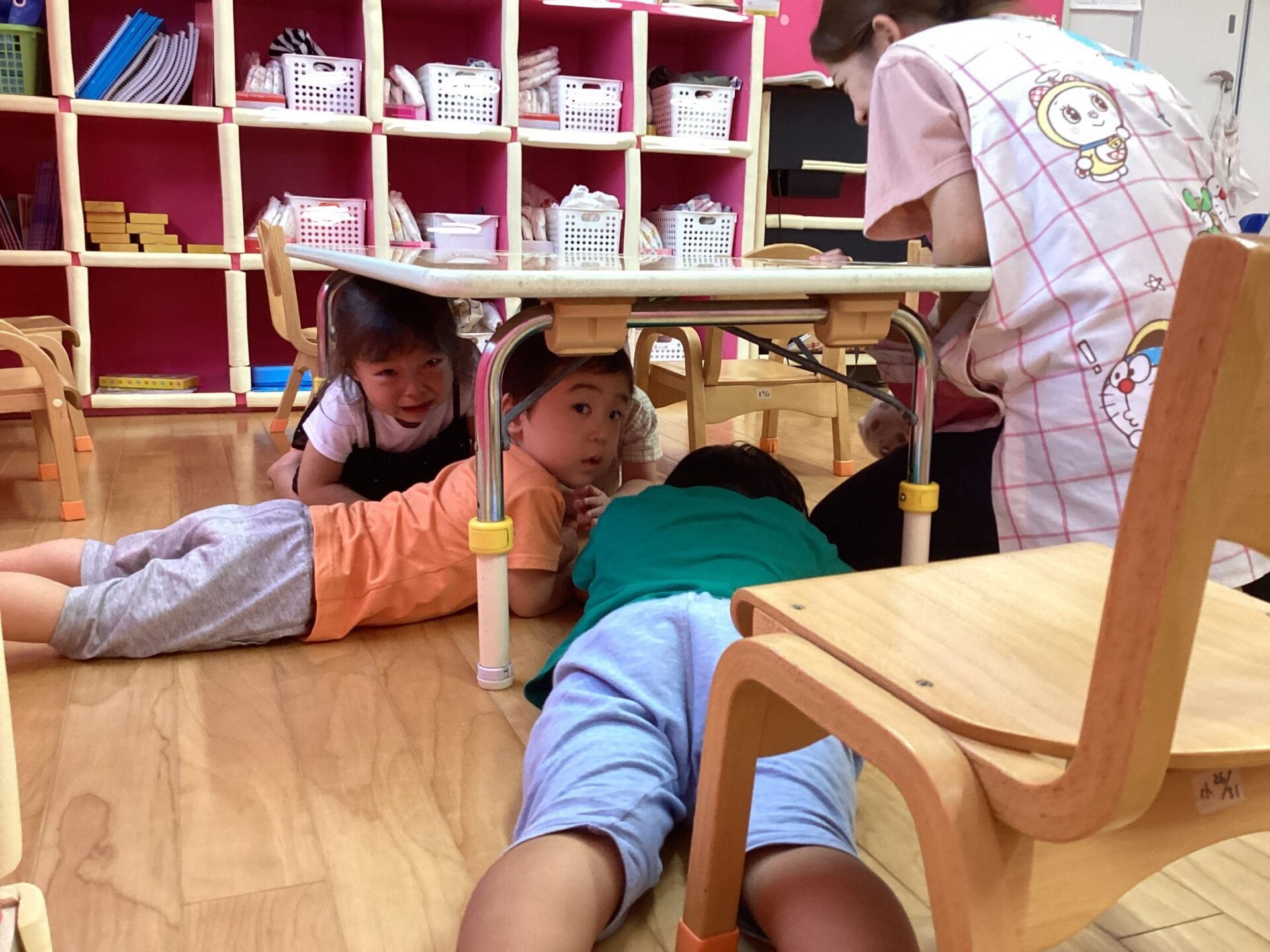 地震と聞いて、さっと机の下に身を隠す子