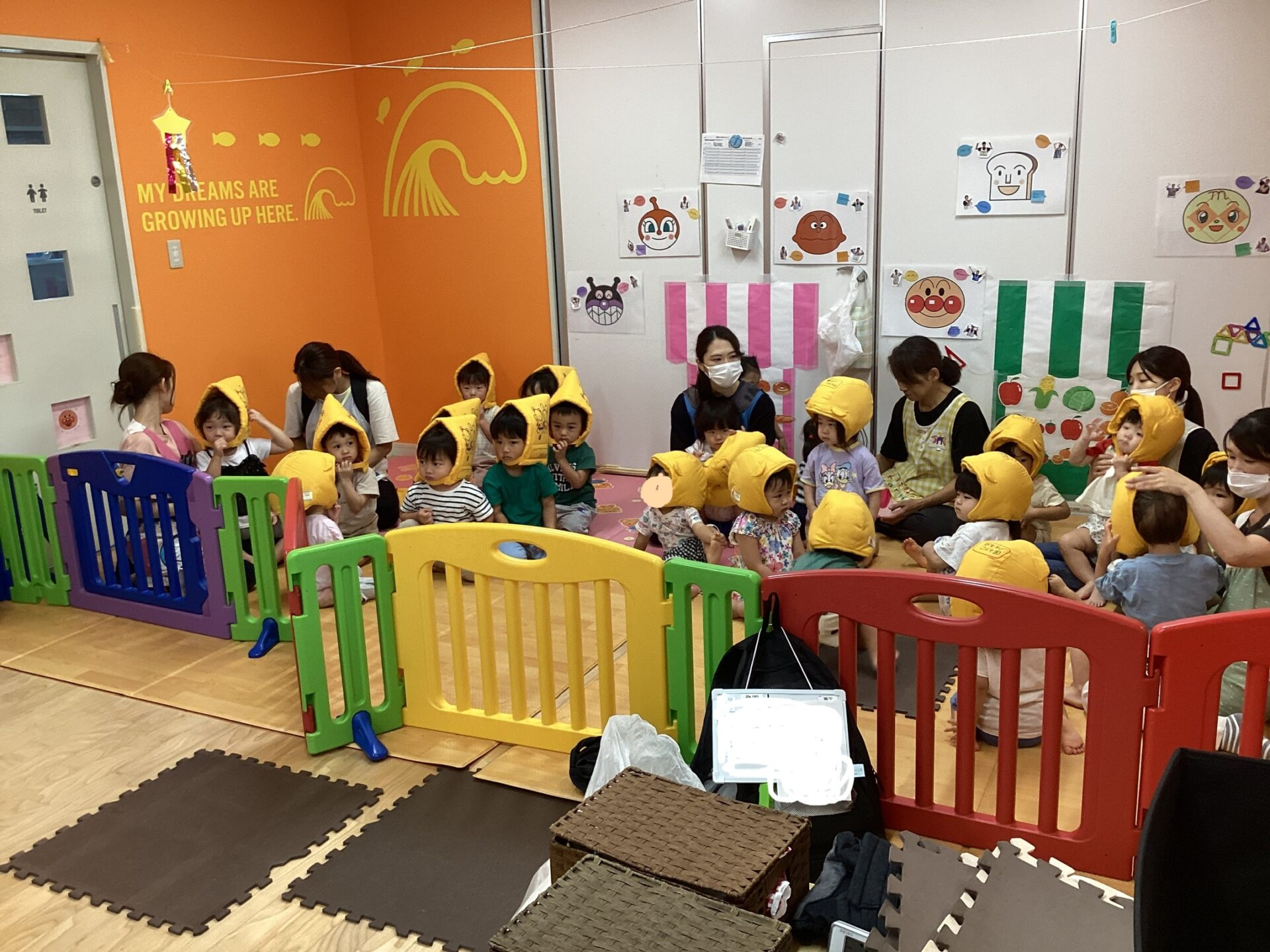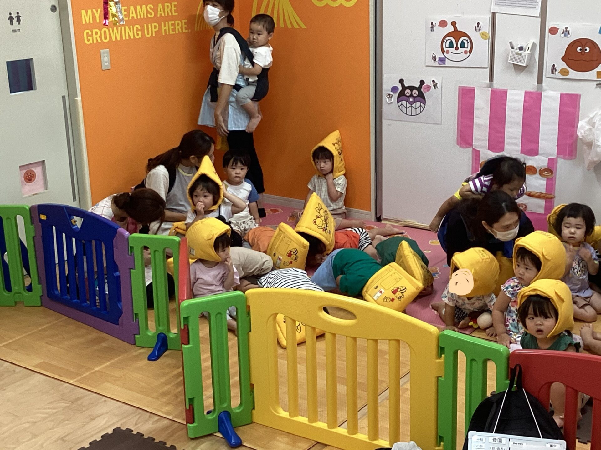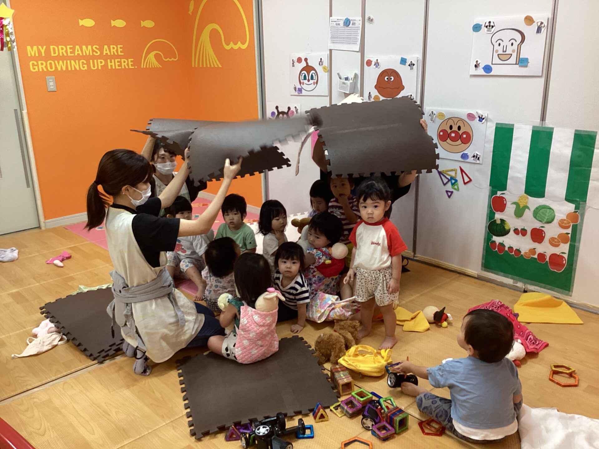 0、1歳児の子ども達は1カ所に集まり、保育士が頭上にマットを被せることで