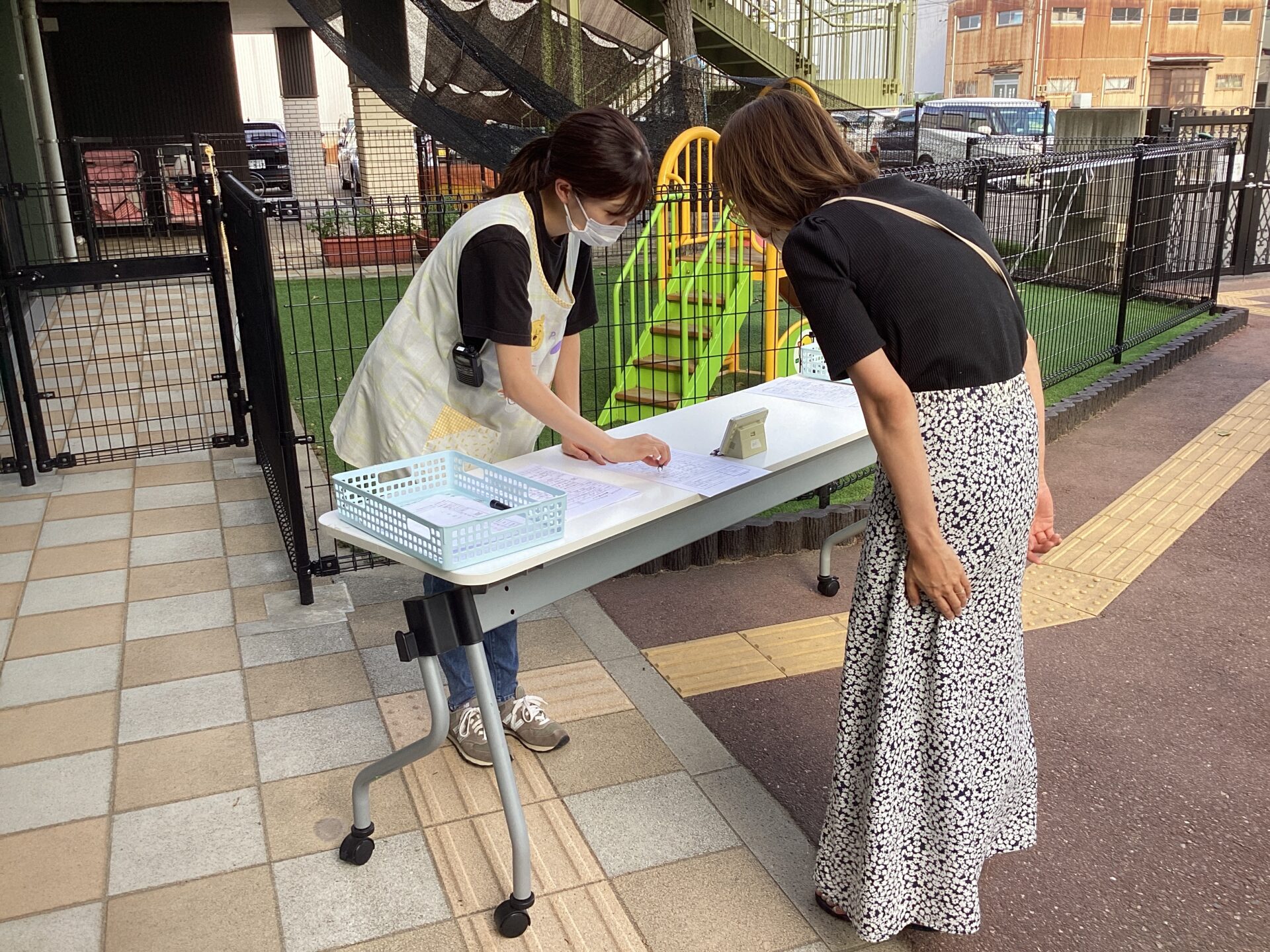 お顔を確認して頂き、お子さんに間違いがないか保護者の方と保育者とが1対1で対応し、