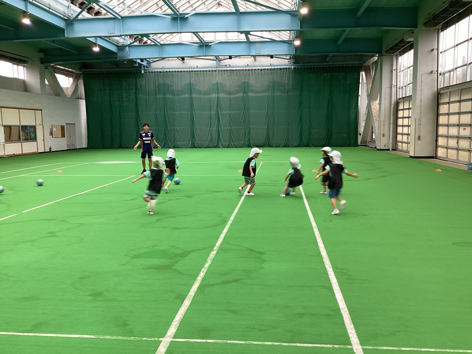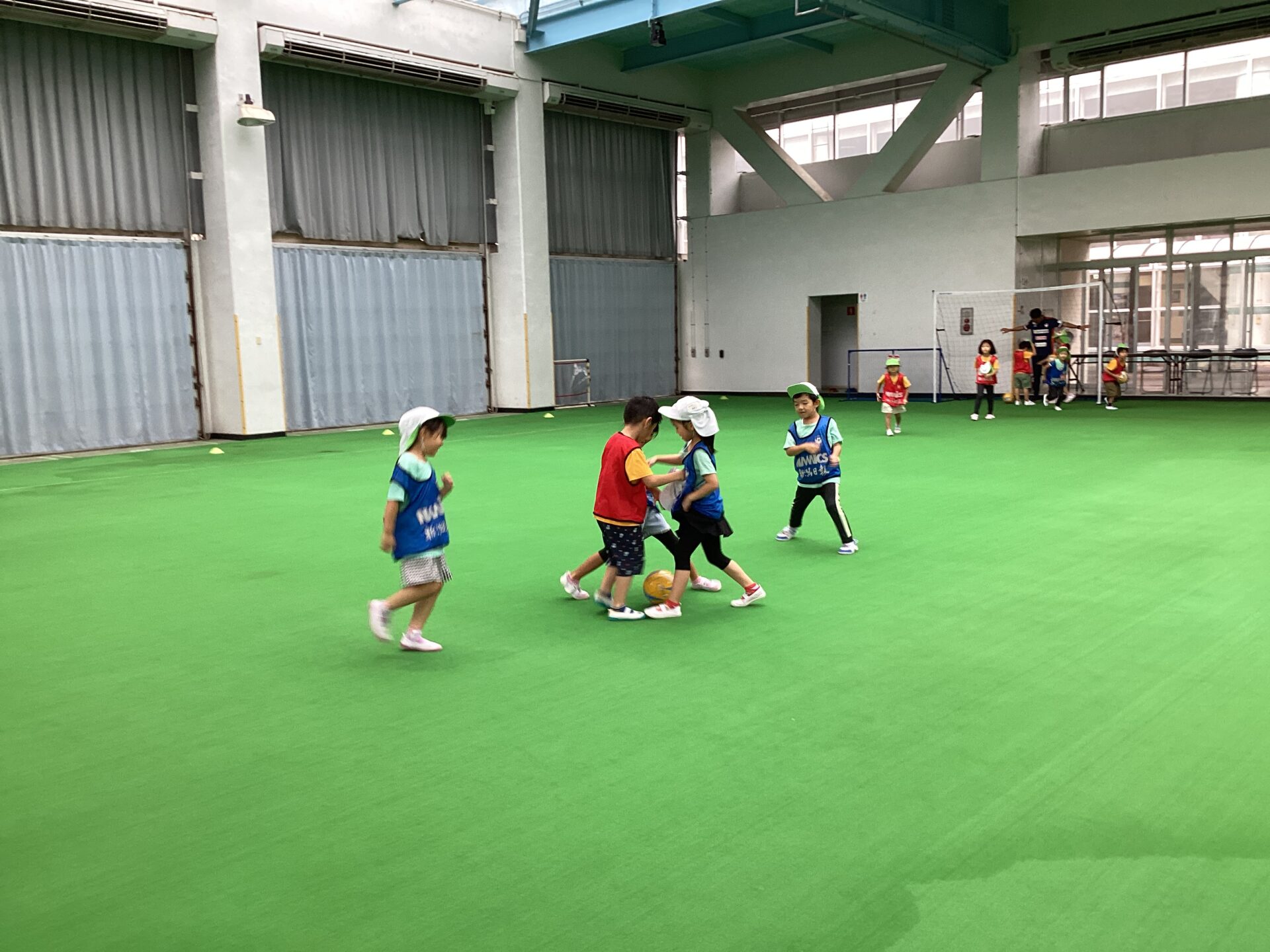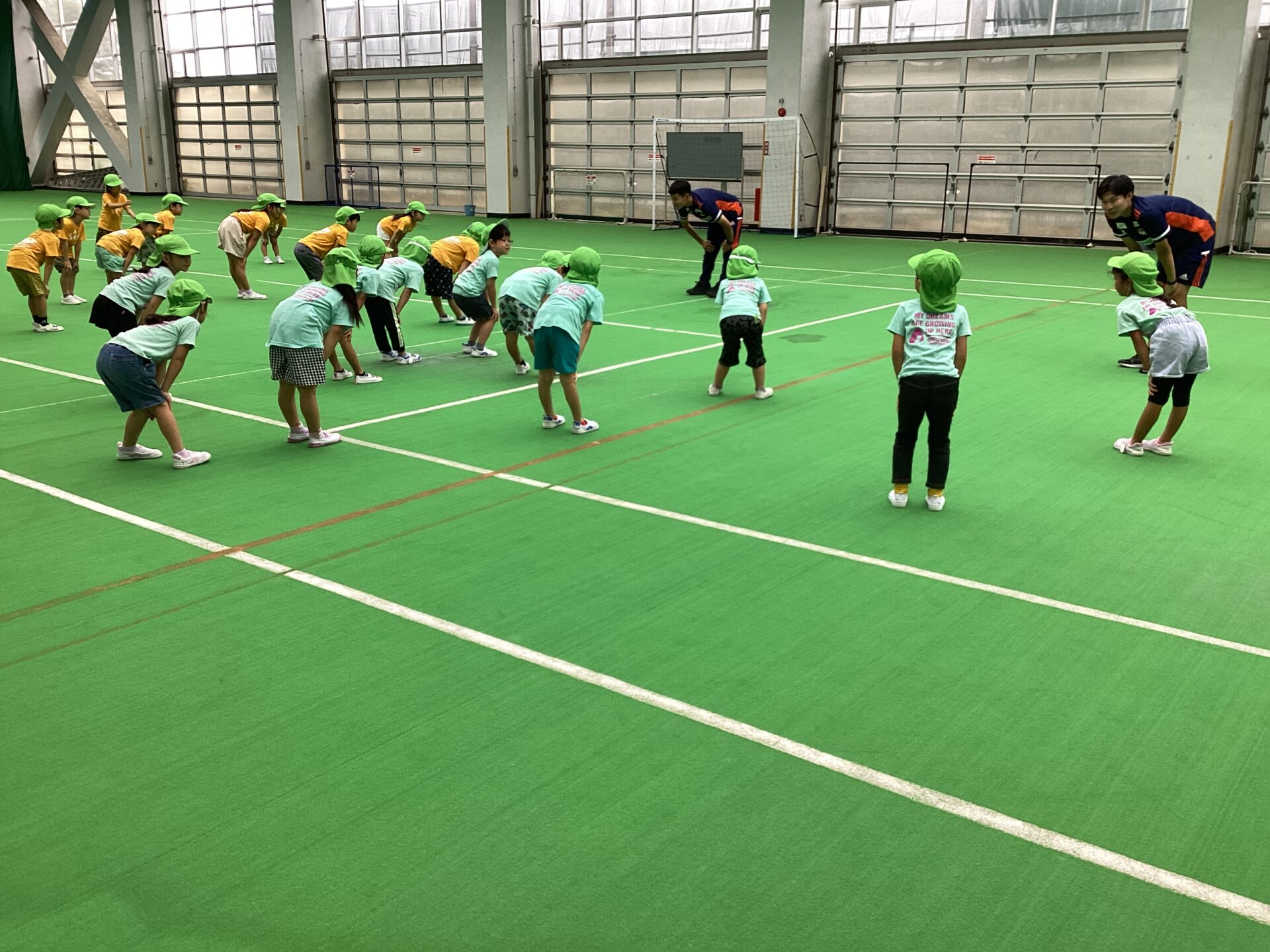 ボールを一生懸命おいかける、子どもたちの顔は真剣そのものです。子どもたちの額には大粒の汗が光っていました。お家の方にご用意していただいた、汗拭きタオルが大活躍でした✨ご準備いただきありがとうございました😊