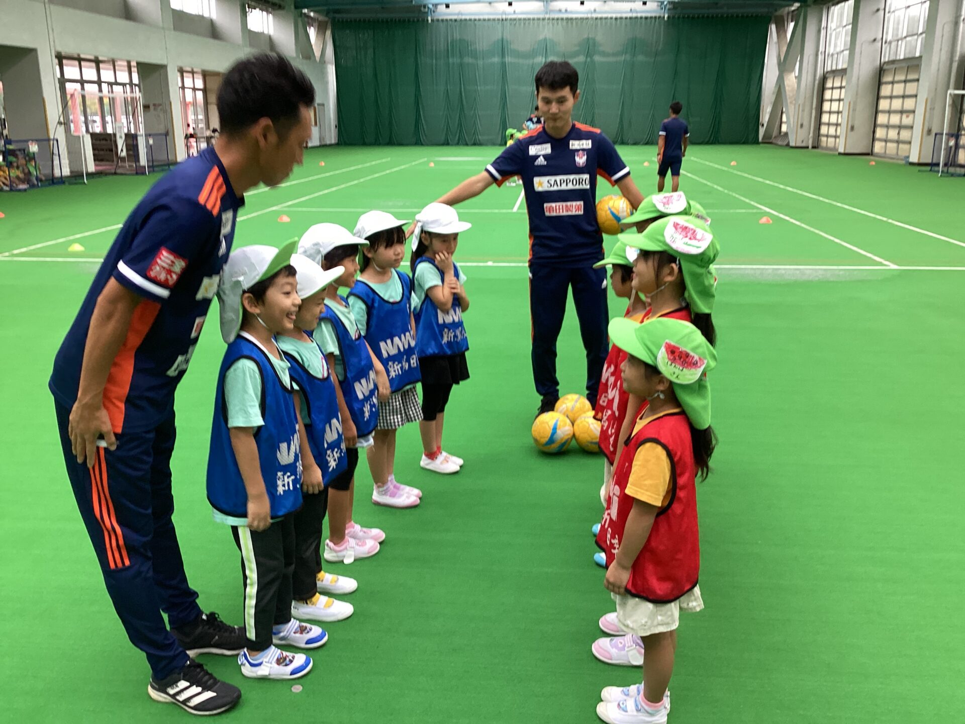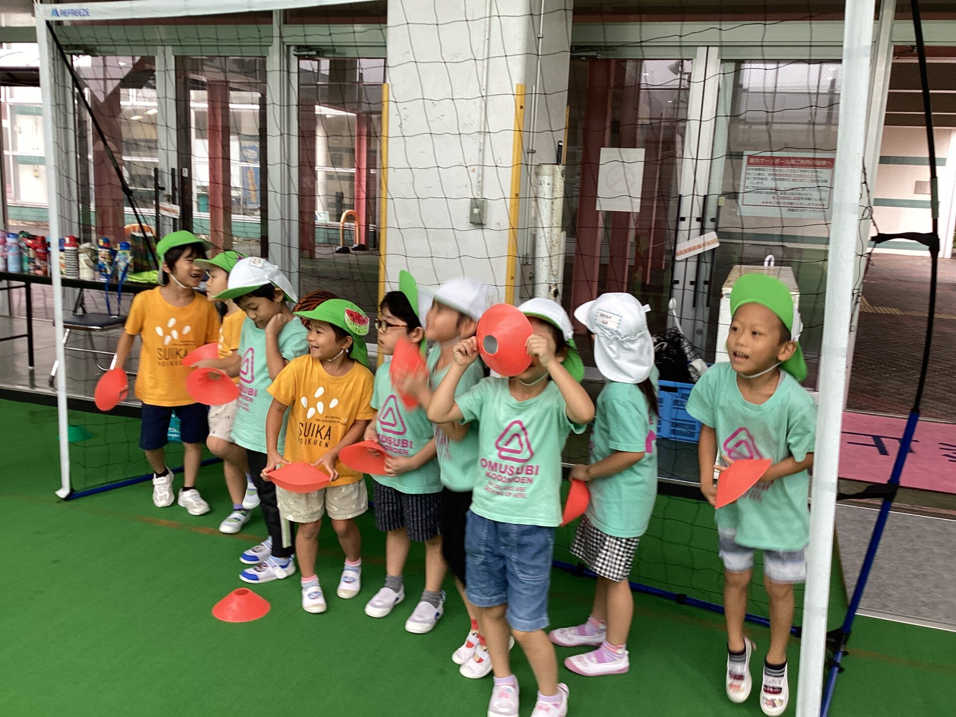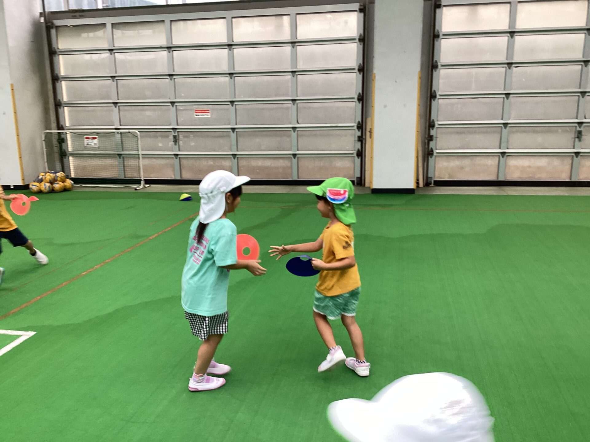 ボールを一生懸命おいかける、子どもたちの顔は真剣そのものです。子どもたちの額には大粒の汗が光っていました。お家の方にご用意していただいた、汗拭きタオルが大活躍でした✨ご準備いただきありがとうございました😊