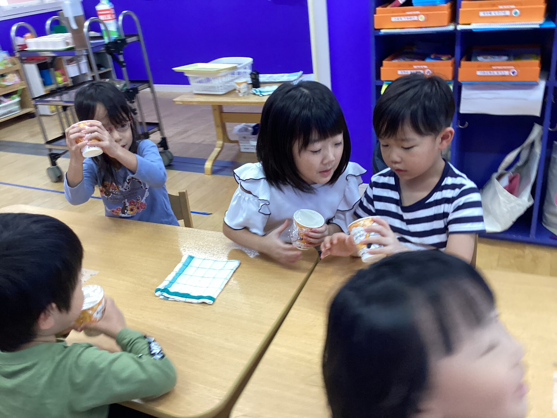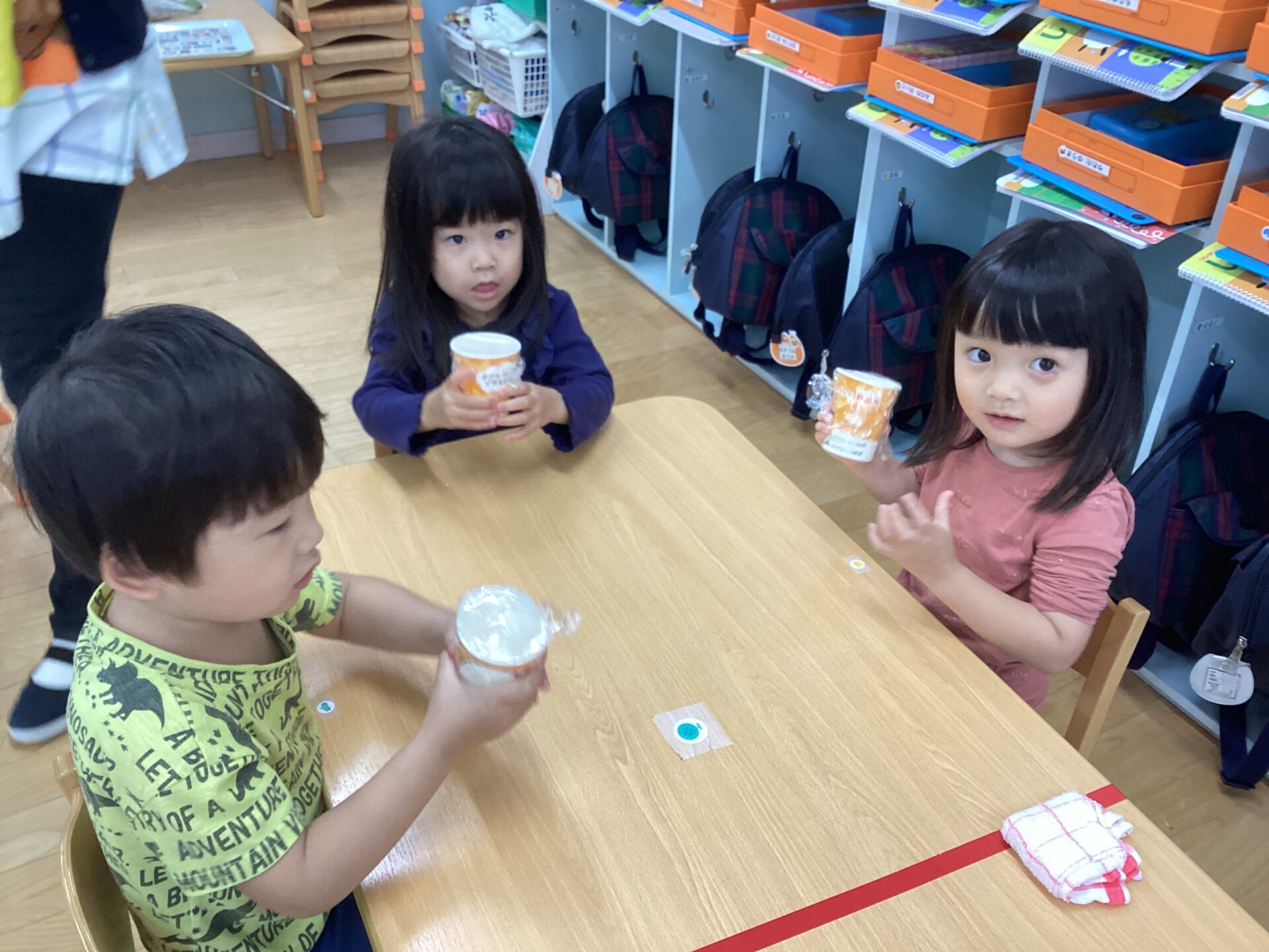 さて、子どもたちは紙コップにラップをかけて、何をシャカシャカしているでしょうか!?