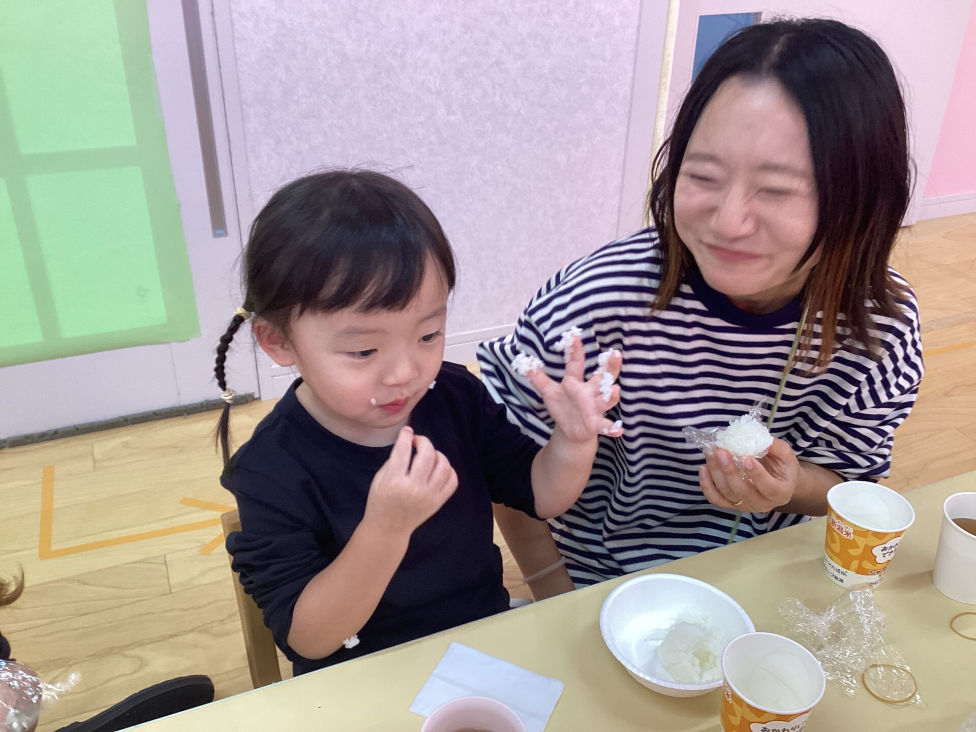 今日は、にじ組(2歳児)のお楽しみ会もあったため、親子でシャカシャカおにぎりづくりを体験していただきました。