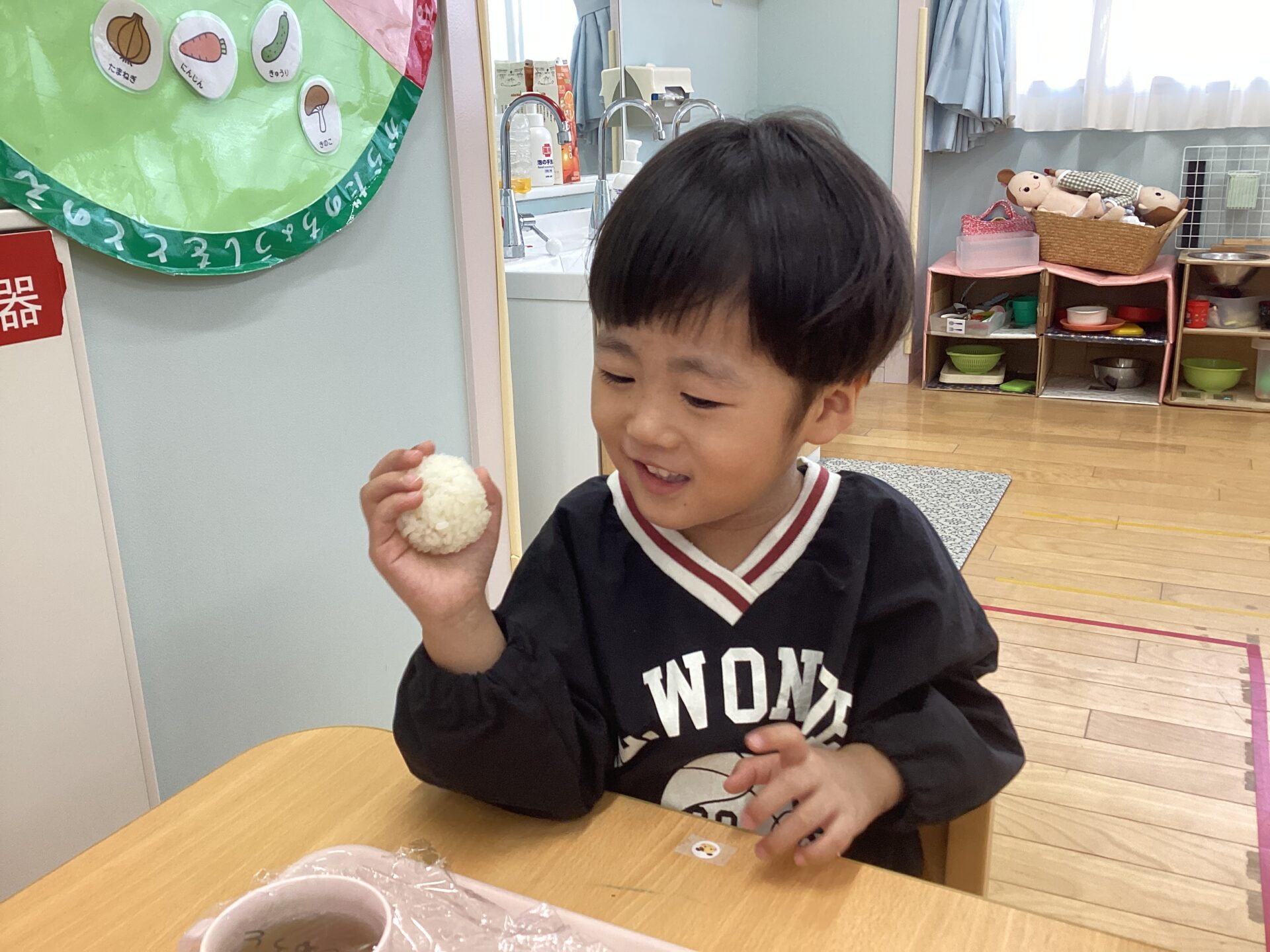 ペロリと食べ終わり「おいしい😆」ととびきりの笑顔。子どもたちにとって、自分で作ったおにぎりは格別だったようです。