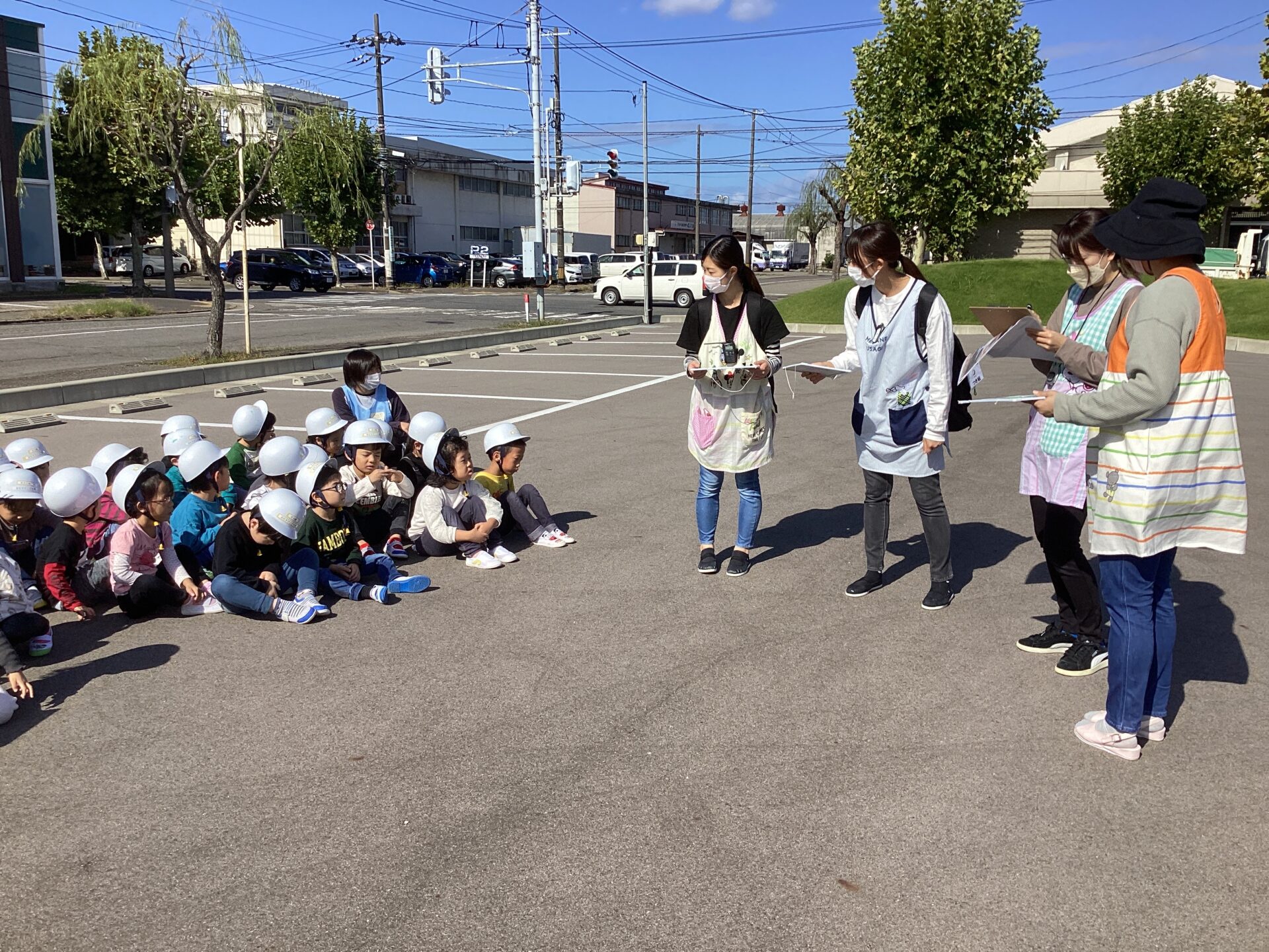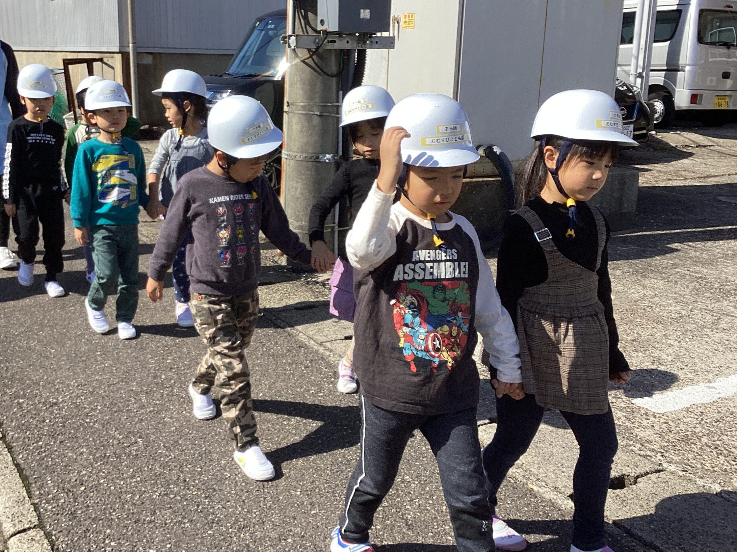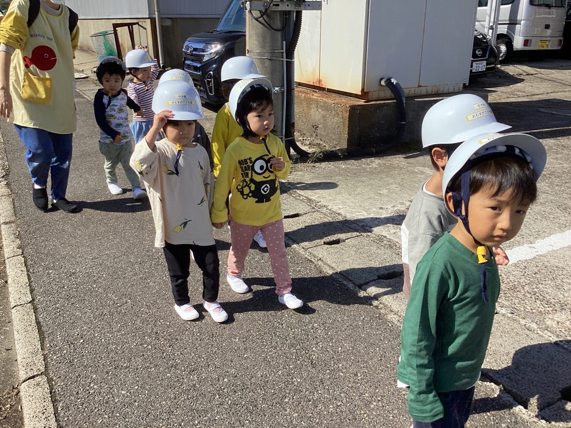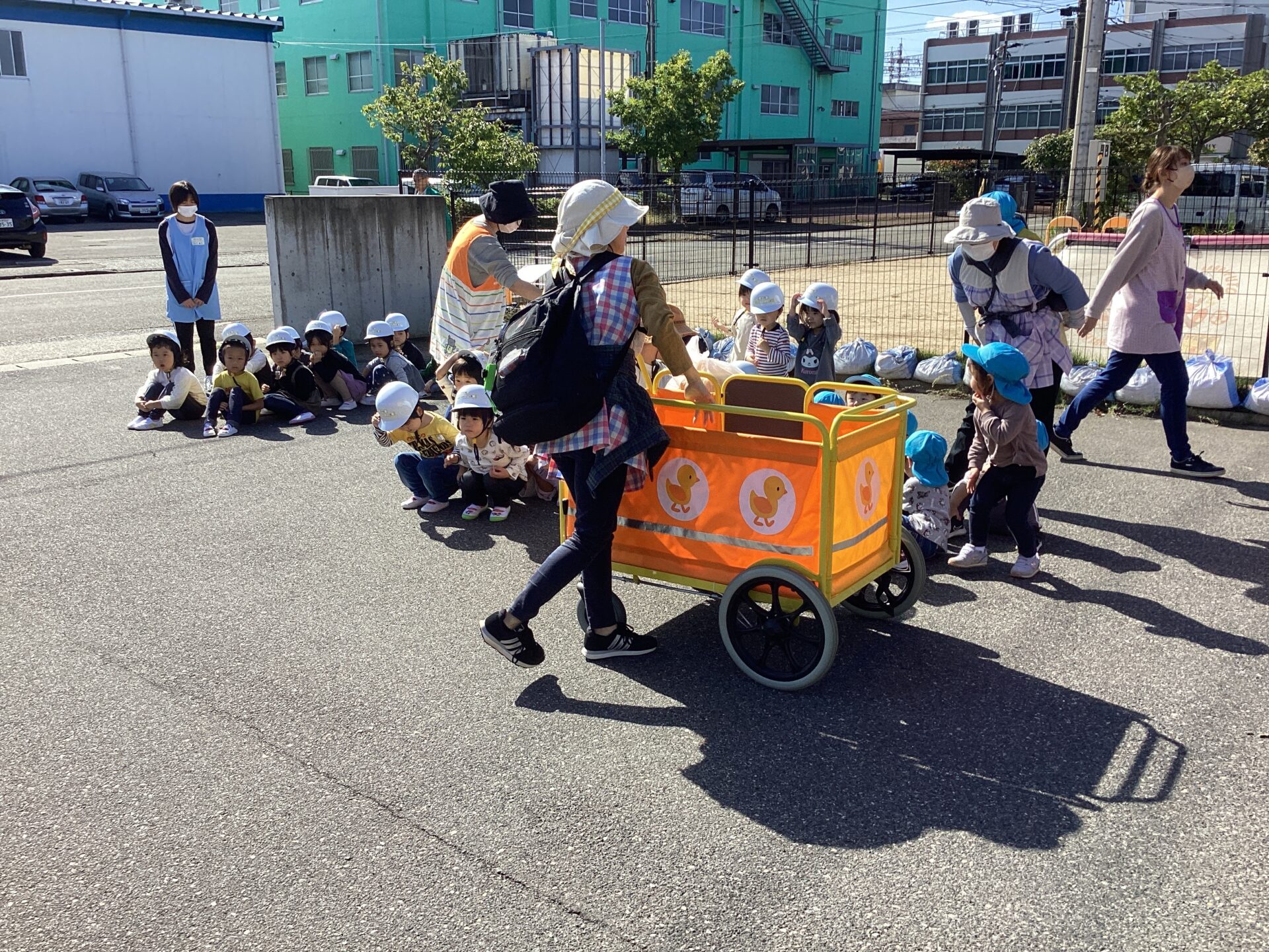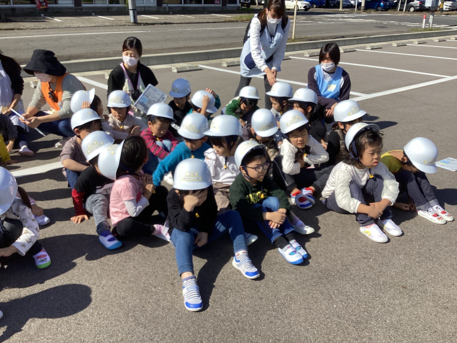 普段園外に出る際は、横断歩道を使って道路を渡っていますが、訓練では、横断歩道がないところを車に気をつけながら素早く通る避難をしましたよ!