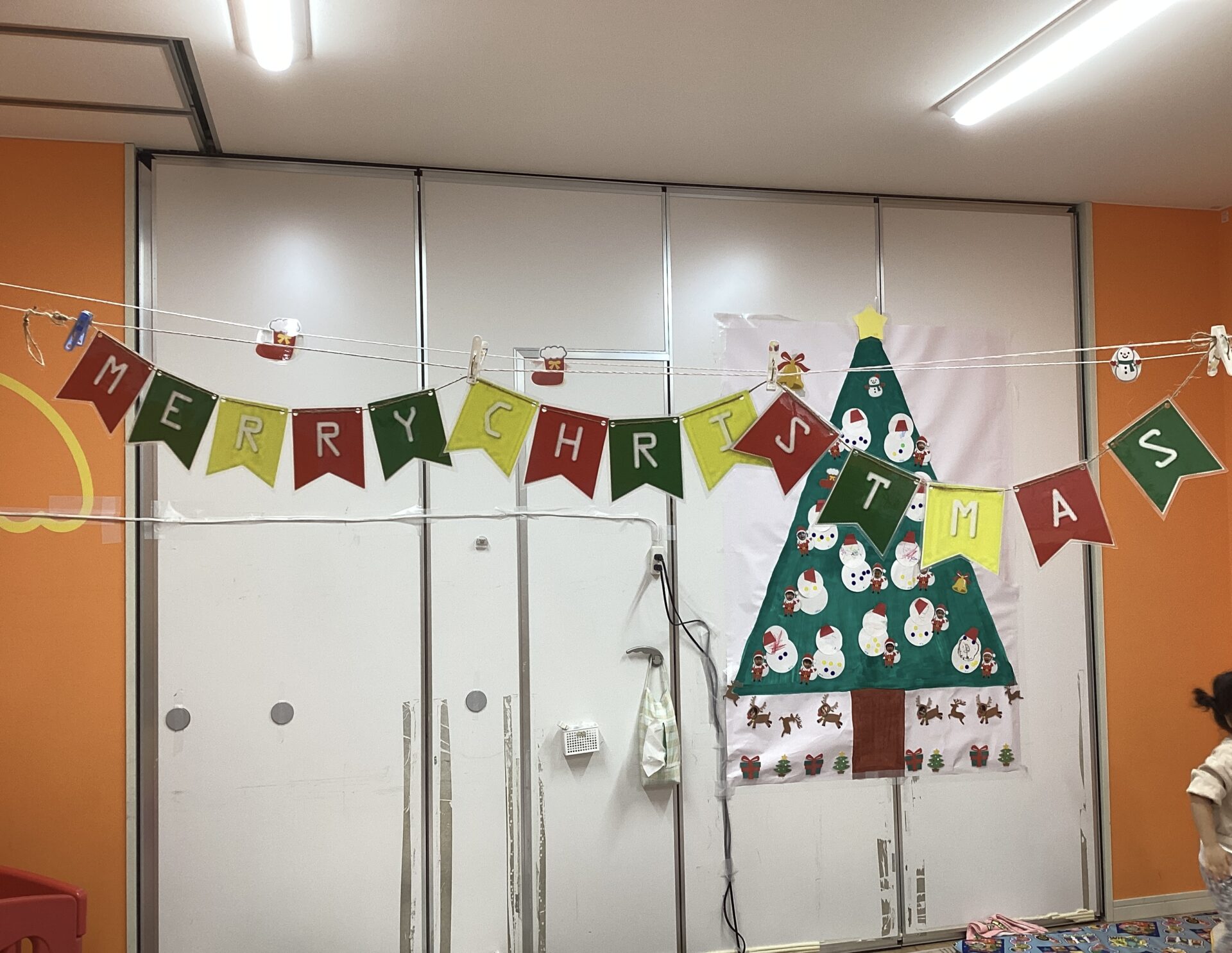 うみ組(1歳児)は、クラスの中でもクリスマスの雰囲気を楽しんでもらいたいと思い、“うみ組オリジナル”のクリスマスツリーを飾りつけました🎄