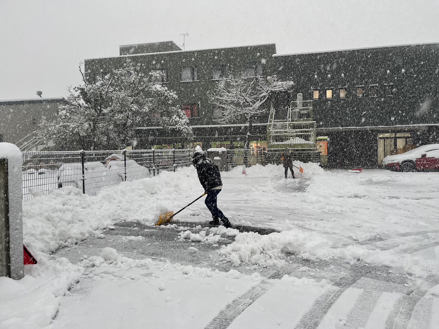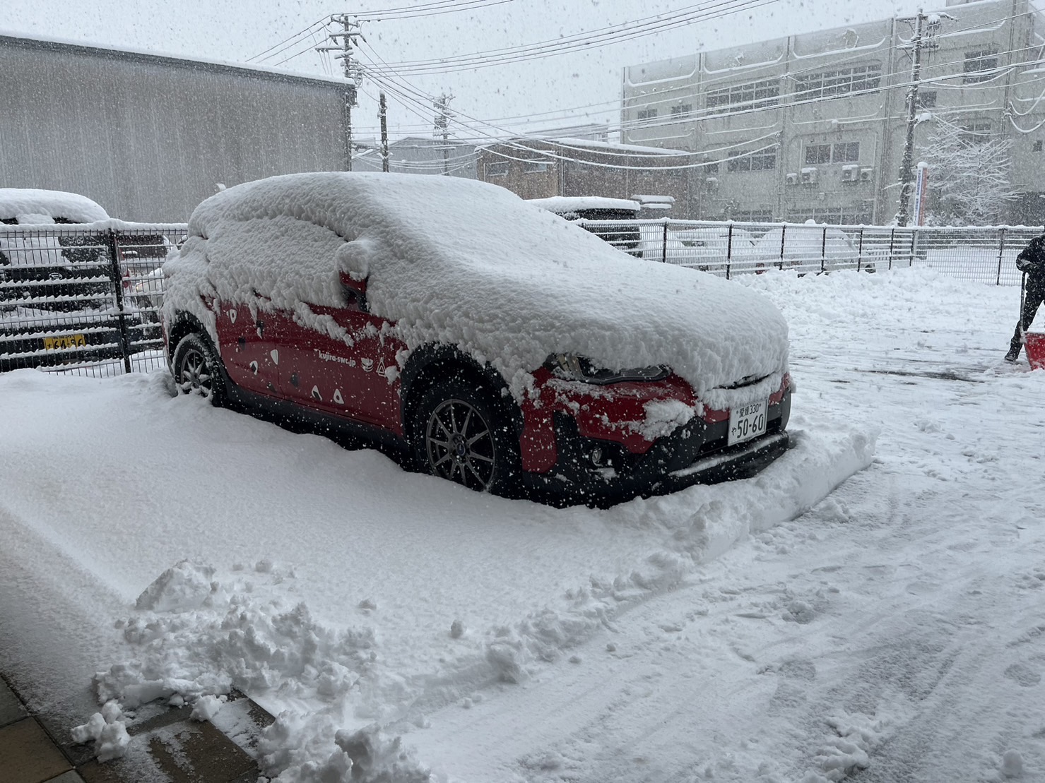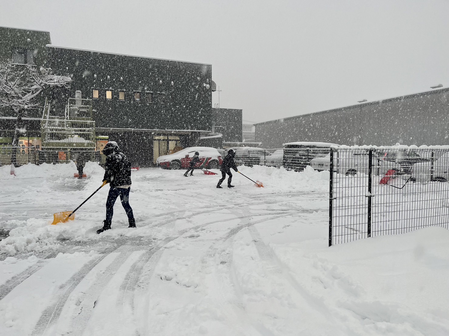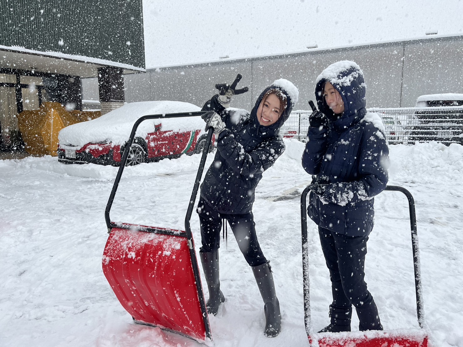 広い駐車場を手作業で除雪します。除雪しても降り続く雪・・・除雪したところがすぐに真っ白になってしまいちょっぴり心が折れそうになりました・・・
