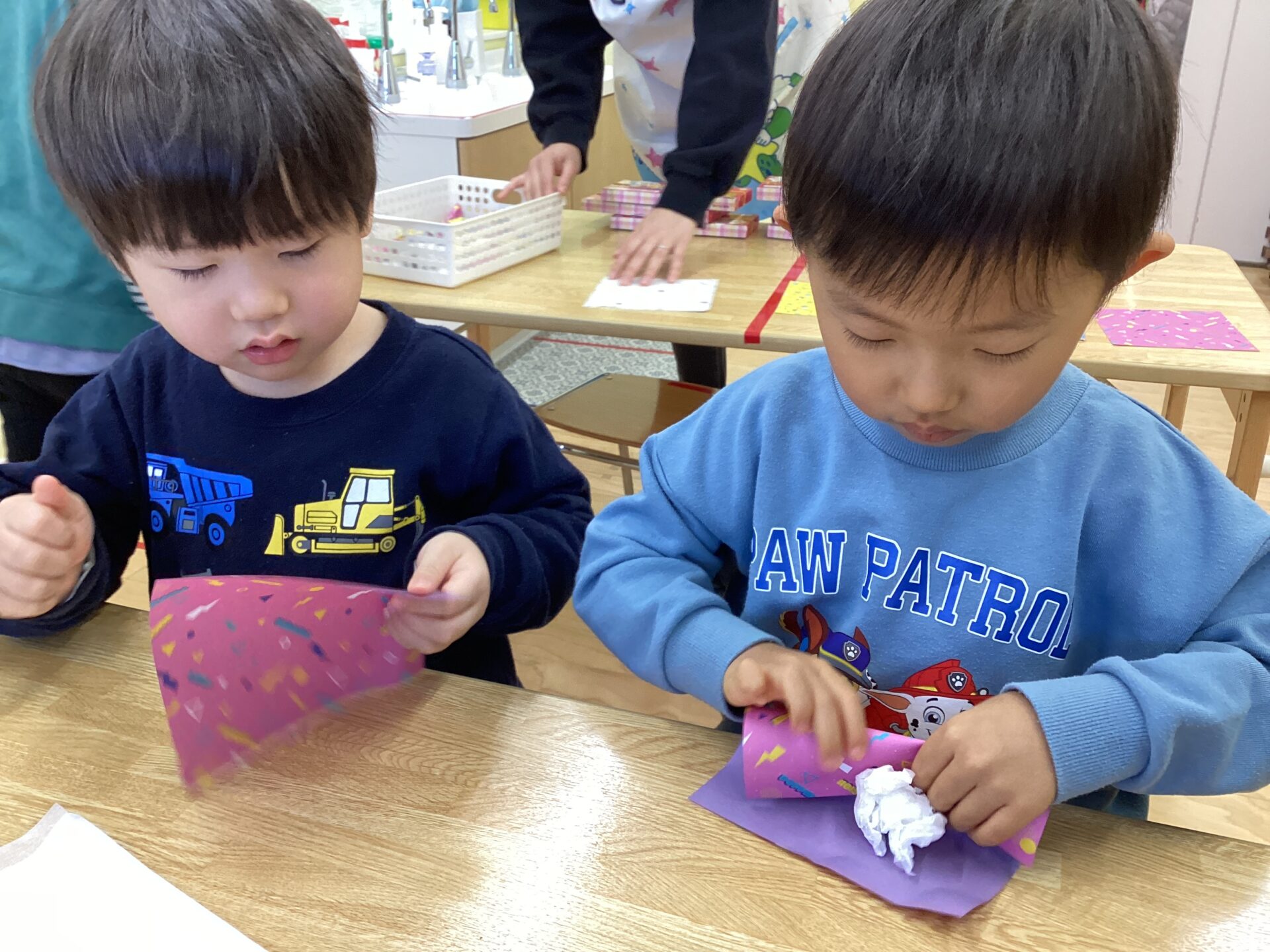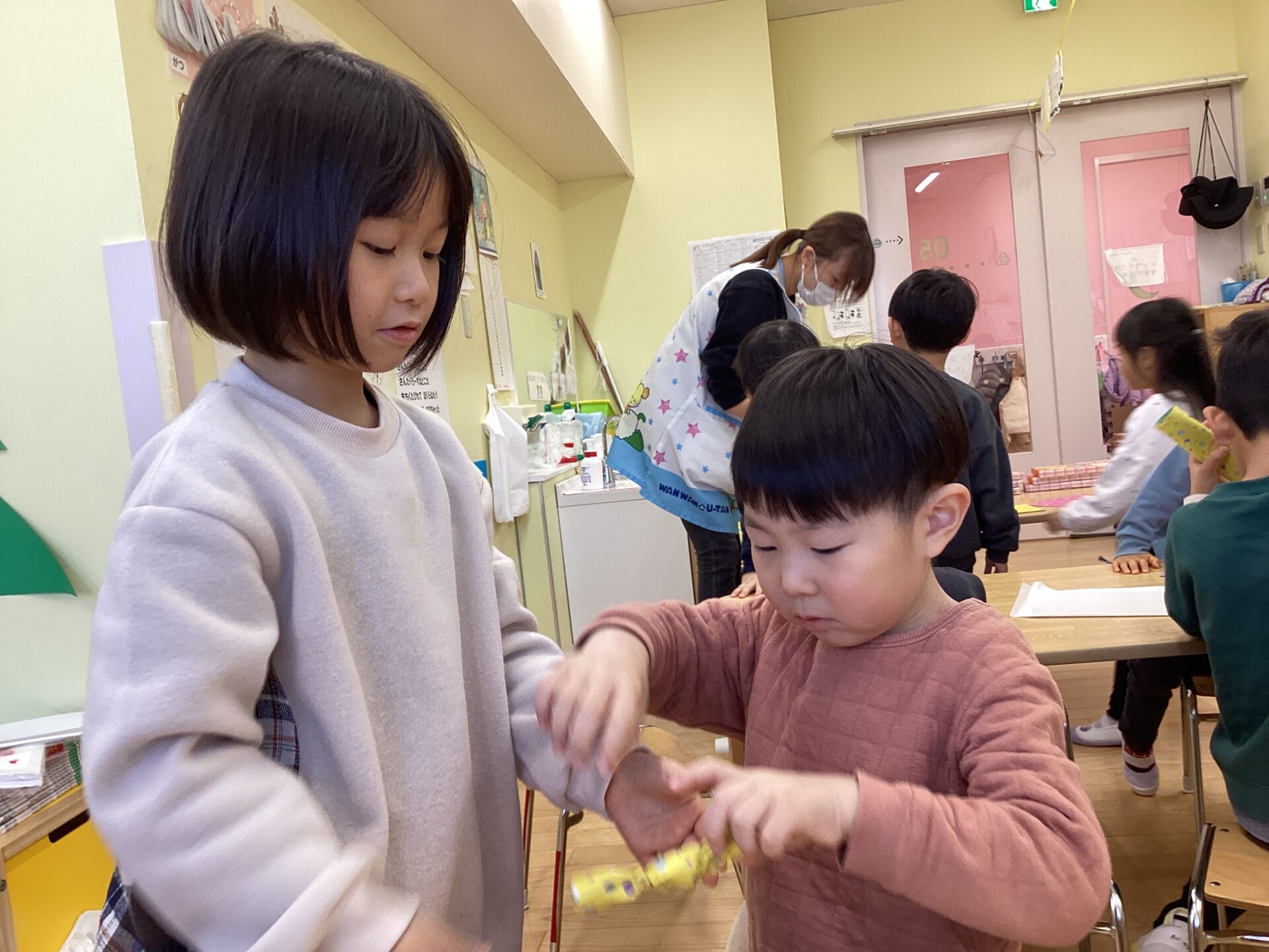 活動前に毎回あかチームのお友だちをお部屋に迎えに行ったり、制作ではテープを切ったり、手を添えて教えたりしていたつきぐみ(5歳児)やそらぐみ(4歳児)の子どもたち❤️そんな優しいつきぐみ・そらぐみさんに対してゆきぐみさんも「手伝って」「ありがとう」「楽しかったよ」と話していましたよ☺️異年齢ならではの関わりが深まった活動となりました😊