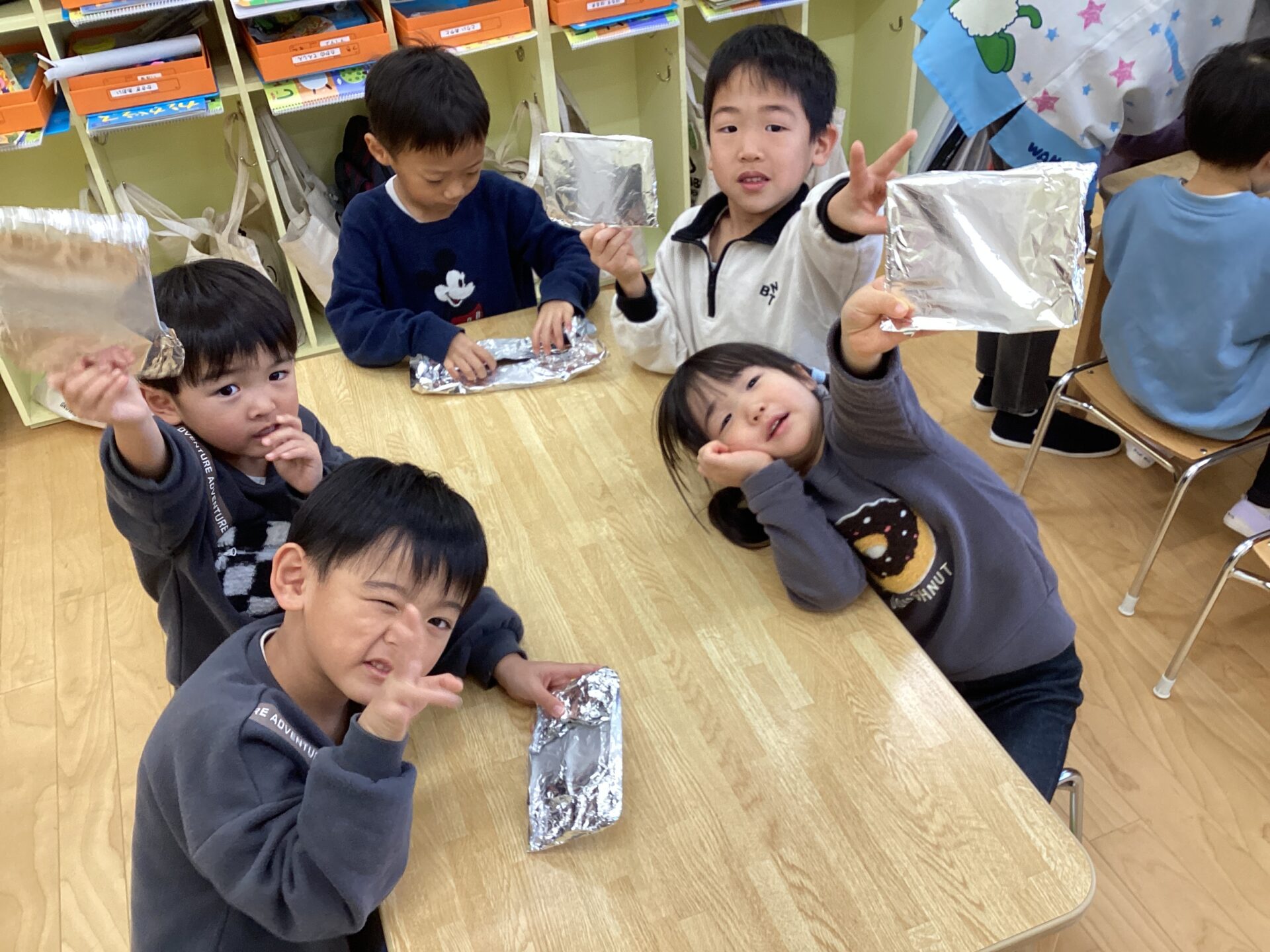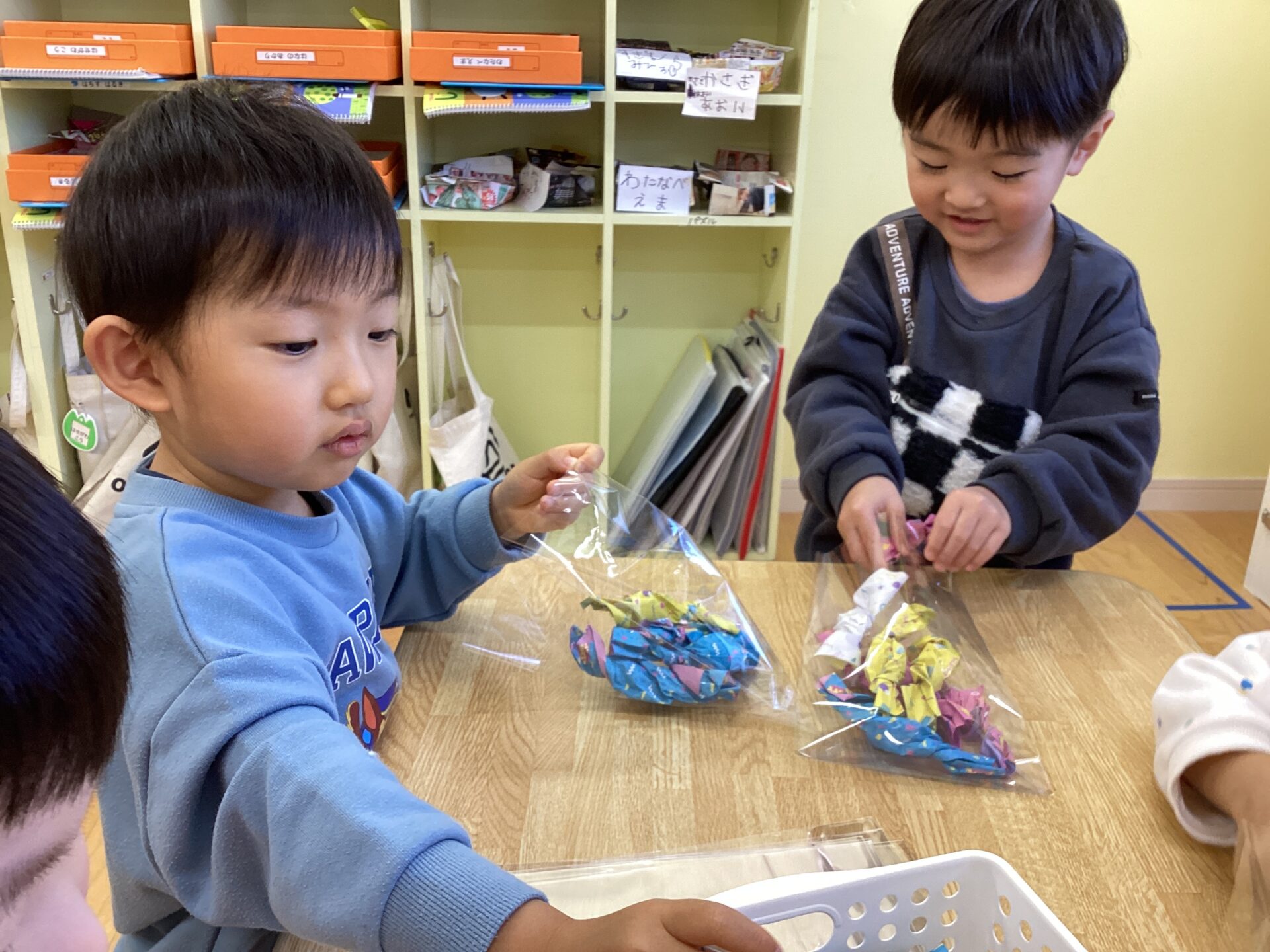 最初は袋に何個も入れていましたが、子どもたちの中で「みんな同じ数の方がみんなが嬉しいね」となり、3個ずつ数を決めて入れました!