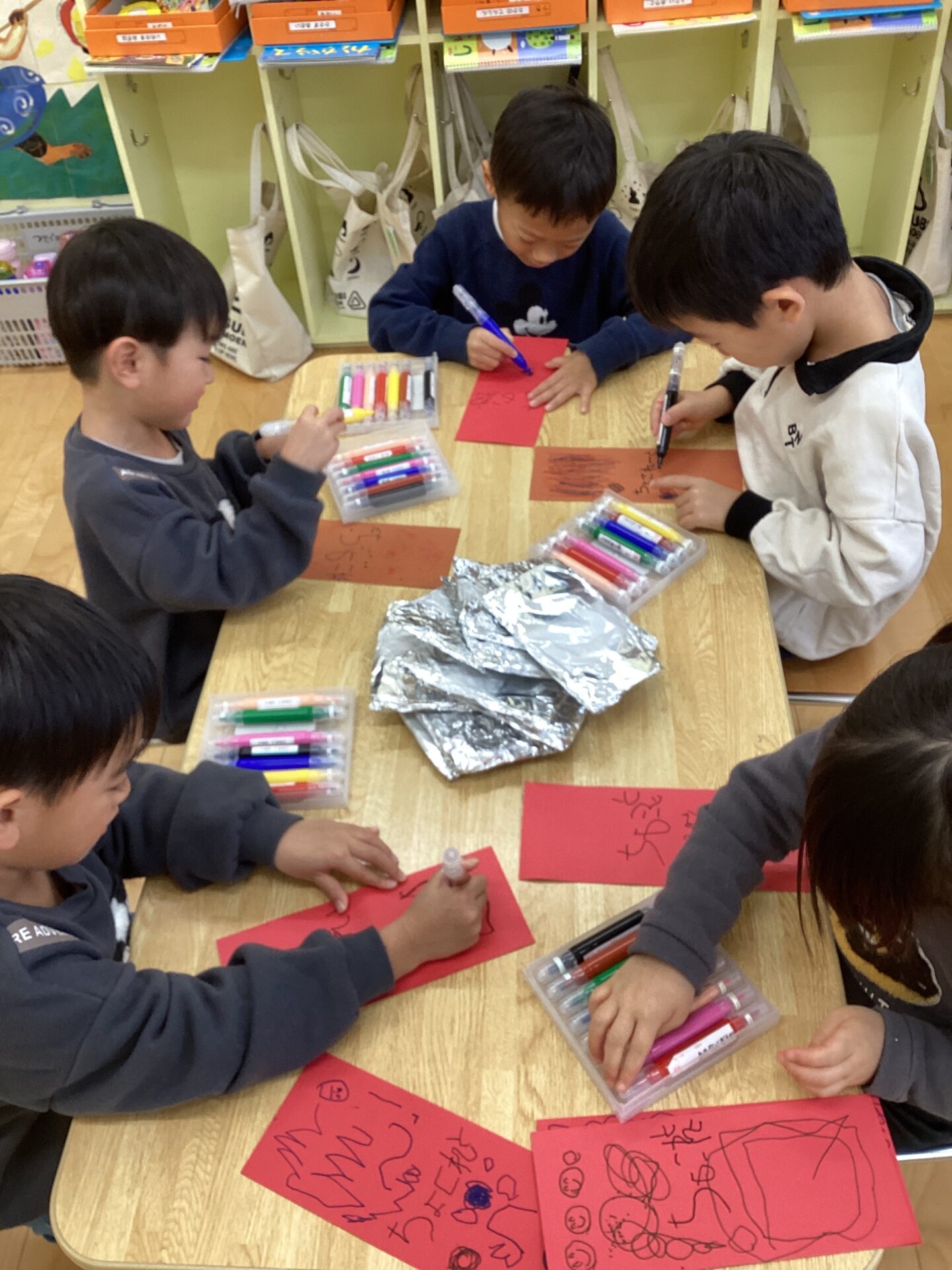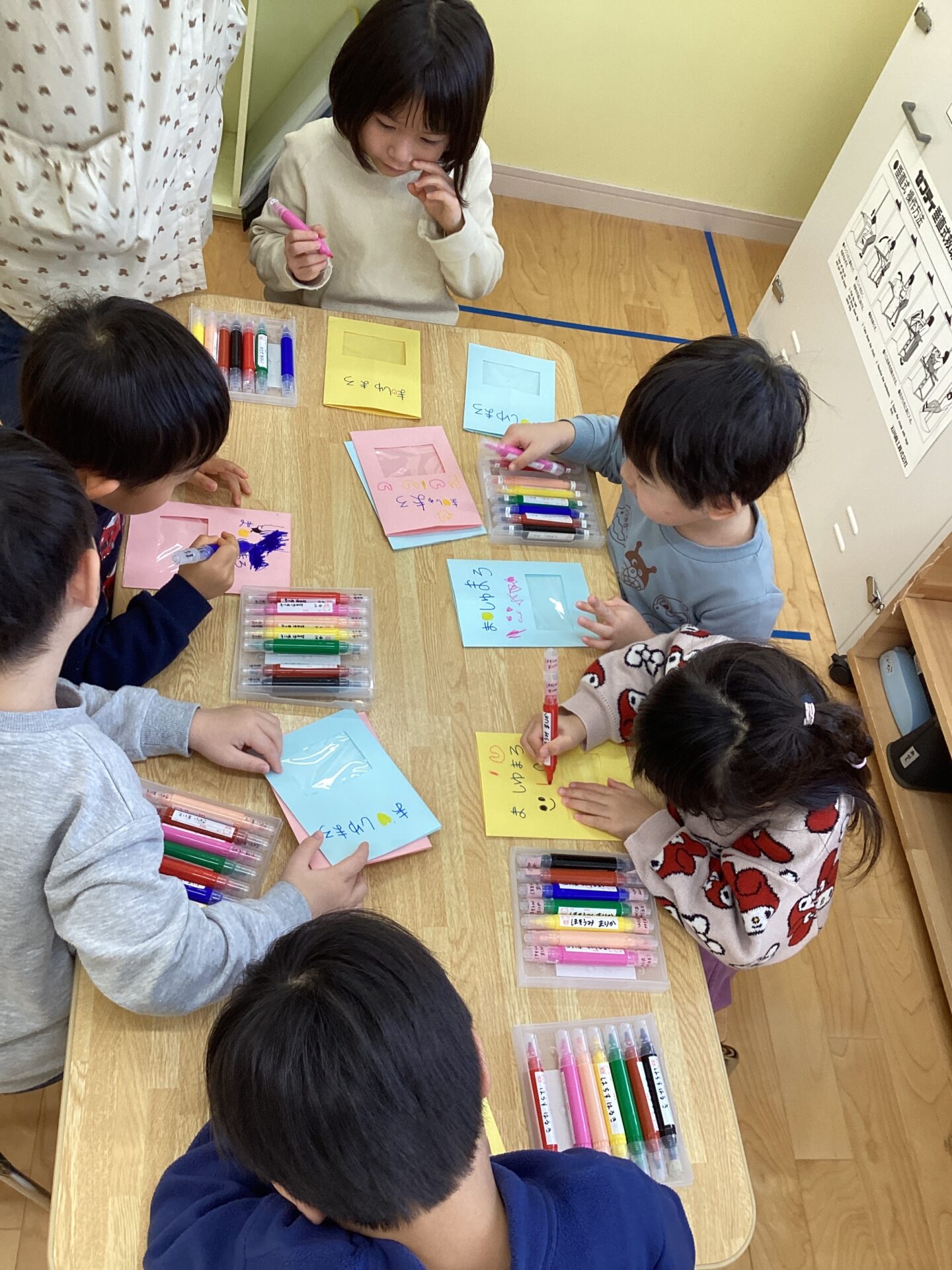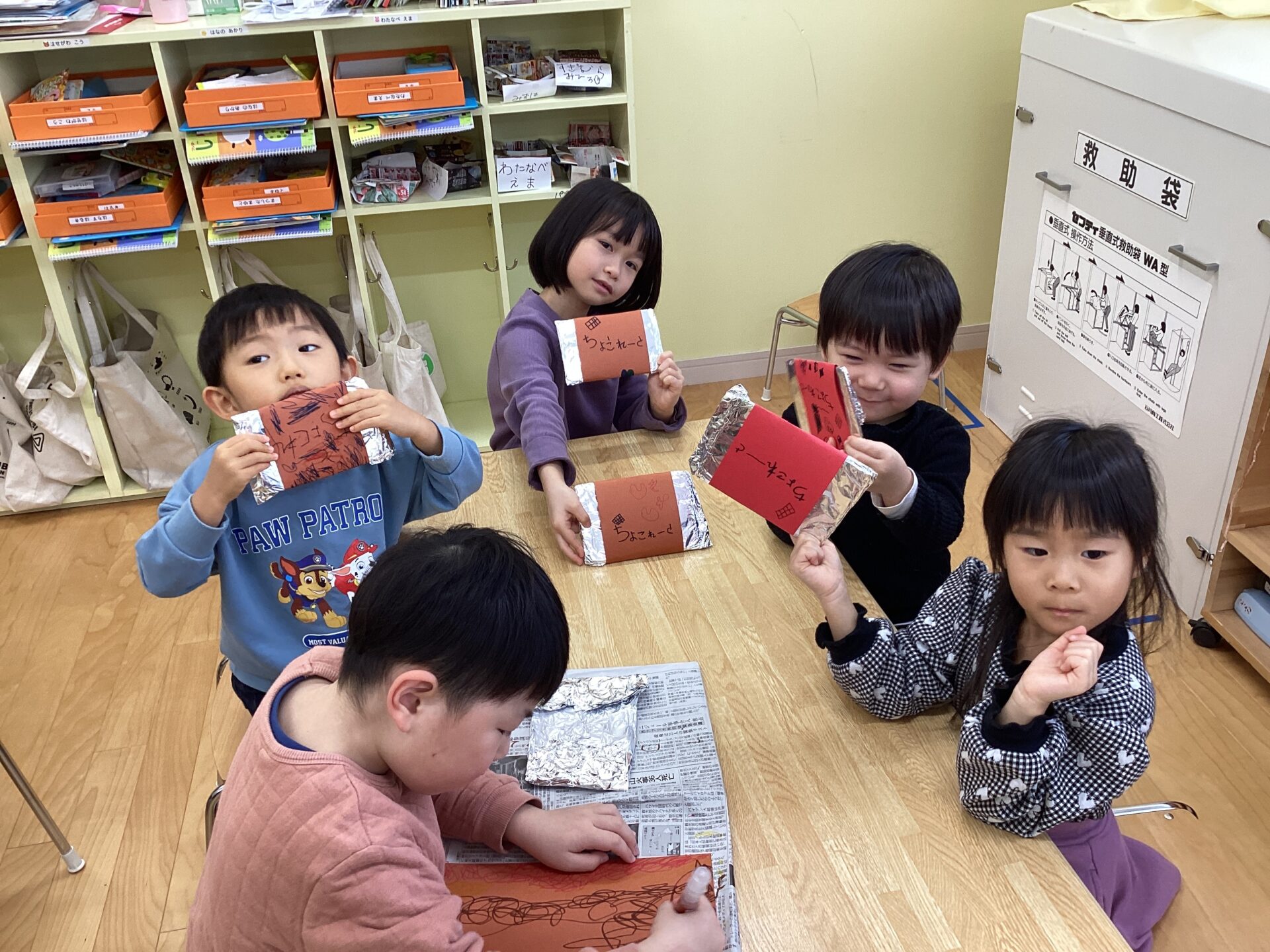 保育者が作った袋に”ましゅまろ”の文字をつきぐみが書き、周りはみんなが好きな模様やイラストを描きました!