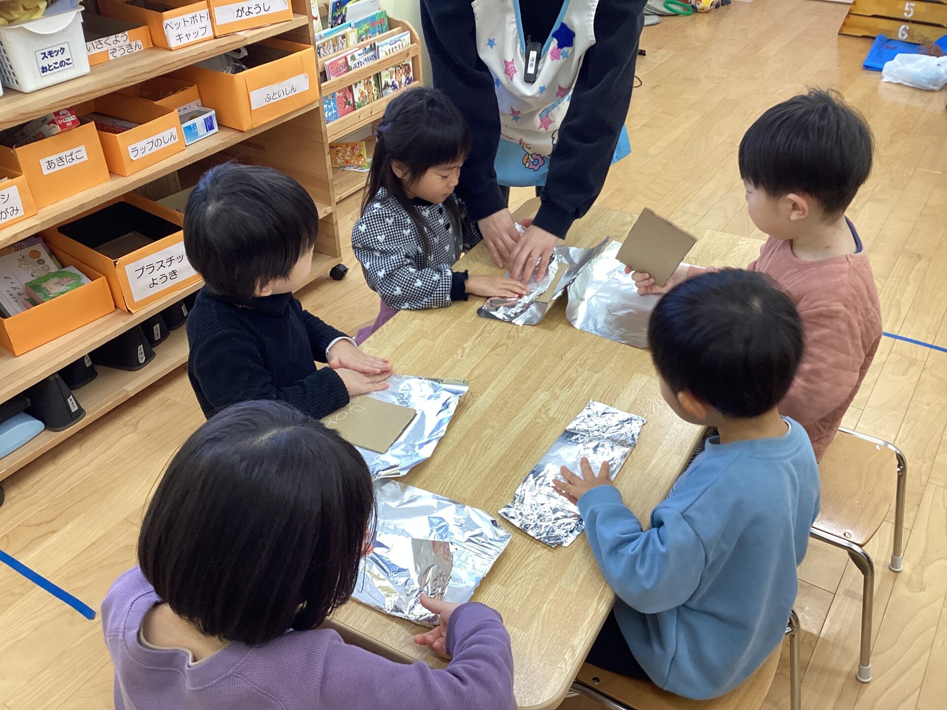 チョコレートの形に切った段ボールを子どもたちがアルミホイルで包んでセロハンテープで止めます。