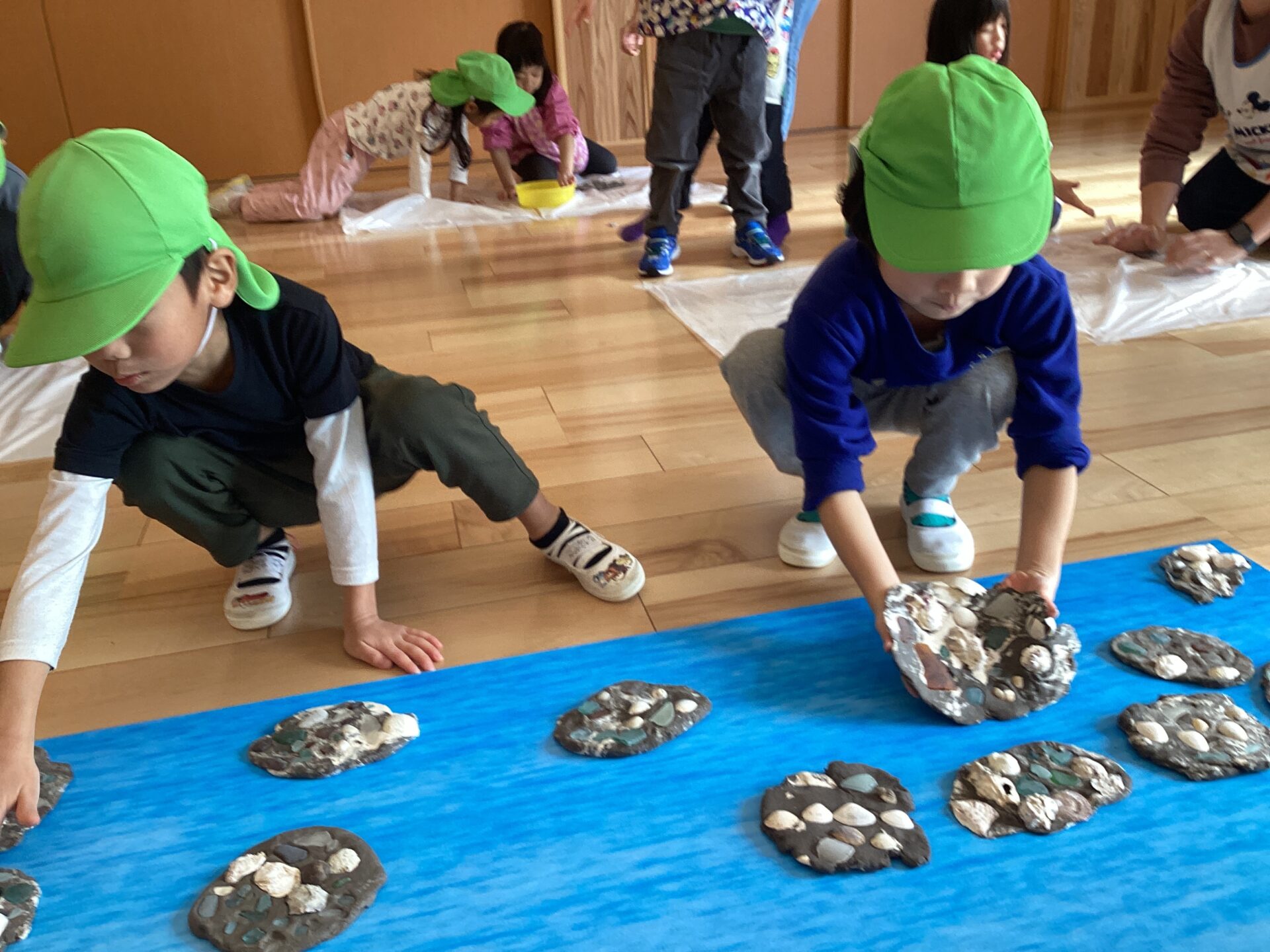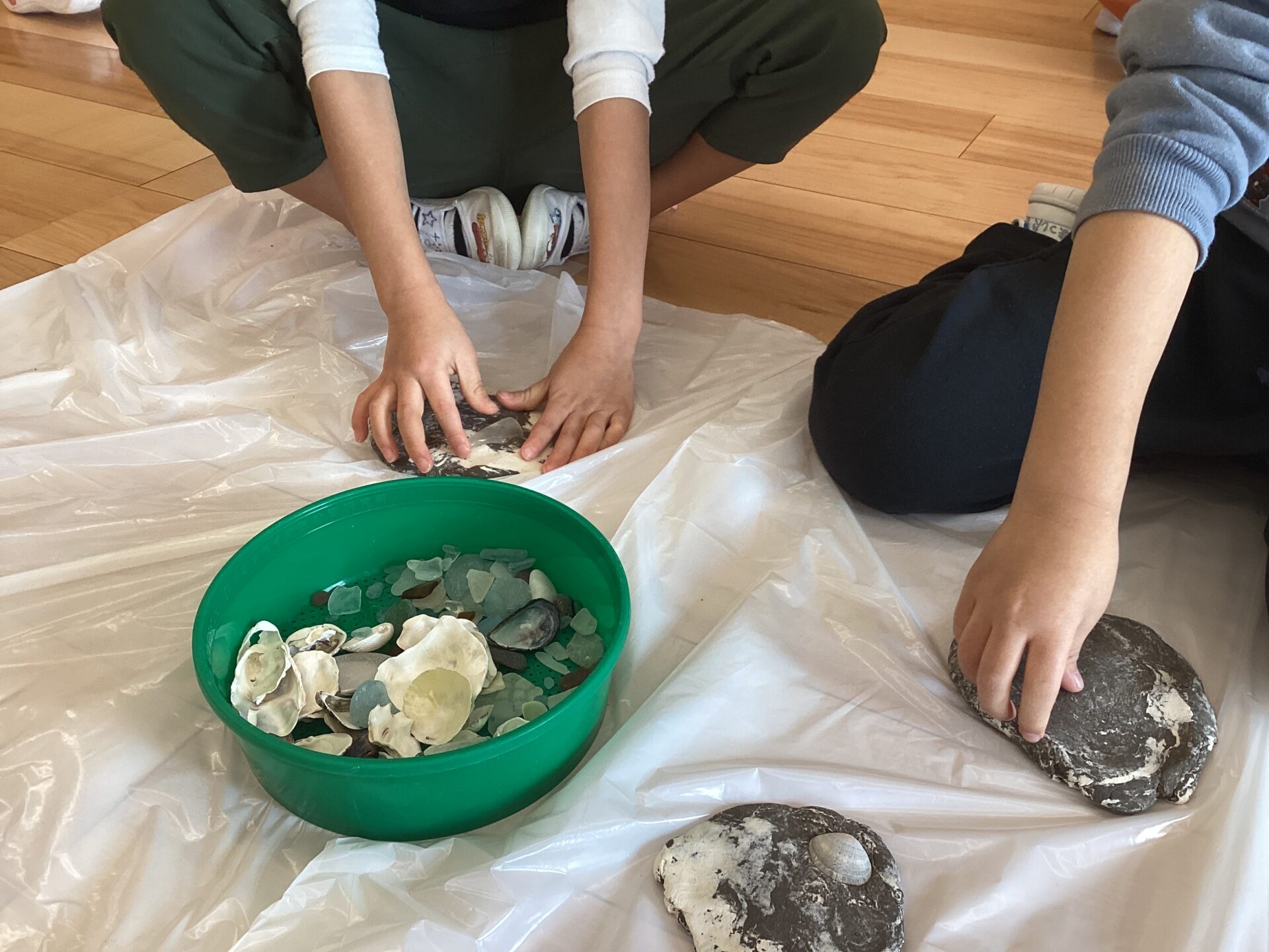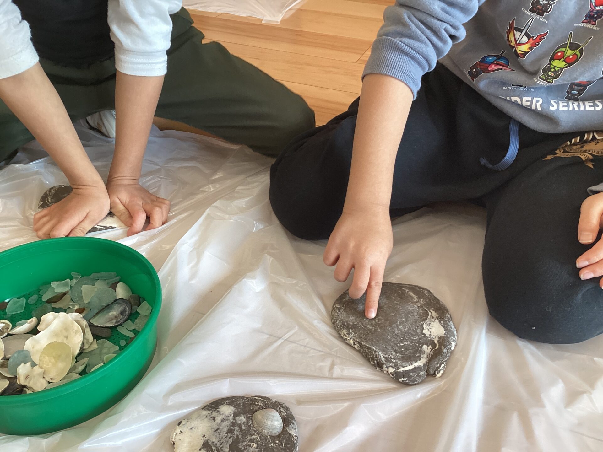 隙間にも小さい物を選んで入れて宝物でいっぱいの岩を作り楽しむ子どもたちでした!