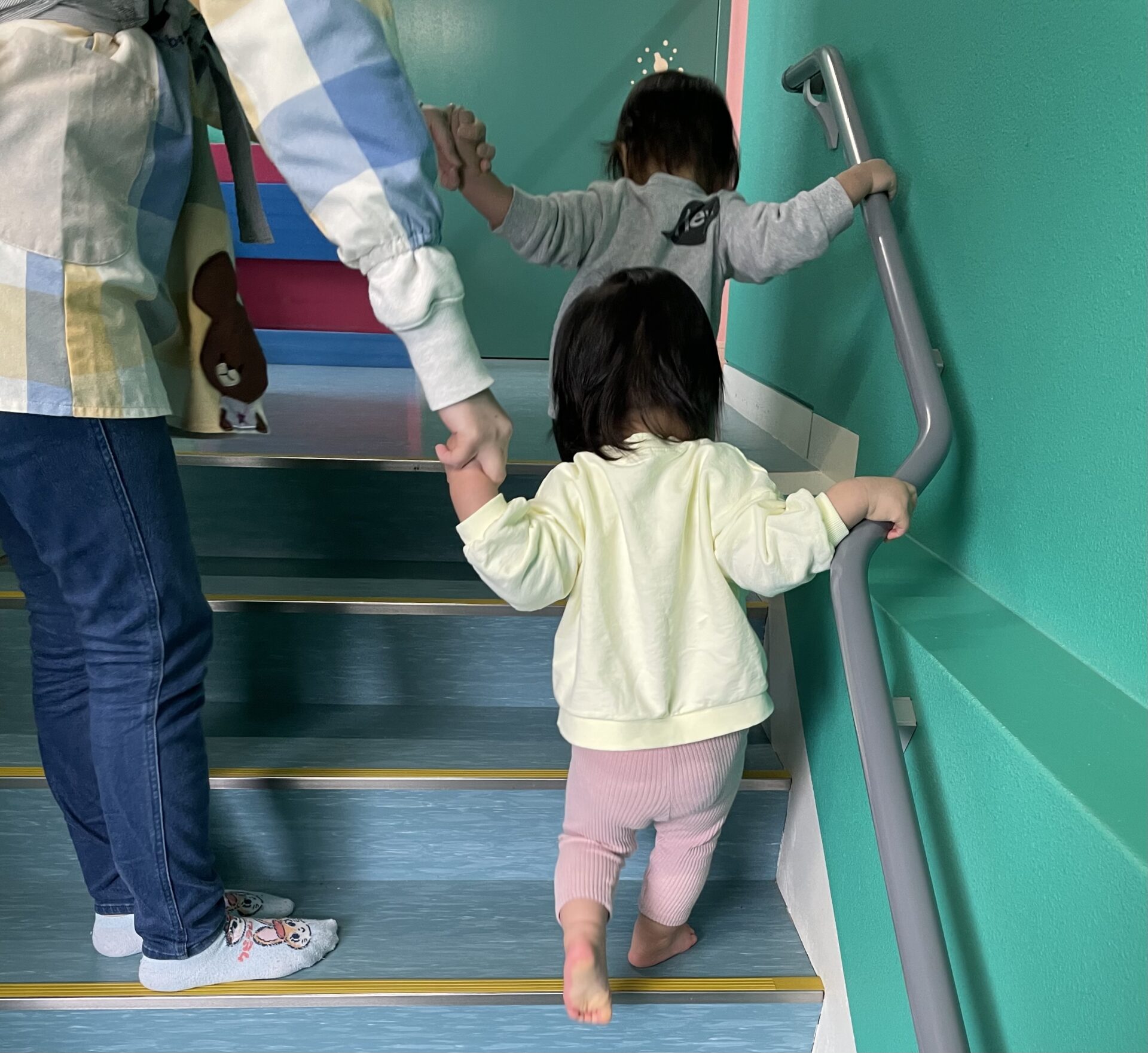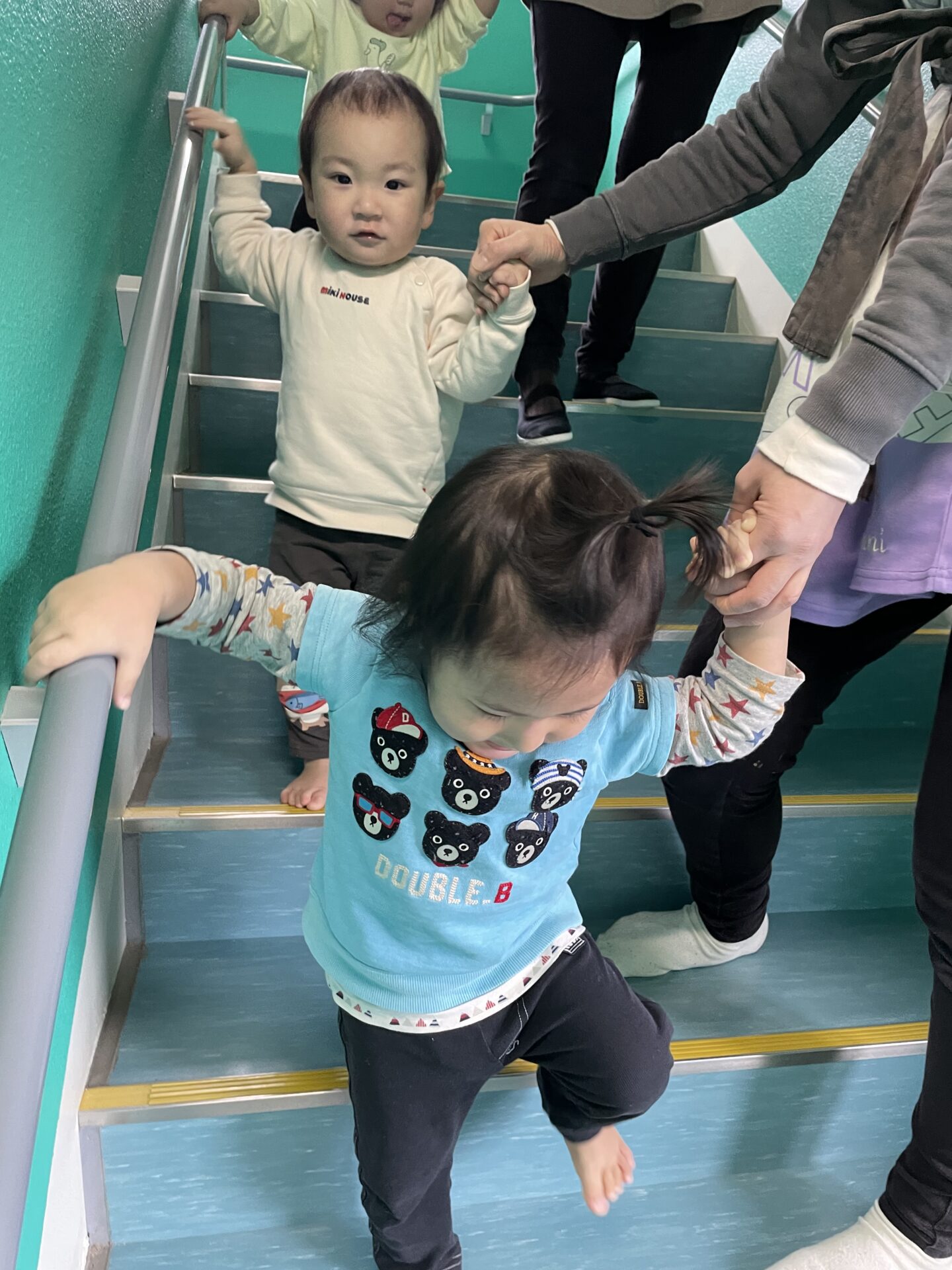お部屋に戻る時も、保育者と手を繋ぎ階段を1段ずつ降りています✨たくさん遊んだ後ですが、階段を降りることも一つの楽しみのようです☺️👏🏻✨