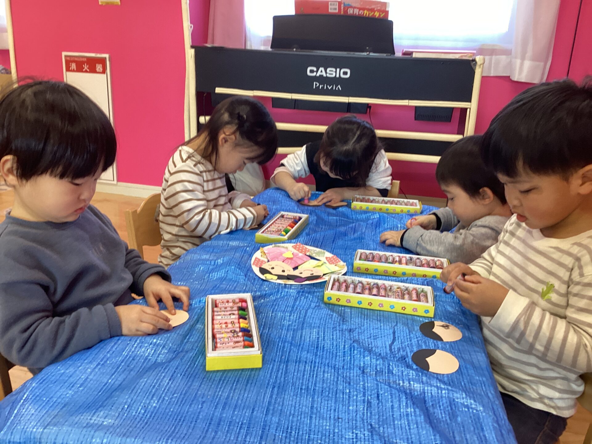 お手本をよく見ながらも自分らしく顔を描いていくにじ組の子どもたち。