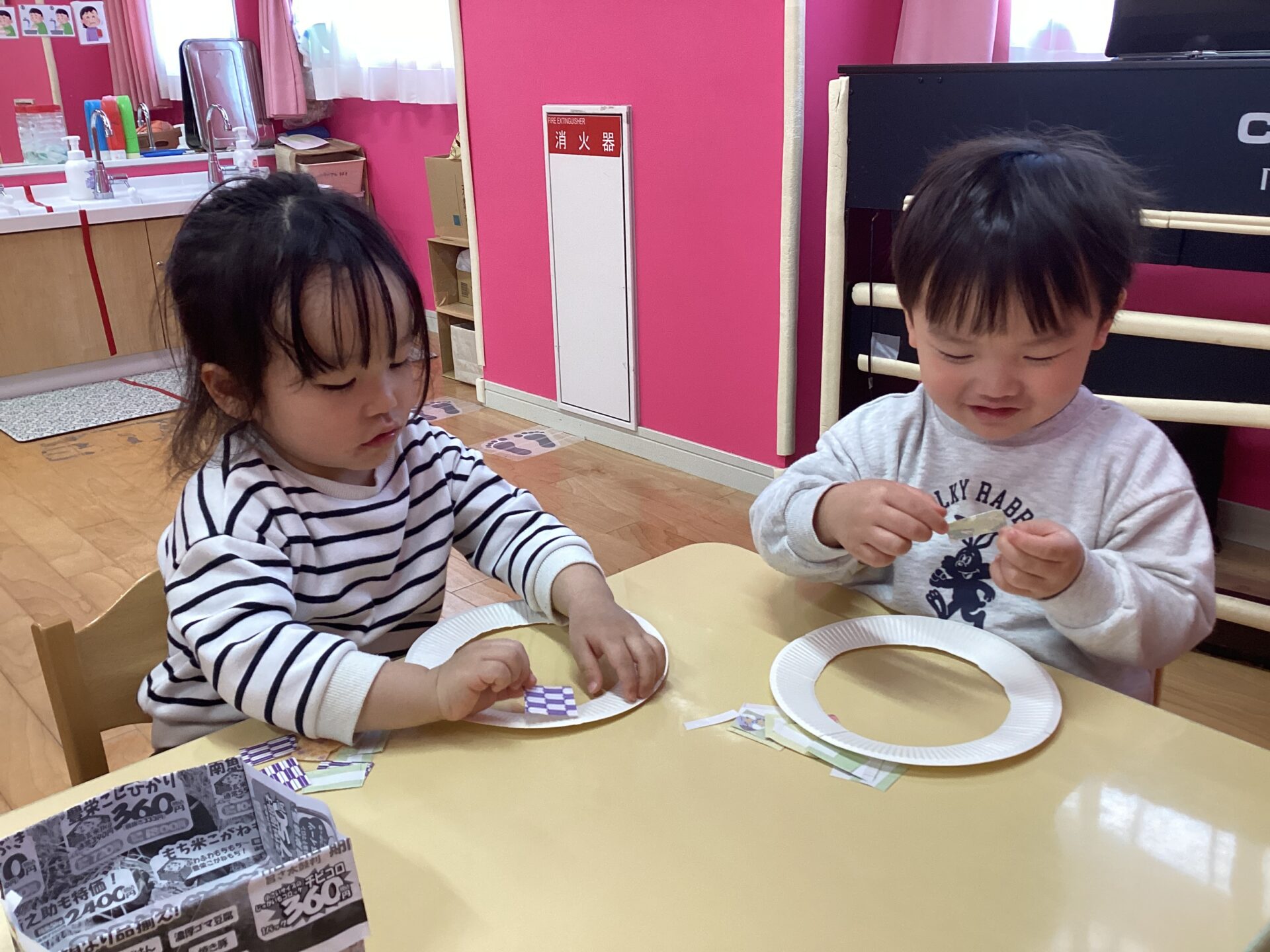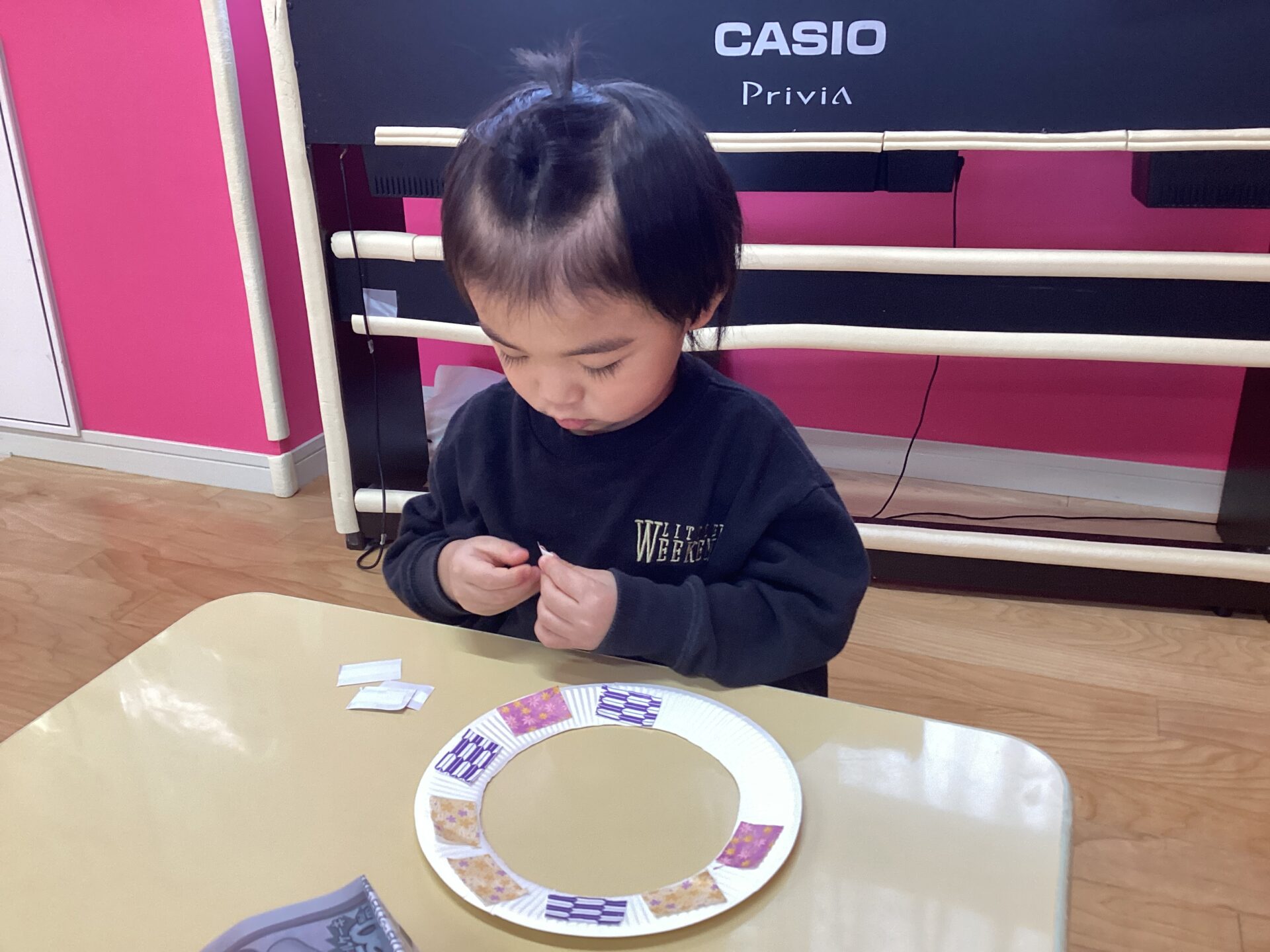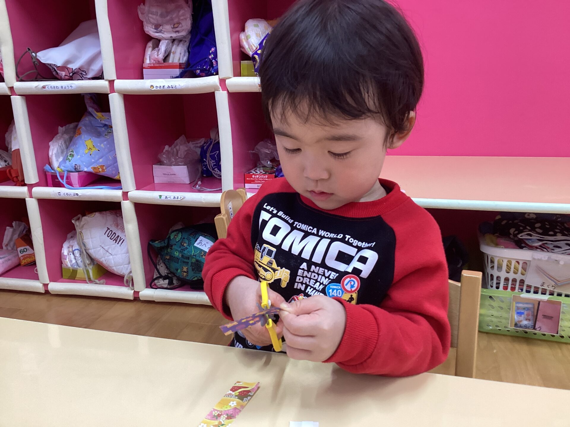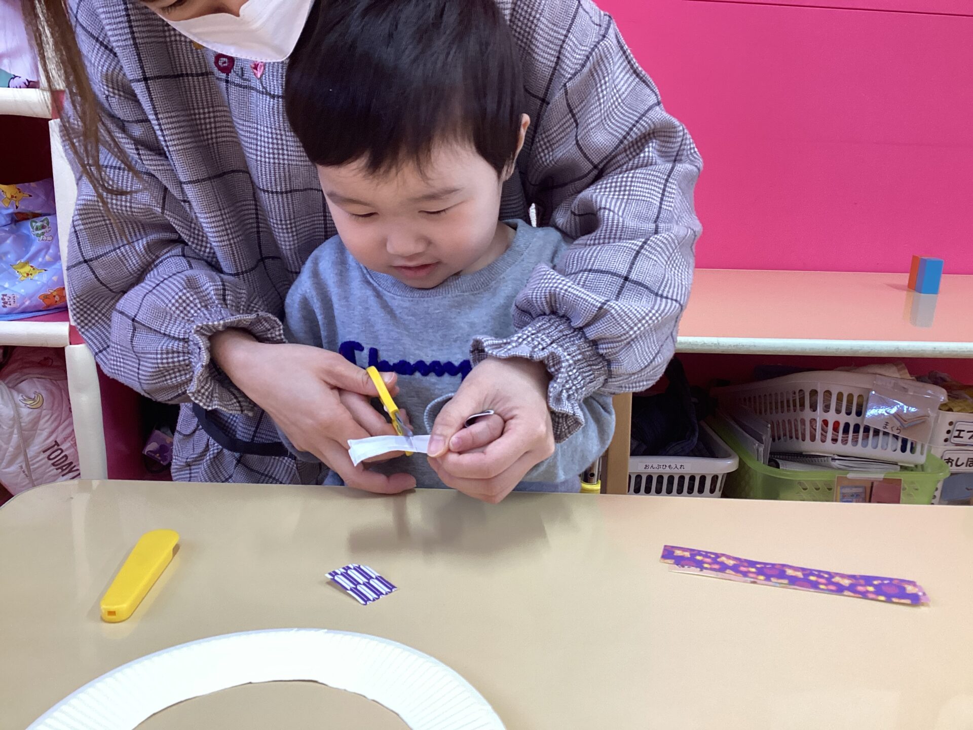 初めは難しくて上手く切れなかった子も、段々とコツを掴んできて、一人で切ることが出来るようになってきていますよ✨まだ少し難しそうにしている子は、後ろから手を支えて一緒に切ったり、千代紙を支えたりしながら、切れるように援助をしています。
