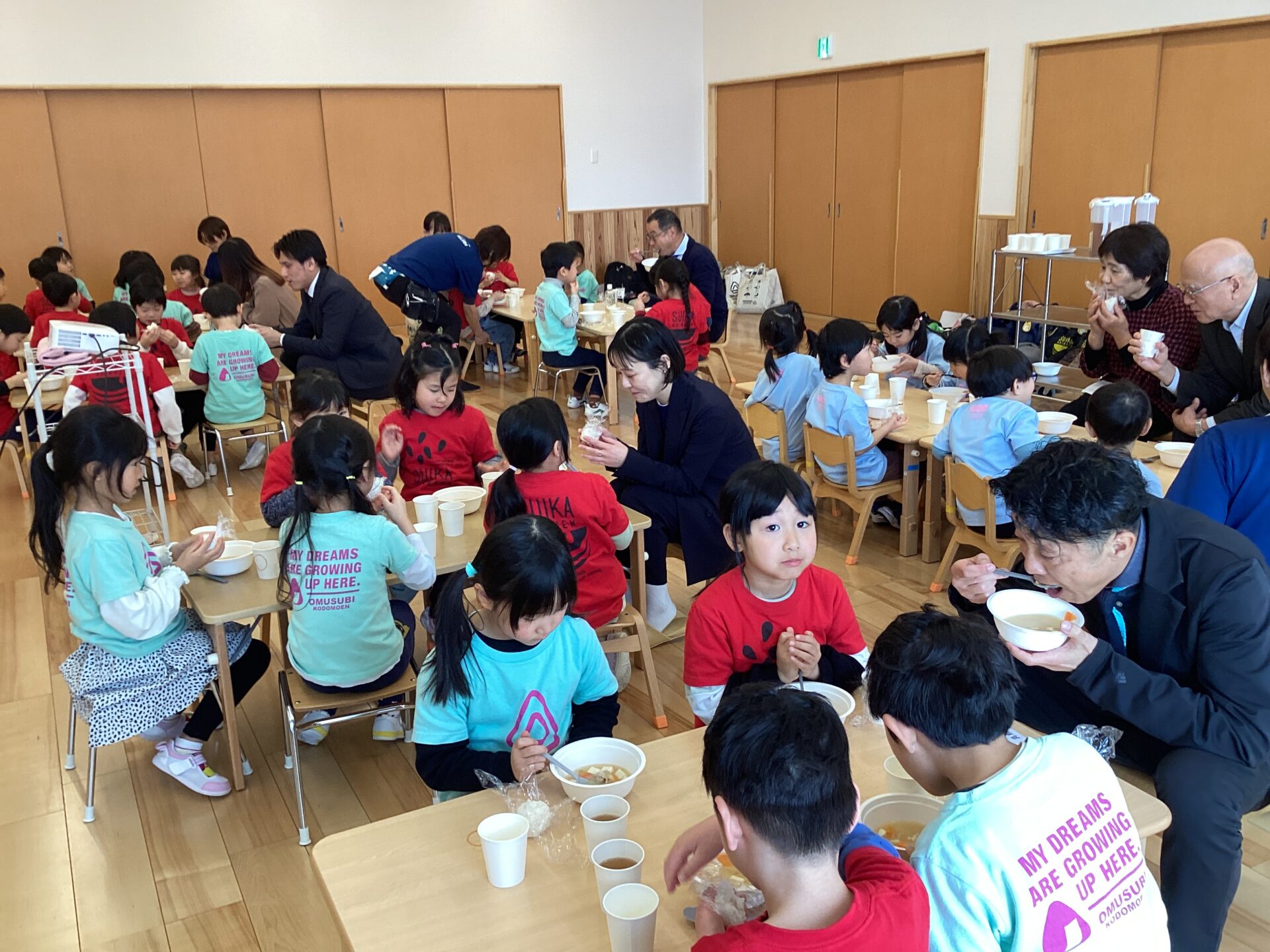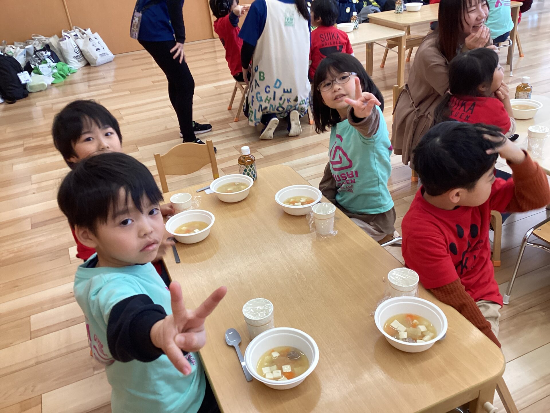 その後は、3園の子どもたちとお客様みんなでおにぎりと豚汁をいただきました。