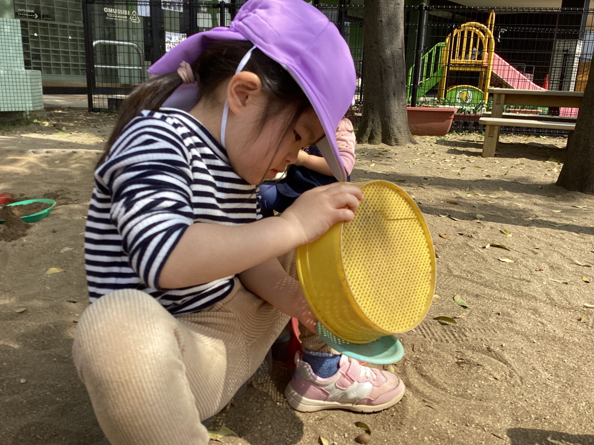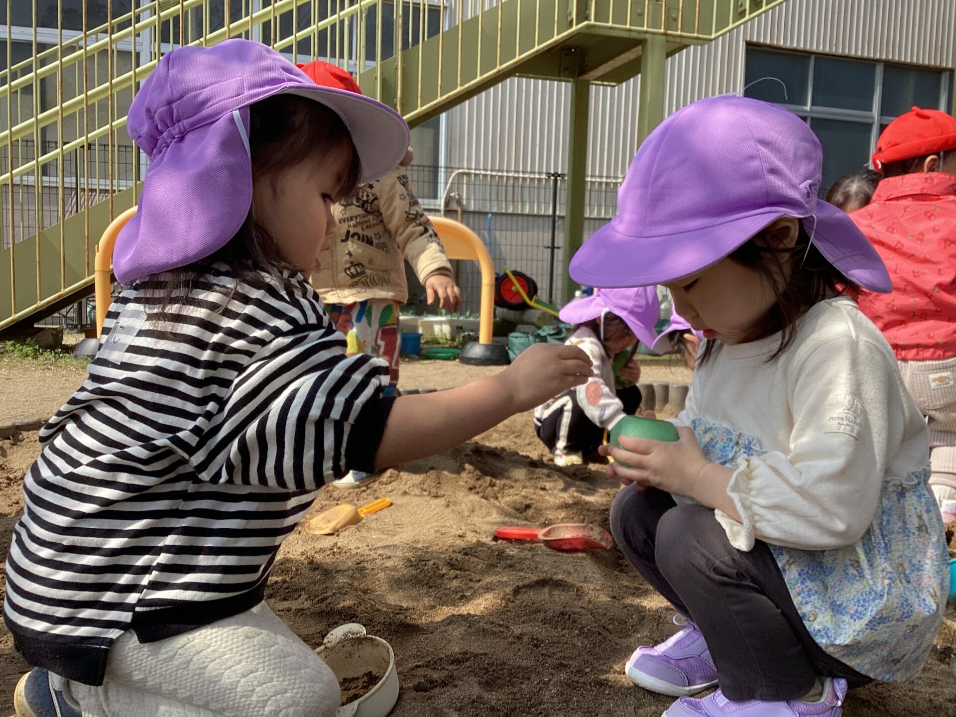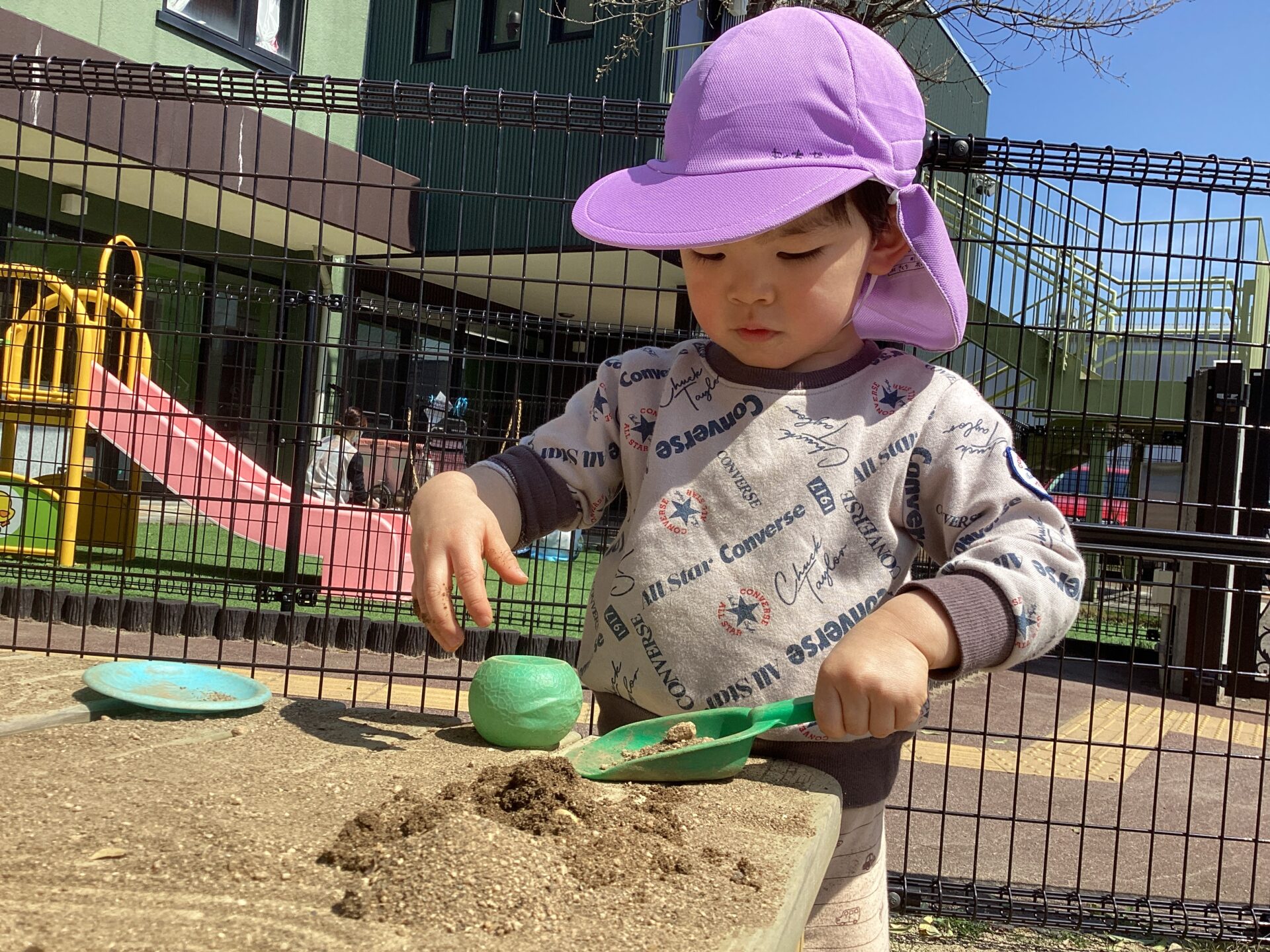 園庭に出るとすぐにスコップとカップを持って砂を入れ、おままごとが始まります✨