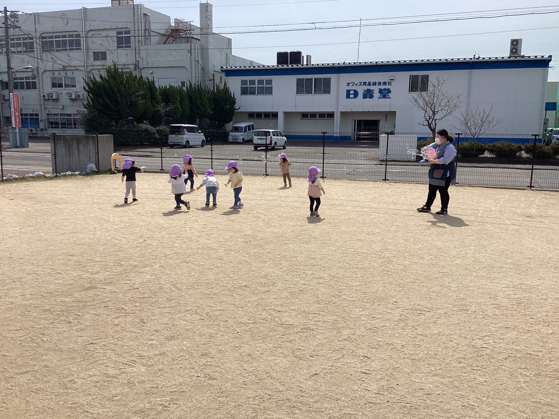 保育者がしゃぼん玉を吹くと「わ~!!!」「きれ~い!!!」と、