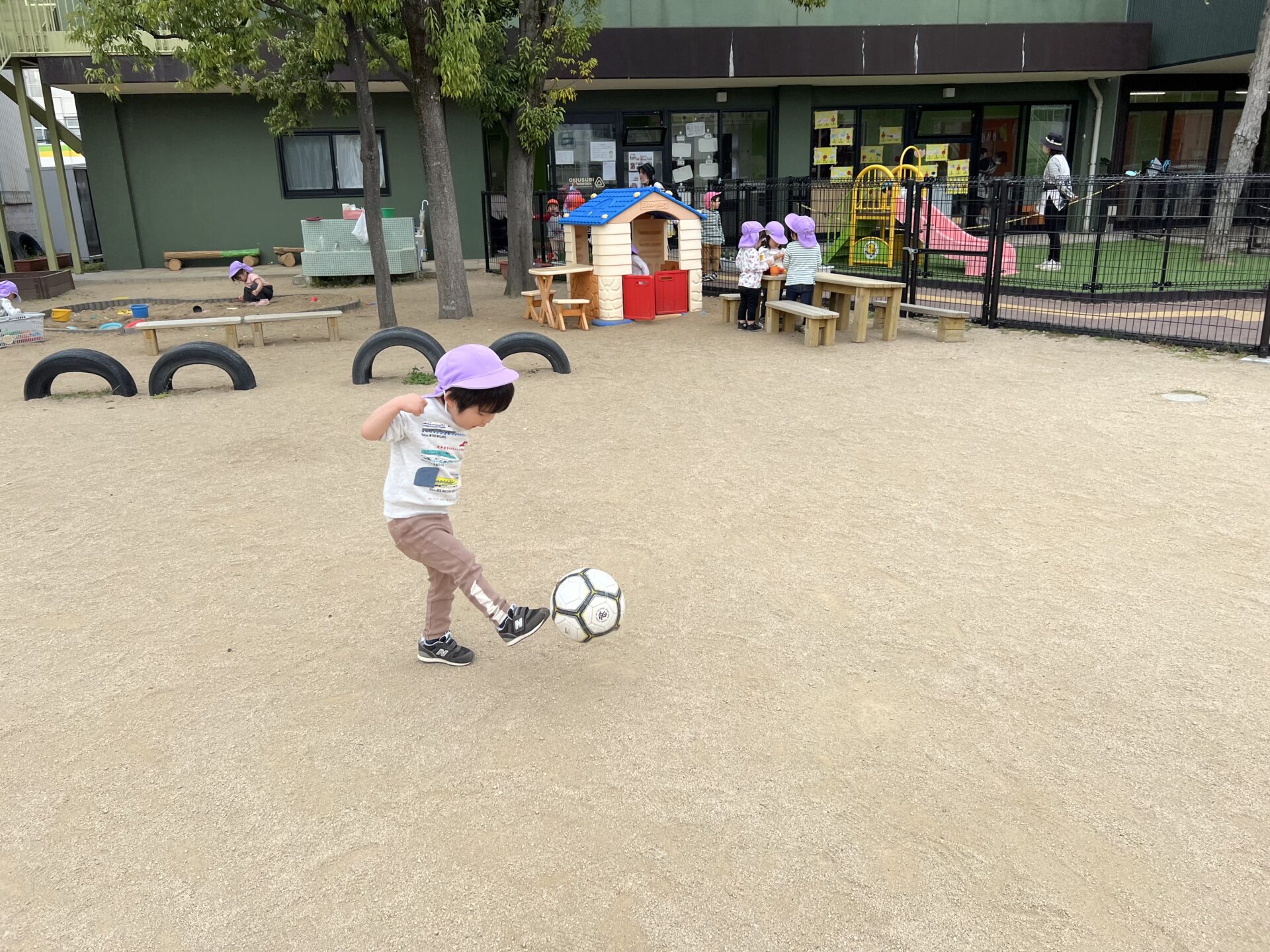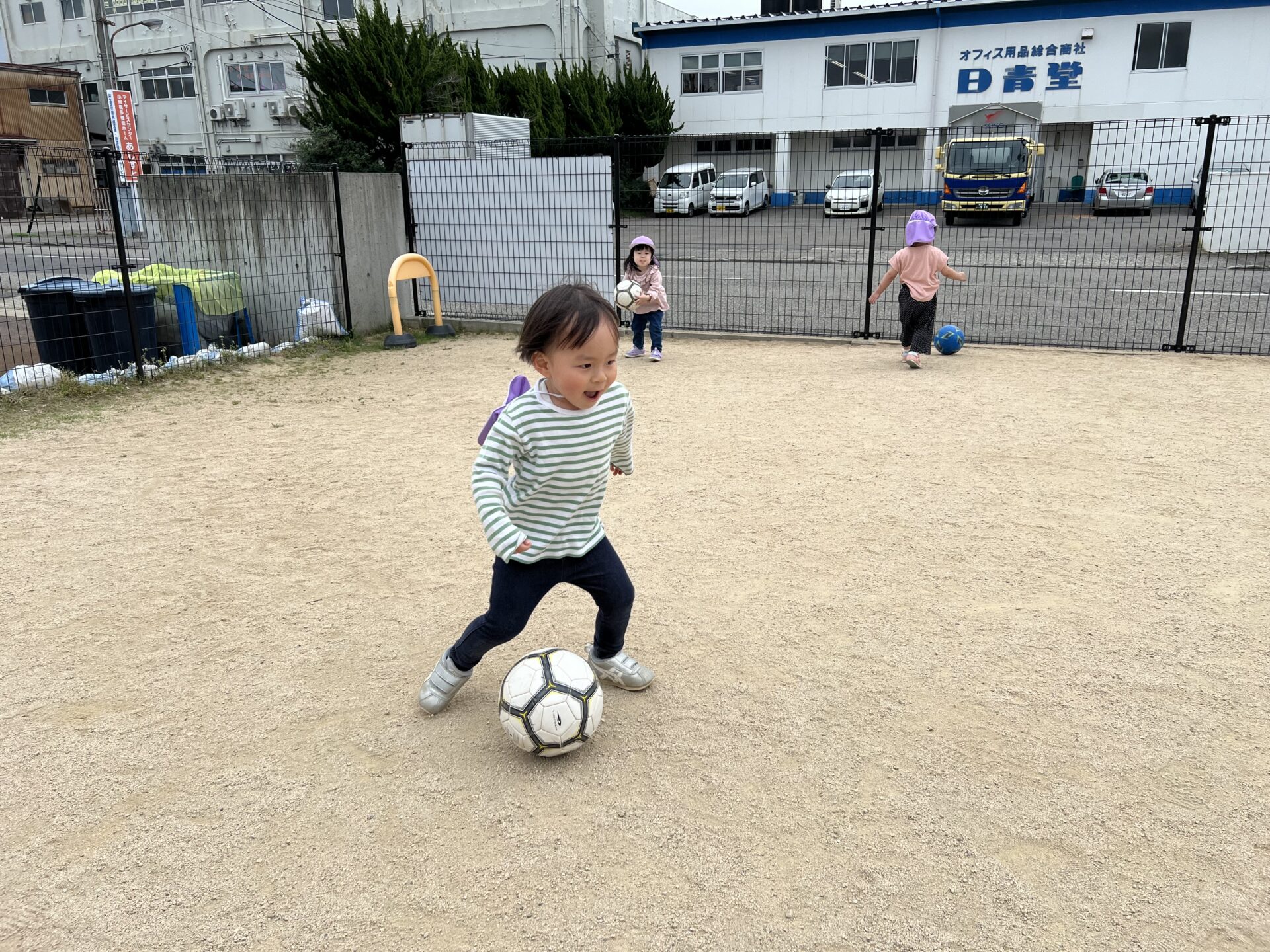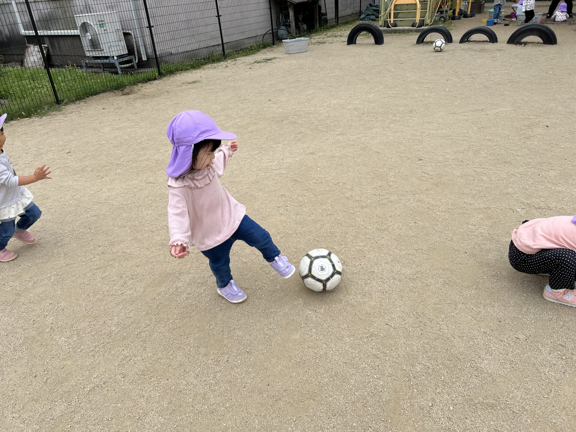 保育者が「キックするんだよ!」とボールを蹴ってみせると、
