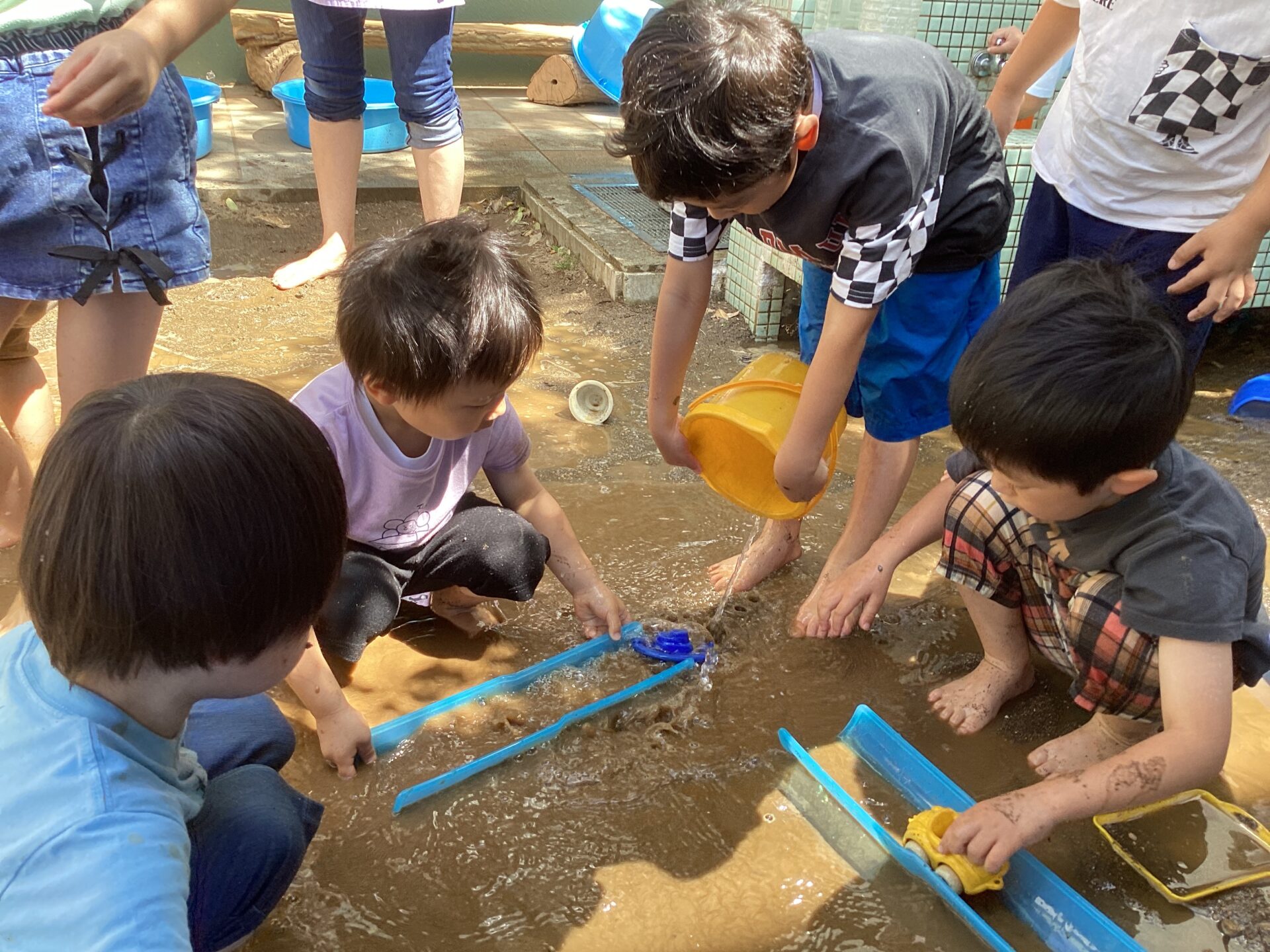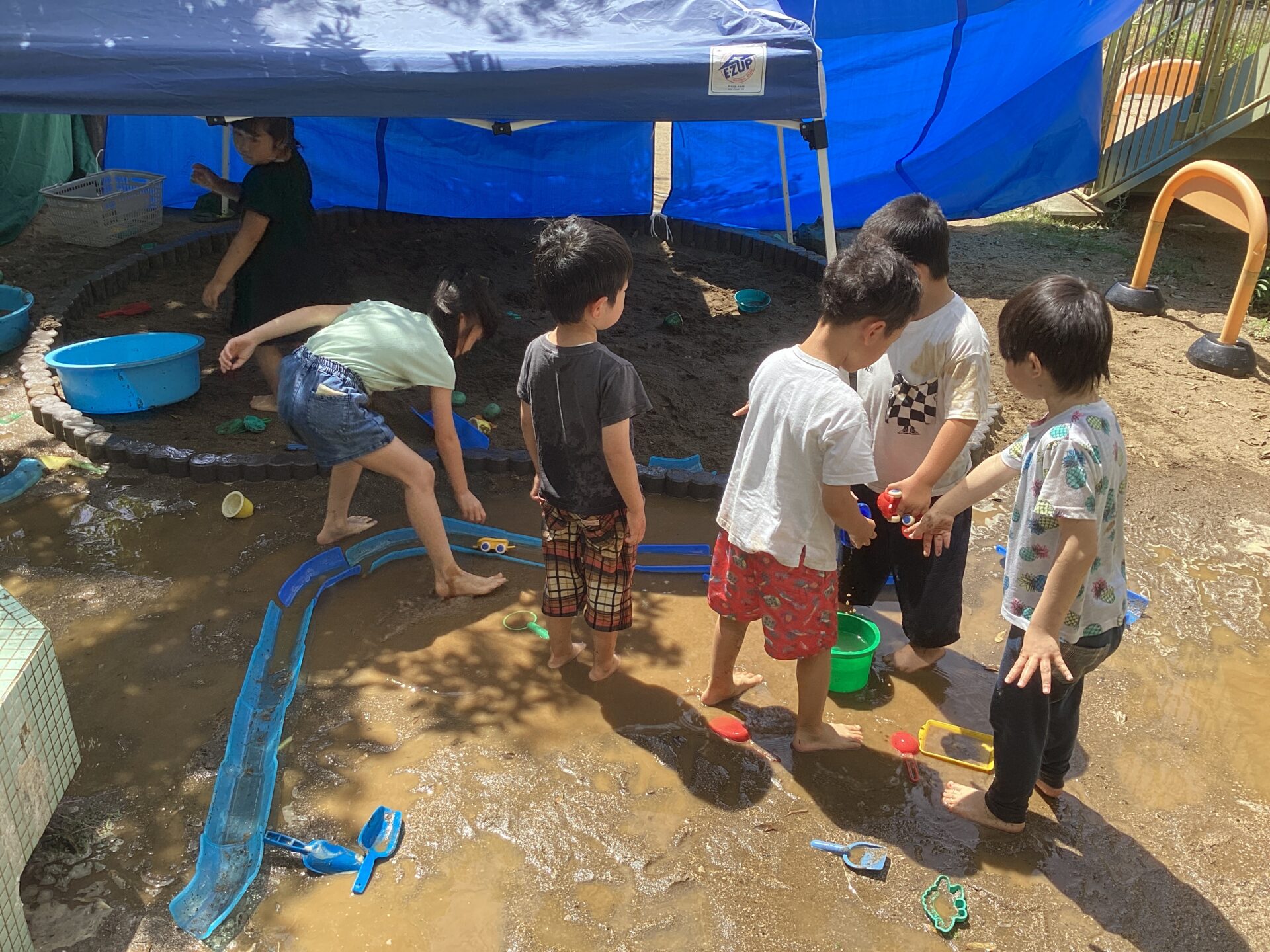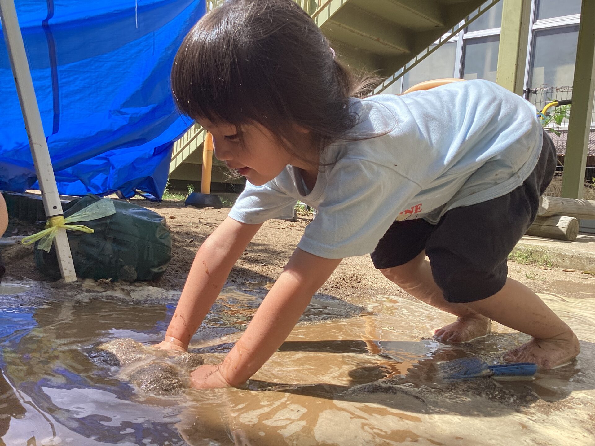 少し汗ばむ陽気の中、水と砂がまじりあってできる泥の感触がなんとも心地よく、子どもたちは夢中になって遊んでいました。お友だちと一緒にどろんこを楽しむ子もいれば、一人でじっくり集中して遊ぶ子もいます。今日は、おむすびクス(ダンス教室)もあったため3.4.5歳児が混合で遊ぶ中で、自然と異年齢で関わる姿もみられ大盛況のどろんこ遊びでした😊