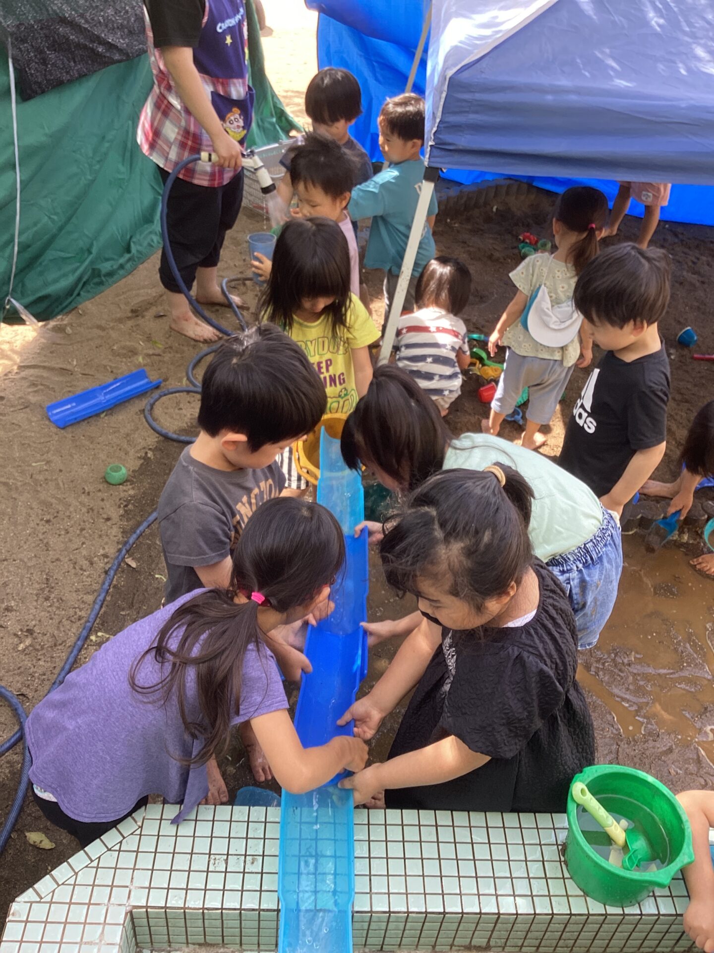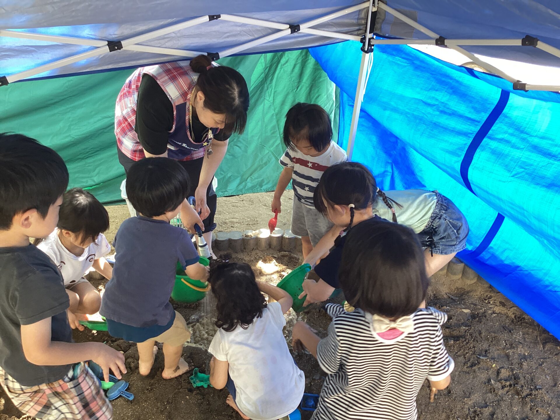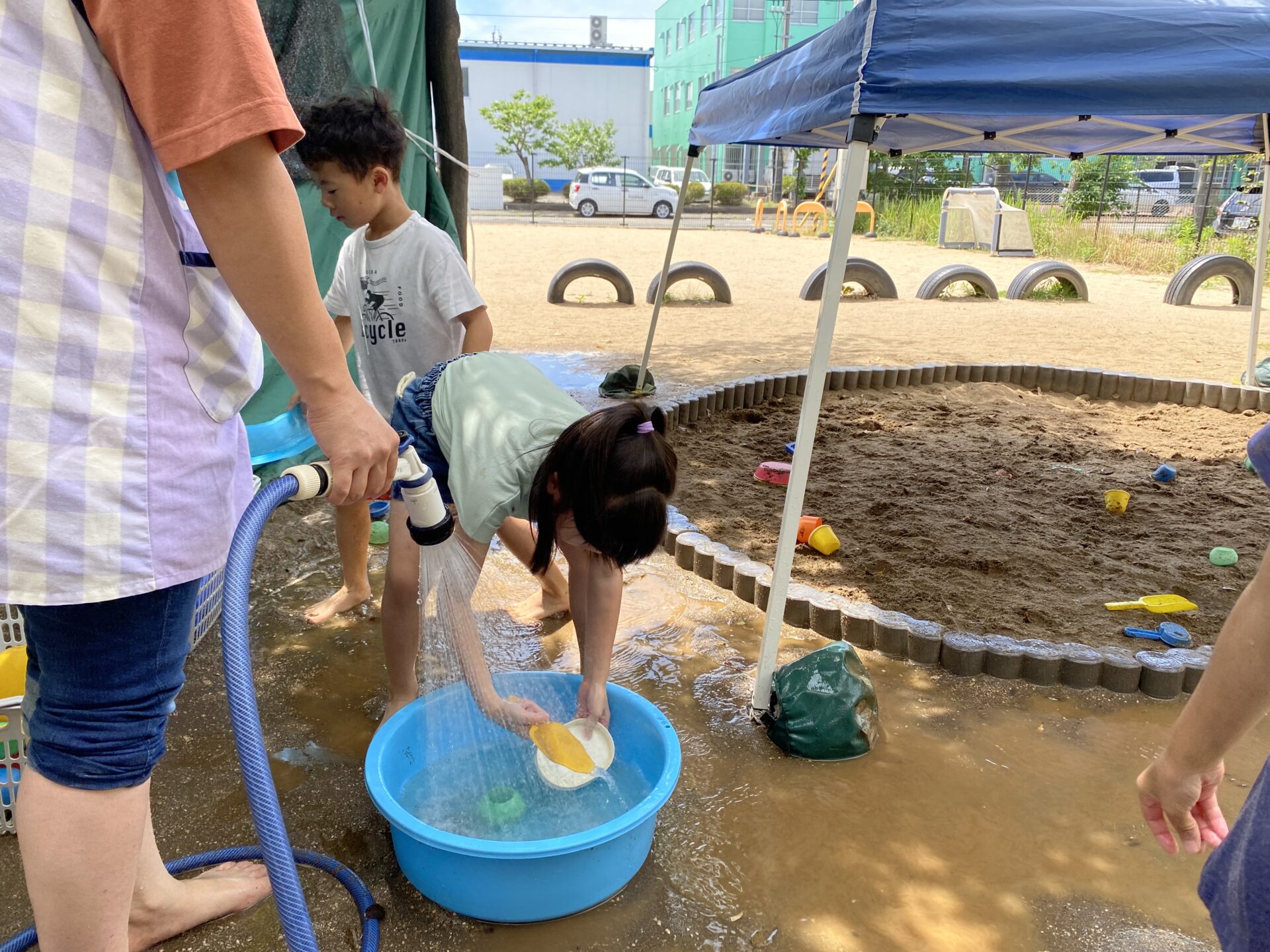 少し汗ばむ陽気の中、水と砂がまじりあってできる泥の感触がなんとも心地よく、子どもたちは夢中になって遊んでいました。お友だちと一緒にどろんこを楽しむ子もいれば、一人でじっくり集中して遊ぶ子もいます。今日は、おむすびクス(ダンス教室)もあったため3.4.5歳児が混合で遊ぶ中で、自然と異年齢で関わる姿もみられ大盛況のどろんこ遊びでした😊